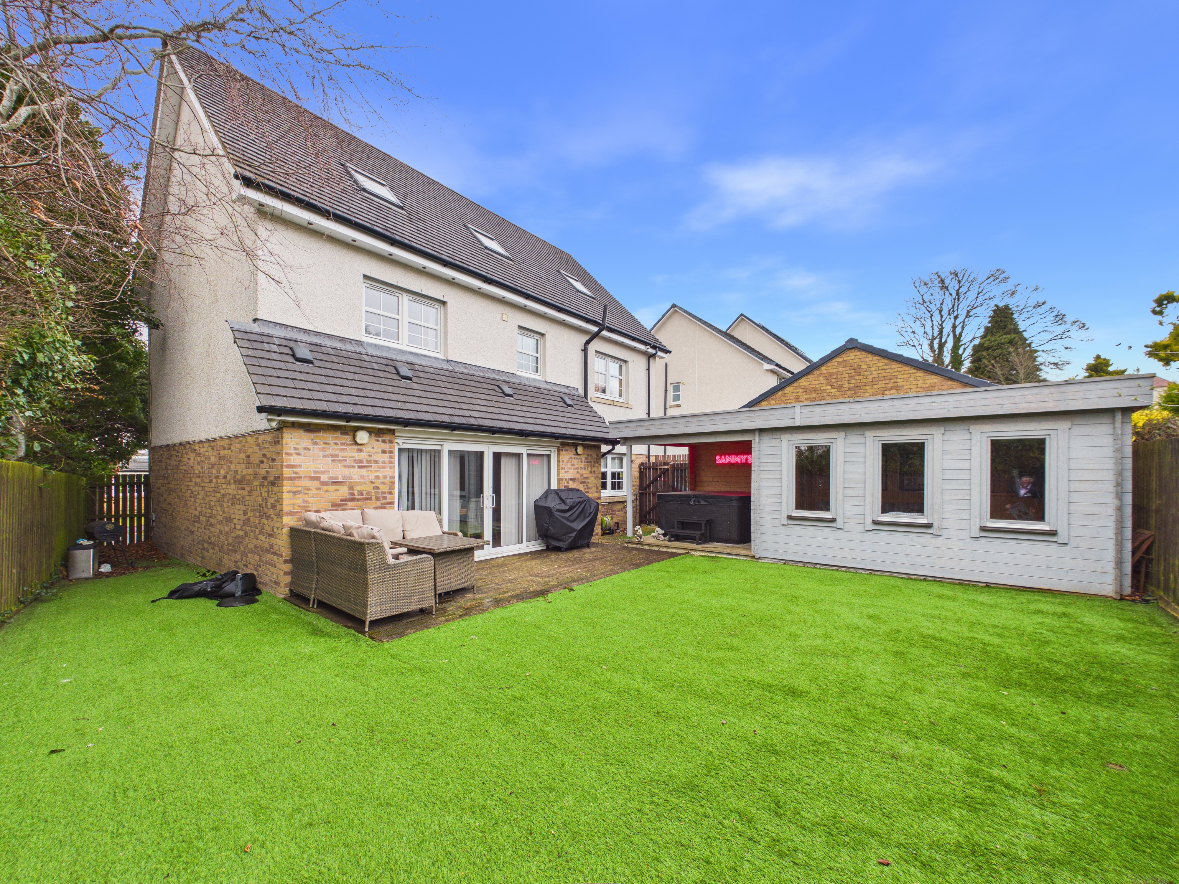 Externally there are gardens to the front and rear with a monobloc driveway providing ample off street parking and giving access to the double garage with electric doors at the side. The current owner has fitted an electric car charging point, and they have created a fabulous garden room/bar for outside entertaining.
