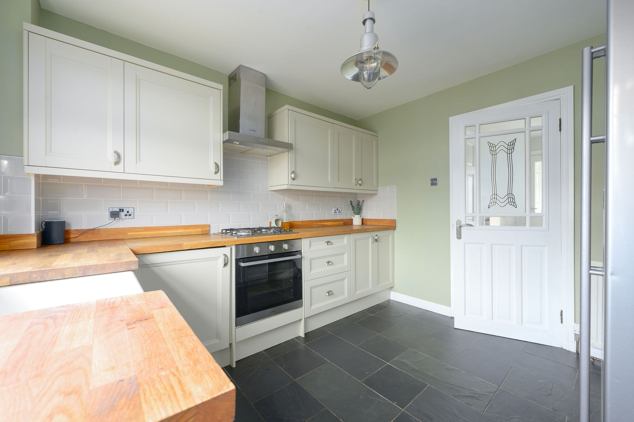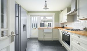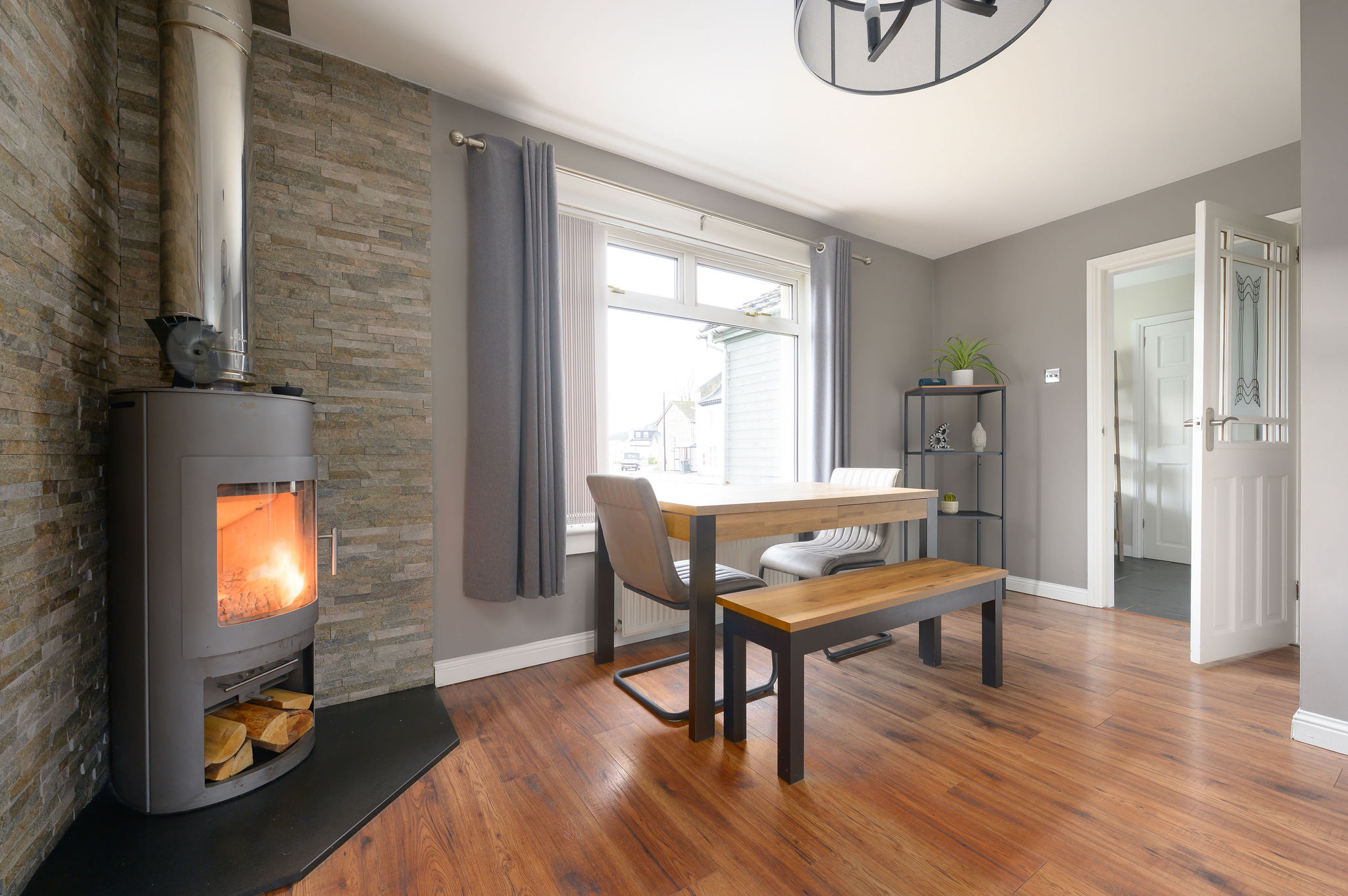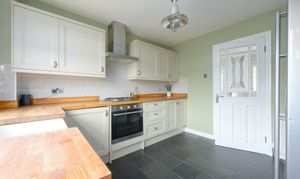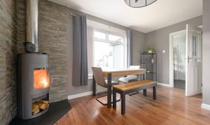 On the ground floor, the property boasts a bright and spacious lounge complete with a cosy log burner, creating the perfect focal point for relaxing evenings. The modern kitchen is well equipped with a built-in gas hob, electric oven, and space for a washing machine and freestanding fridge freezer, offering both functionality and style.