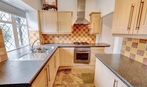 Well-equipped kitchen with a range of wood-effect units, contrasting worktops and colourful tiled splashbacks. Includes integrated oven, gas hob with extractor and a large window for natural light.
