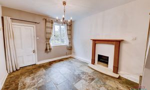 A cosy front lounge featuring a central fireplace, tiled flooring and a front-facing window allowing natural light. Offers space for both seating and dining, with open access to the kitchen and stairs to the first floor. Neutrally decorated and full of potential.