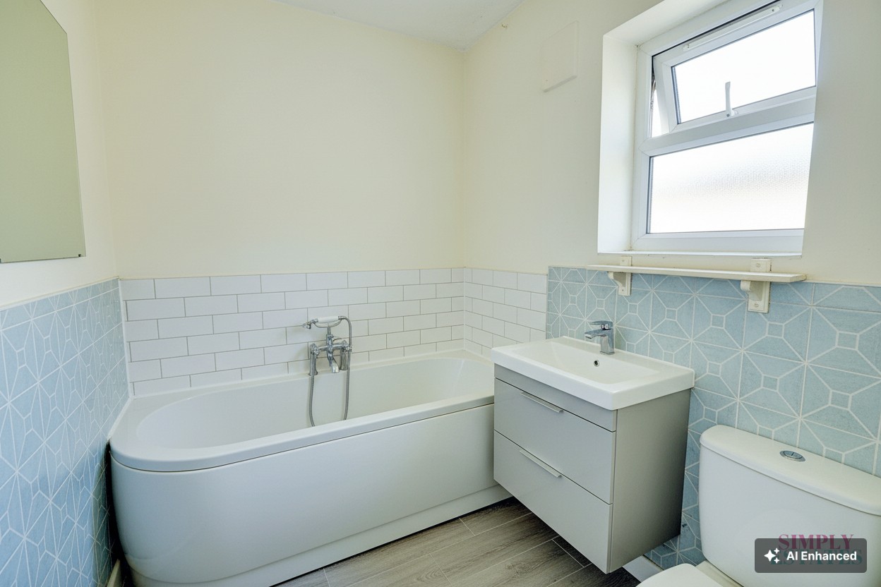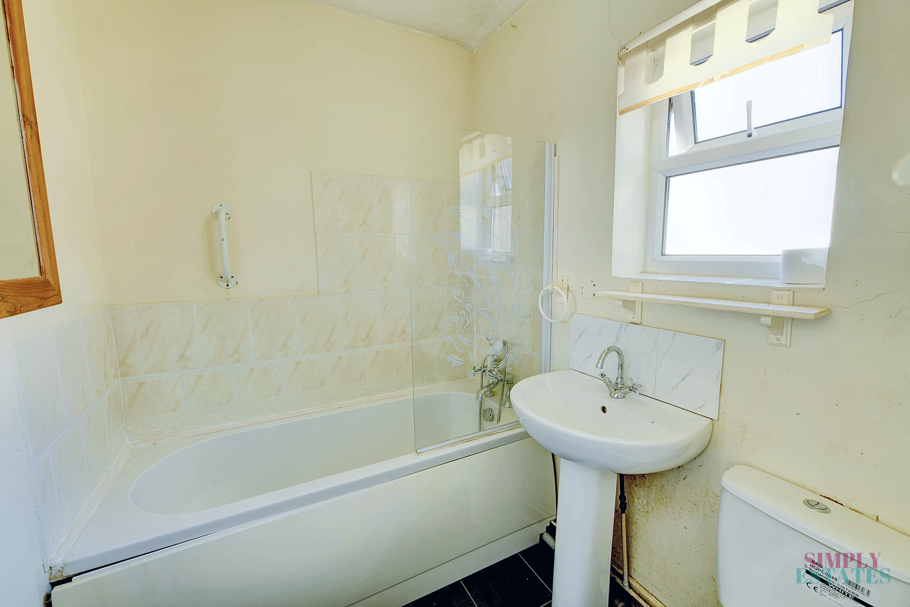 Bathroom with bath and overhead shower, wash basin and WC. A bright space with potential for updating to suit modern tastes.
