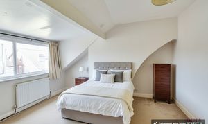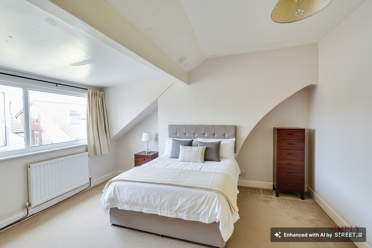 Bright bedroom with sloped ceiling, radiator and window overlooking the rear. Offers good potential for updating and personal touch.