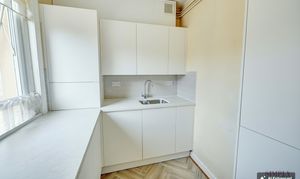 Compact kitchen with fitted units and worktops, filled with natural light. Offers great potential for renovation and modernisation.