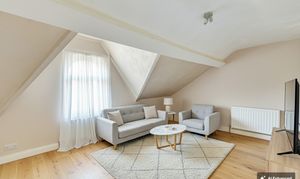 Spacious lounge set within the eaves, featuring characterful angles, two windows for natural light, and plenty of scope for renovation and personalisation.