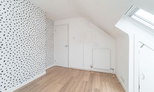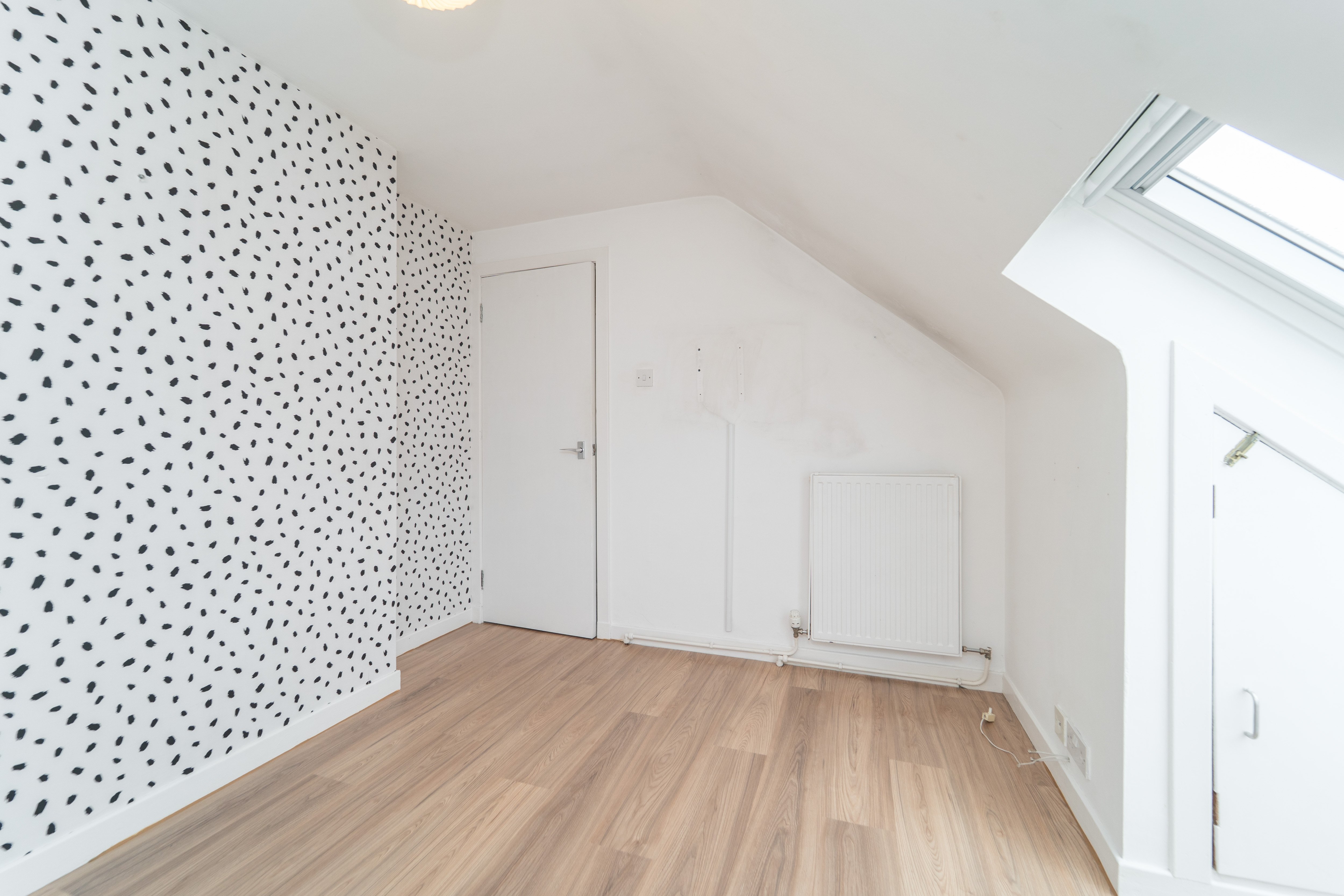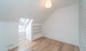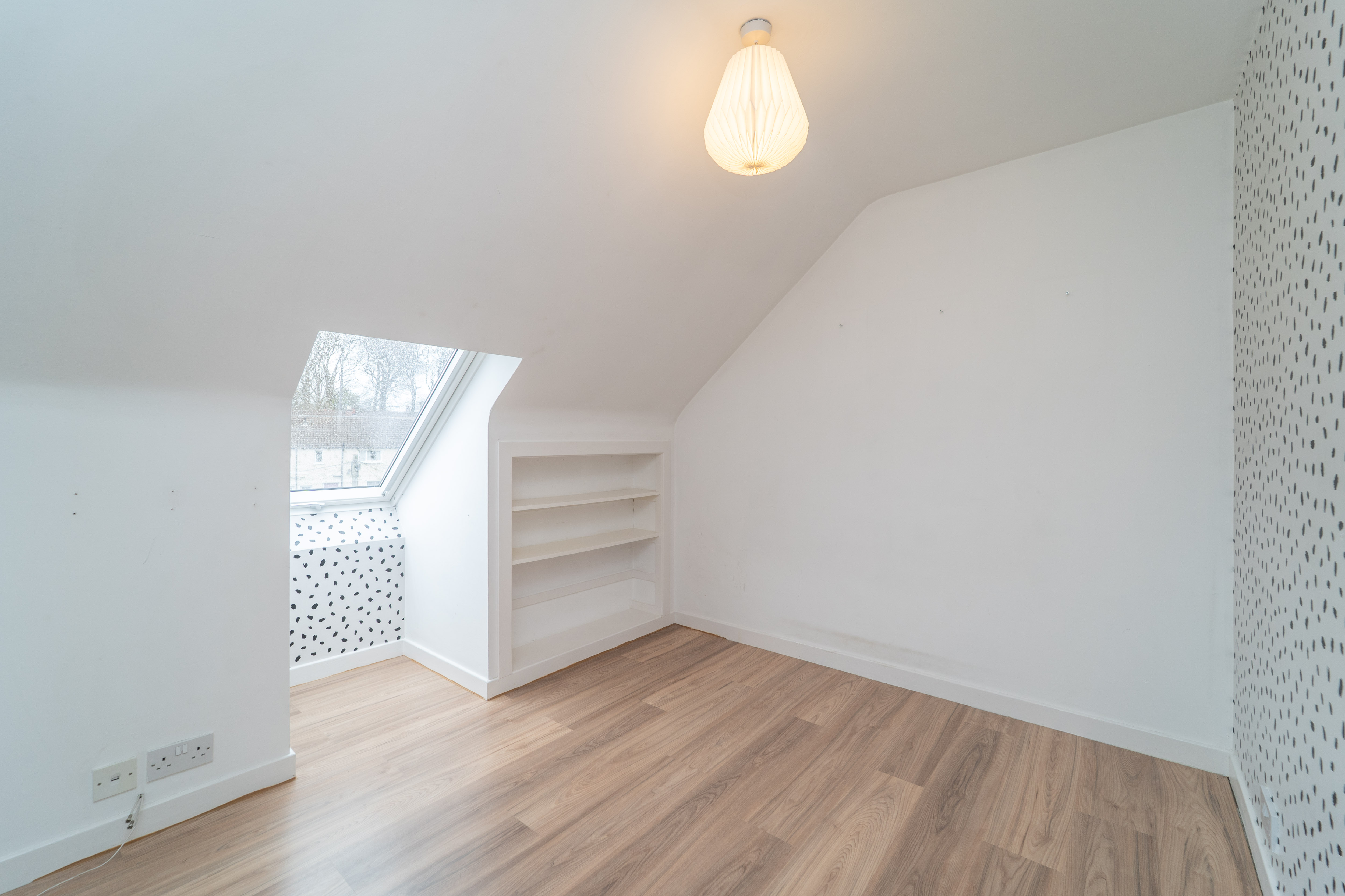 3.072m x 2.390m (10’00” x 07’10”) This bright room has been finished with one feature wall and white painted to the remaining walls with laminate to the floor. The Velux window allows in natural light and this is further complemented by a ceiling light. Built in bookcase, eaves storage, power points and a radiator complete the room.