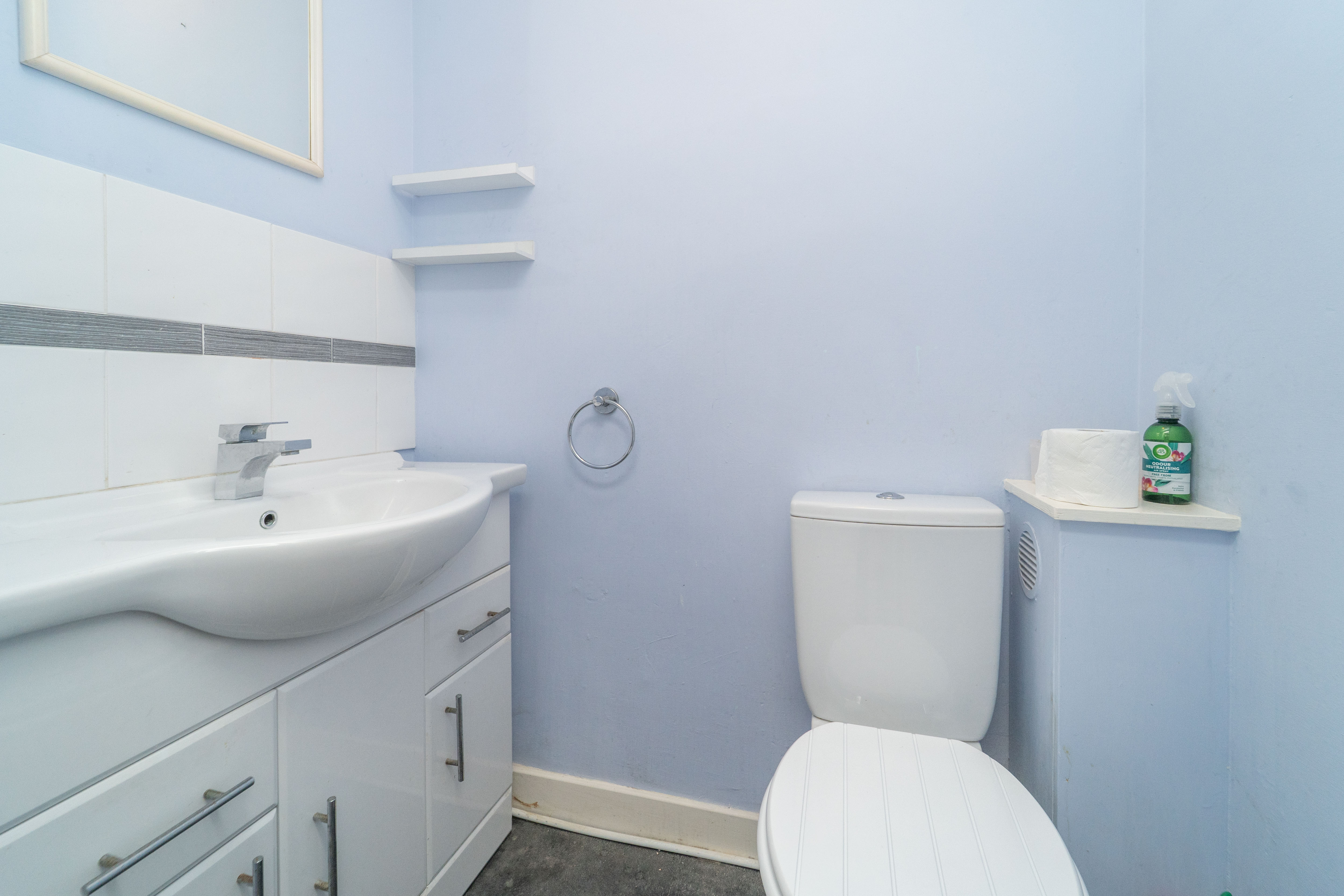 1.528m x 0.997m (05’00” x 03’03”) Located off the main bedroom, this stylish toilet room has painted walls and vinyl to the floor. The white suite comprises of a close coupled toilet and an inset sink set within a vanity unit. Ceiling lighting and an extractor finish the room.
