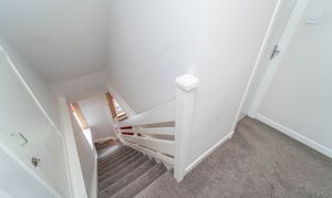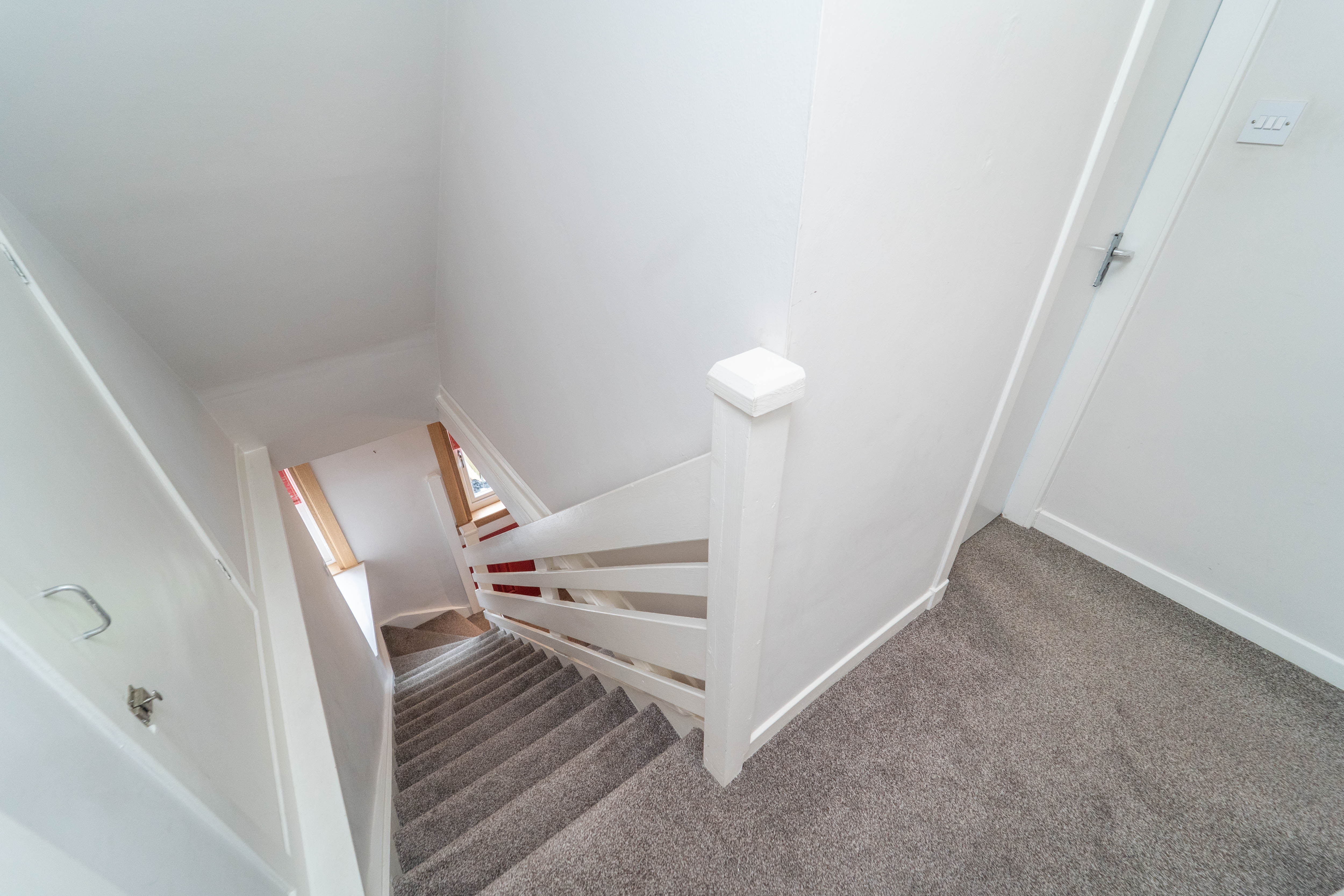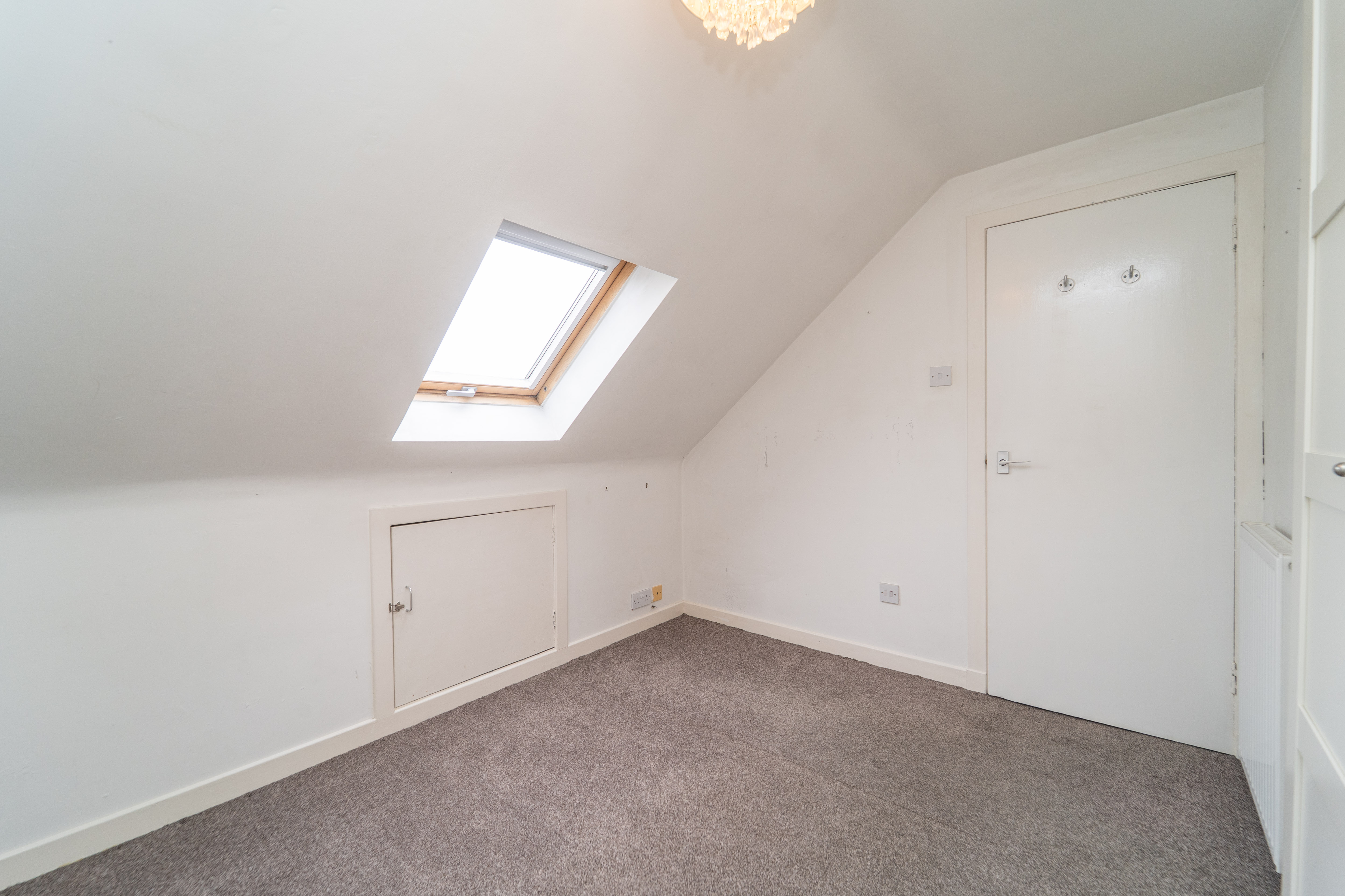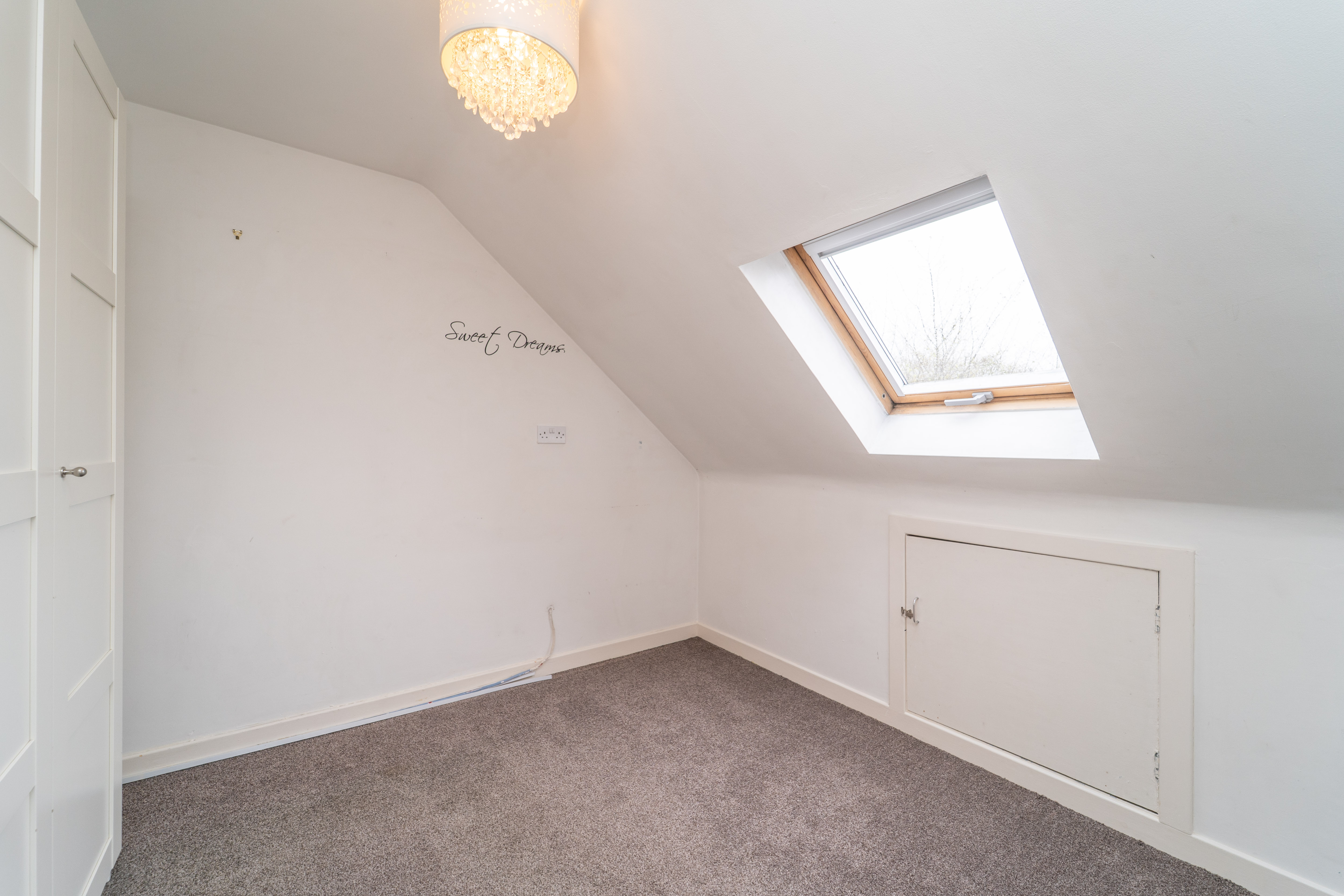 3.092m x 2.499m (10’01” x 08’02”) plus wardrobe alcove 2.082m x 0.304m (06’10x 01’00”) This delightful room has been decorated with white painted walls and a neutral carpet to the floor. The Velux window allows in natural light and this is further complemented by a ceiling light. A wardrobe recess, with a freestanding wardrobe (which will be included in the sale), eaves storage, power points and a radiator are also included.