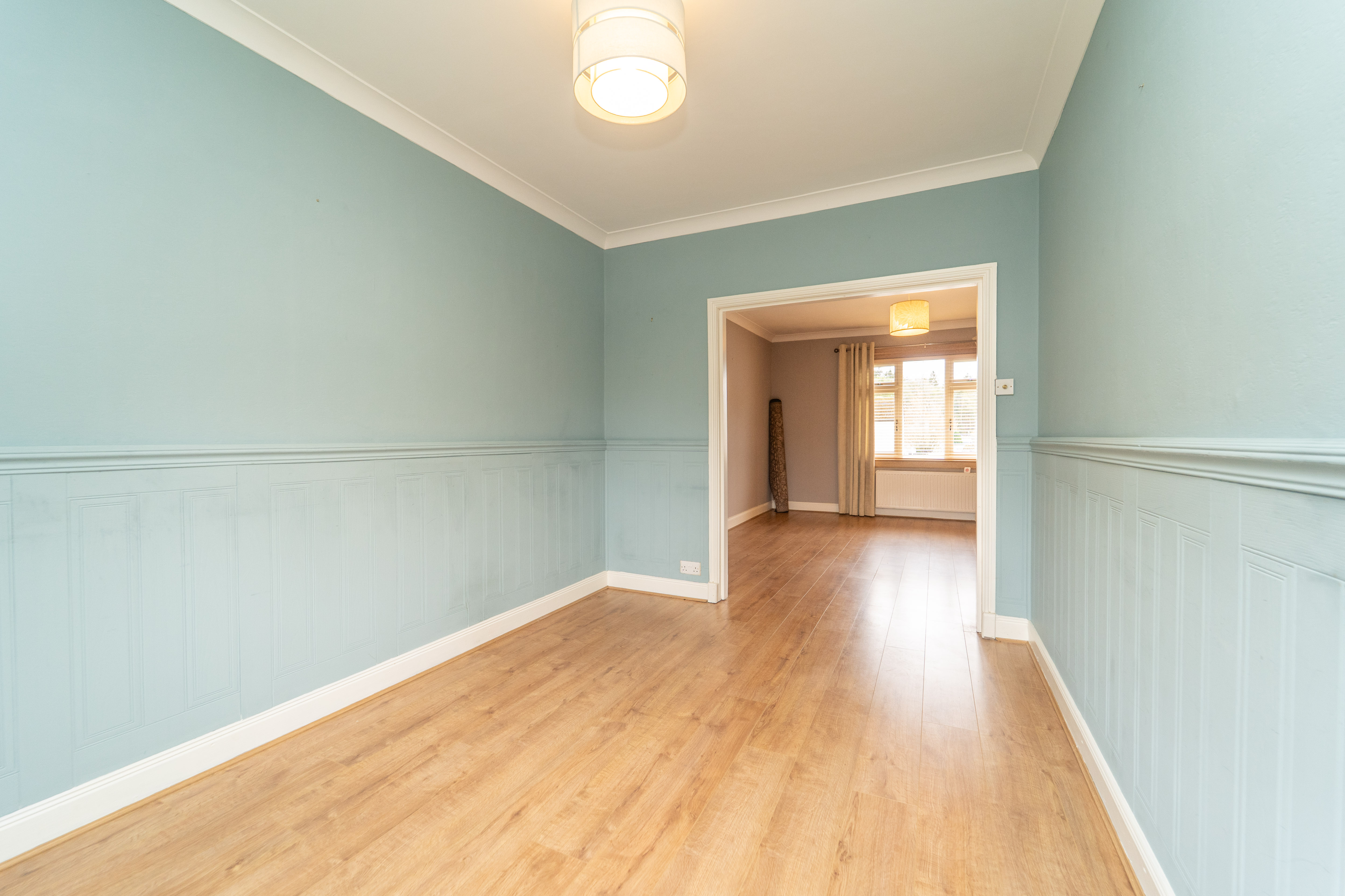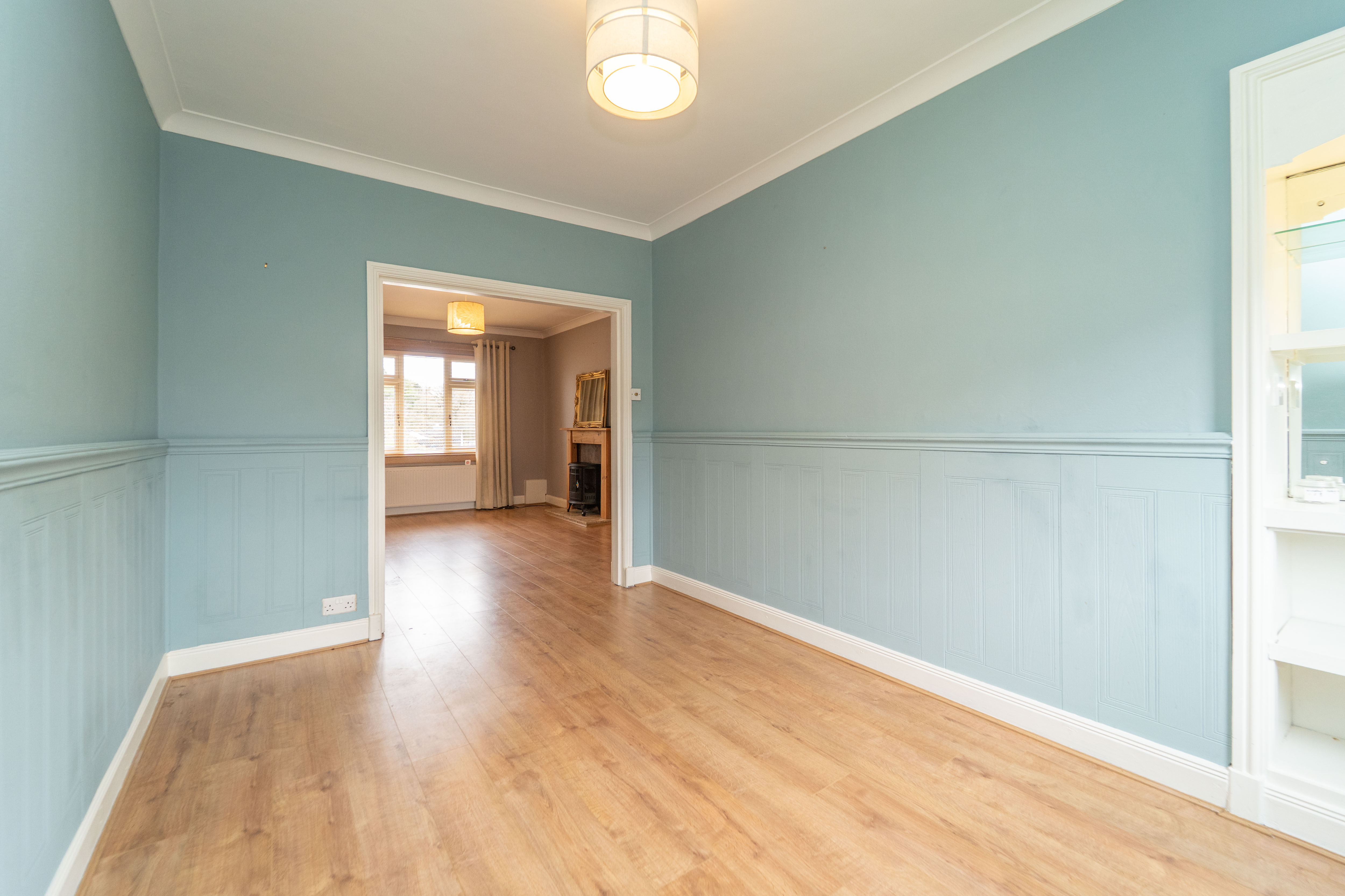 3.952m x 2.697m (12’10” x 08’10”) Currently open plan from the lounge, this delightful room has been decorated with blue painted walls, with half height wood panelling and laminate to the floor. A window allows in natural light, being further enhanced by ceiling lighting. A delightful press recess has been fitted with shelving. A radiator, blind and power points complete this area.
