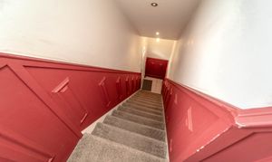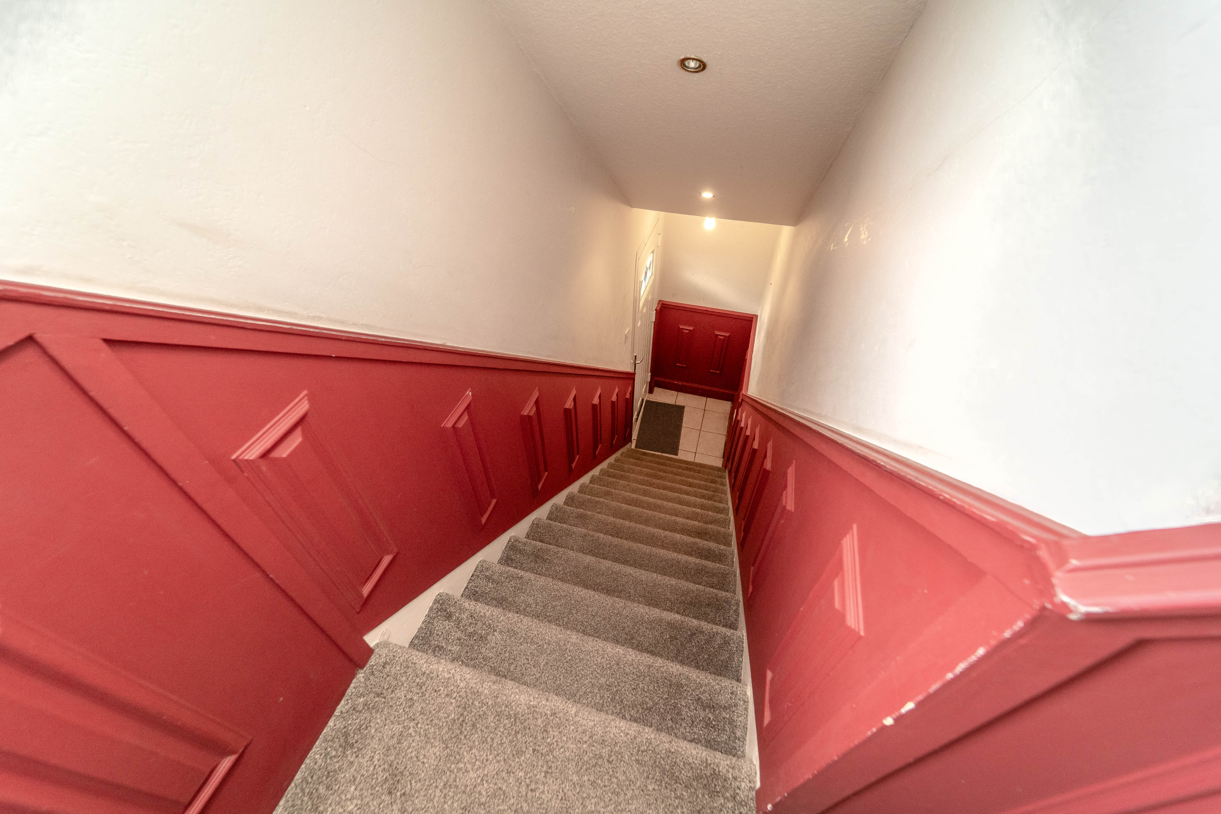 Entry to this inviting hallway is through a composite door with feature glass. The modern décor begins with walls decorated in half height wood panelling and painted neutrally above. The tiled flooring in the vestibule leads into the carpeted stairs. Ceiling lighting completes this area.