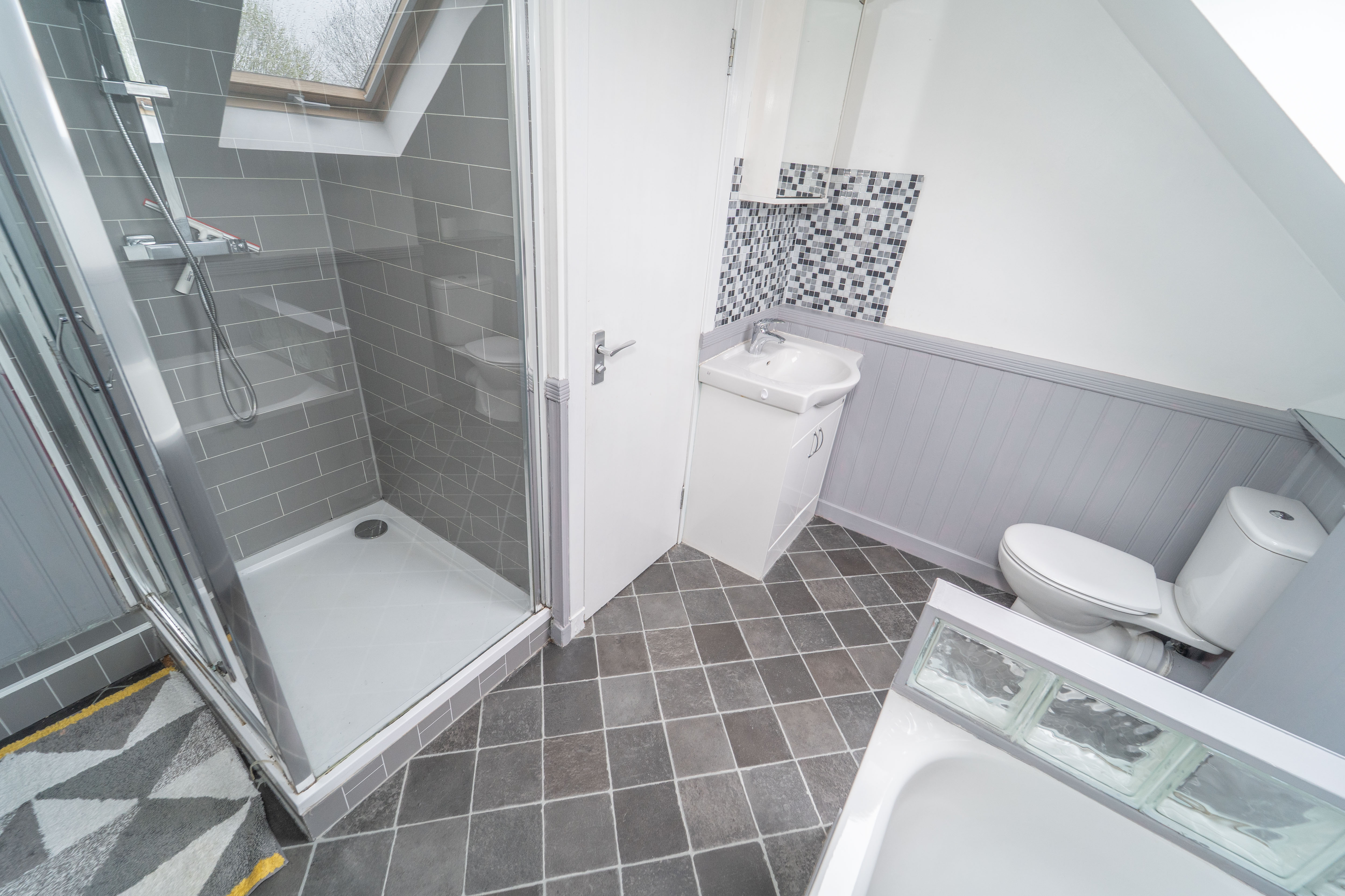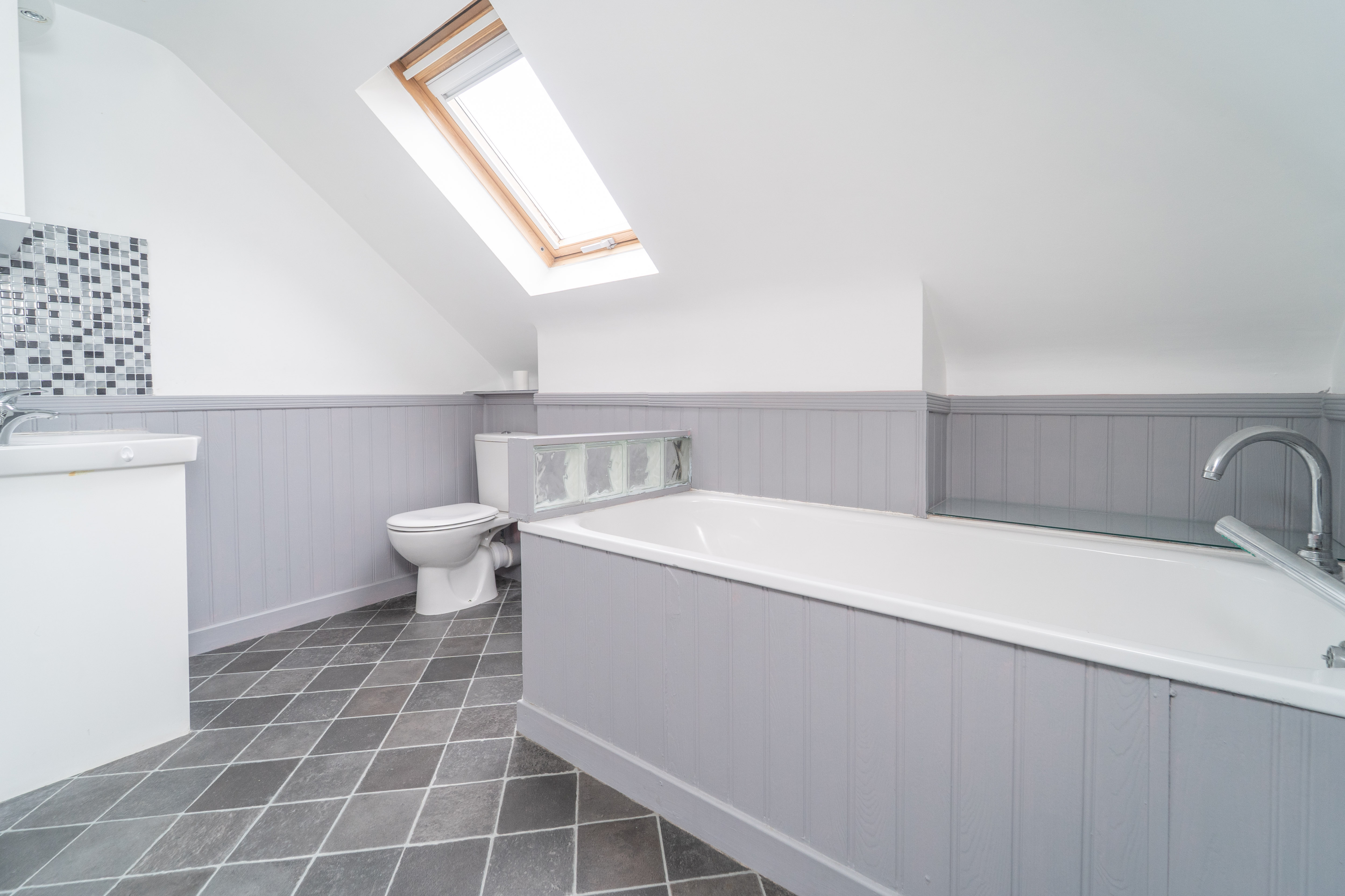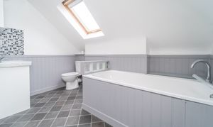 3.144m x 3.035m (10’03” x 09’11”) narrowing to 1.970m (06’05”) This superb bathroom has been cleverly designed to make the best use of this unusually shaped room. Decorated with half height wood panelling and painted above with vinyl to the floor. The white suite comprises of large shower cubicle with wall mounted shower, with rainfall shower head, a bath with pull out shower hose, a close coupled toilet and an inset sink set within a vanity unit. Natural light enters via the Velux window. Recessed ceiling downlights and a white ladder towel radiator finish the room.