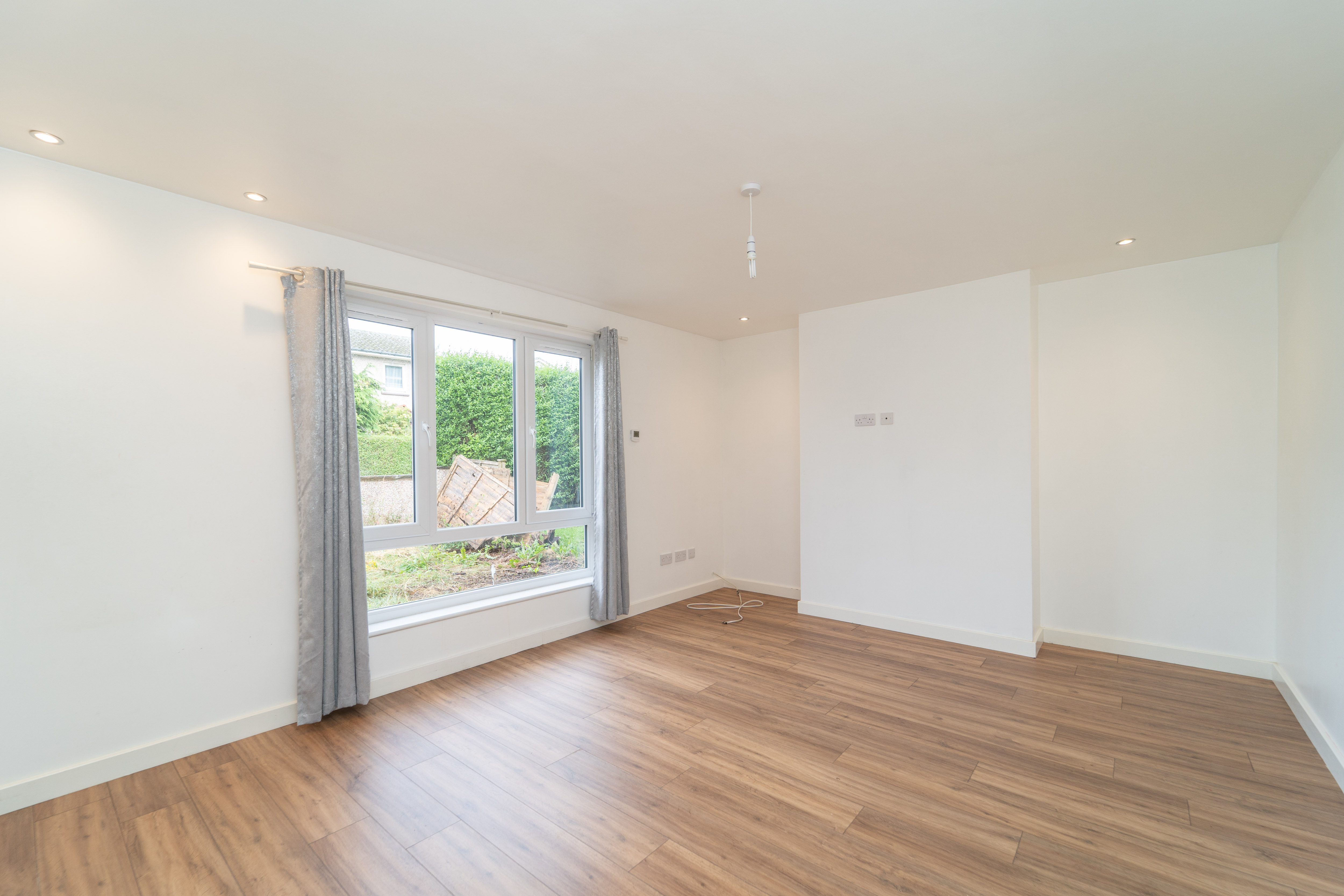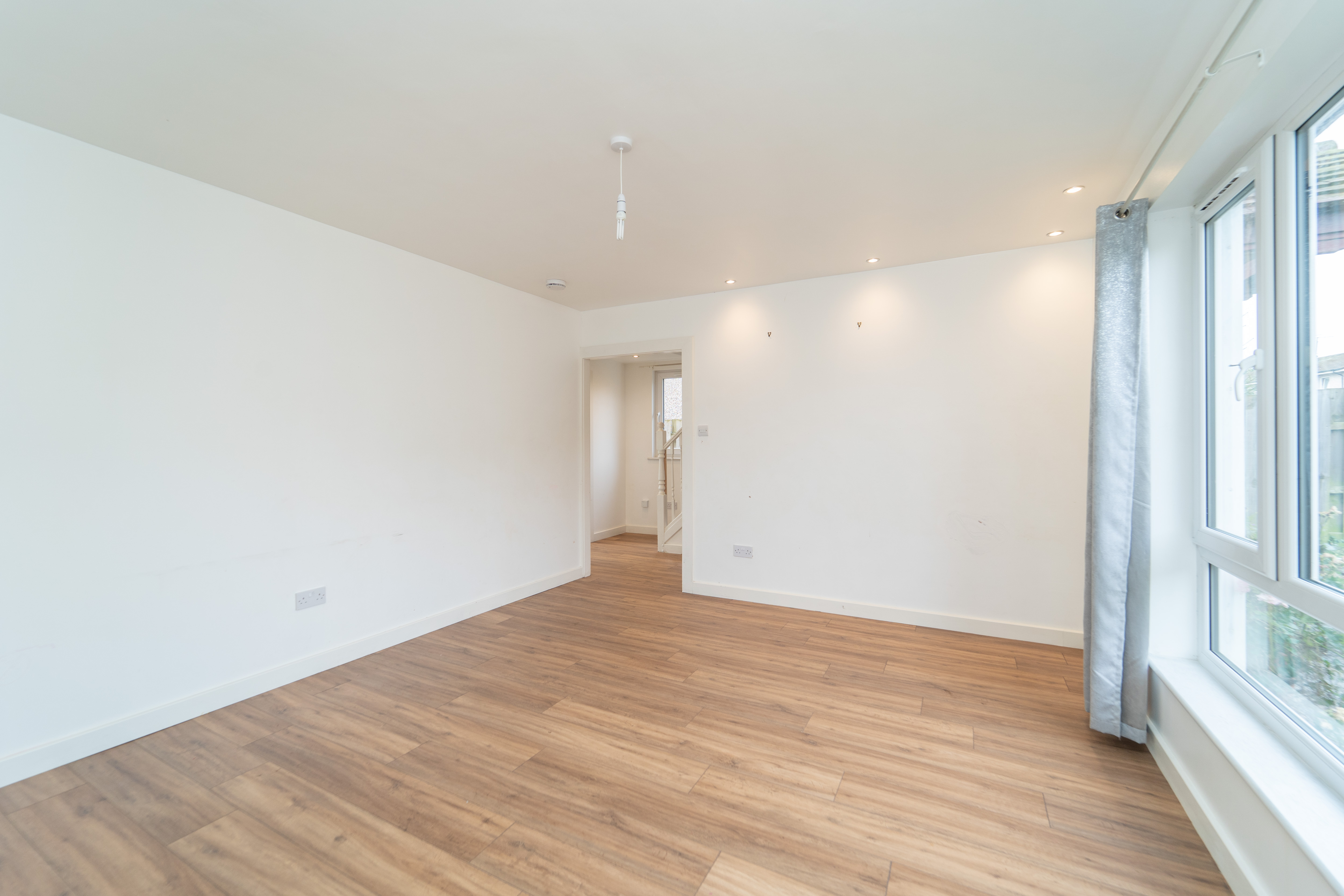 This spacious main living space has been finished with white painted walls and laminate flooring. A large window to the front allows lots of natural light into the room, being further enhanced by a ceiling light and downlights. Power points complete the room.