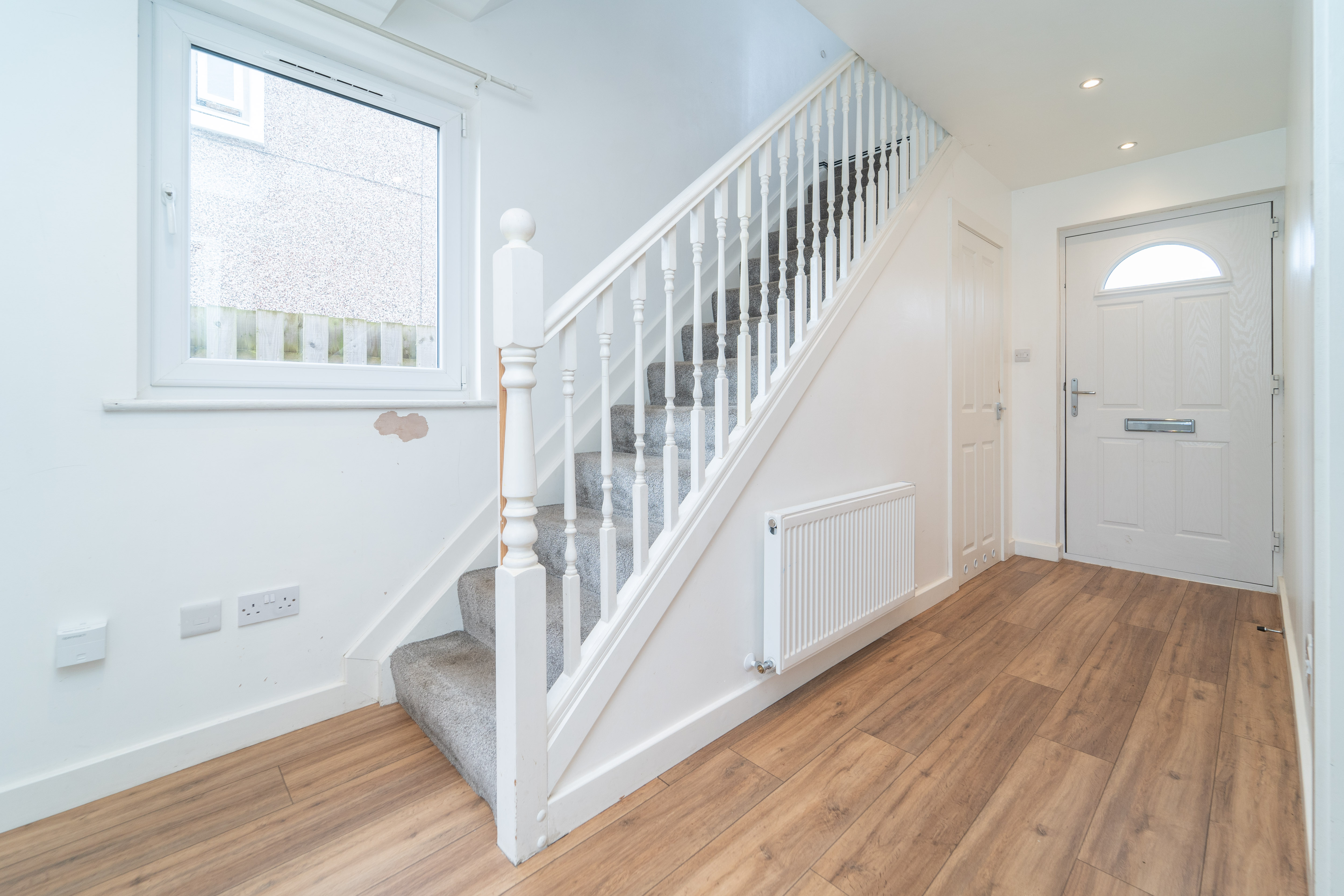 Entry to this inviting hallway is through a part glazed composite door which allows natural light to enter. The fresh modern décor begins with white painted walls and laminate to the floor. A generous under stair cupboard provides storage space. A window to the side allows natural light into the space. Ceiling downlights, a radiator, power points, and a smoke detector complete the hallway.