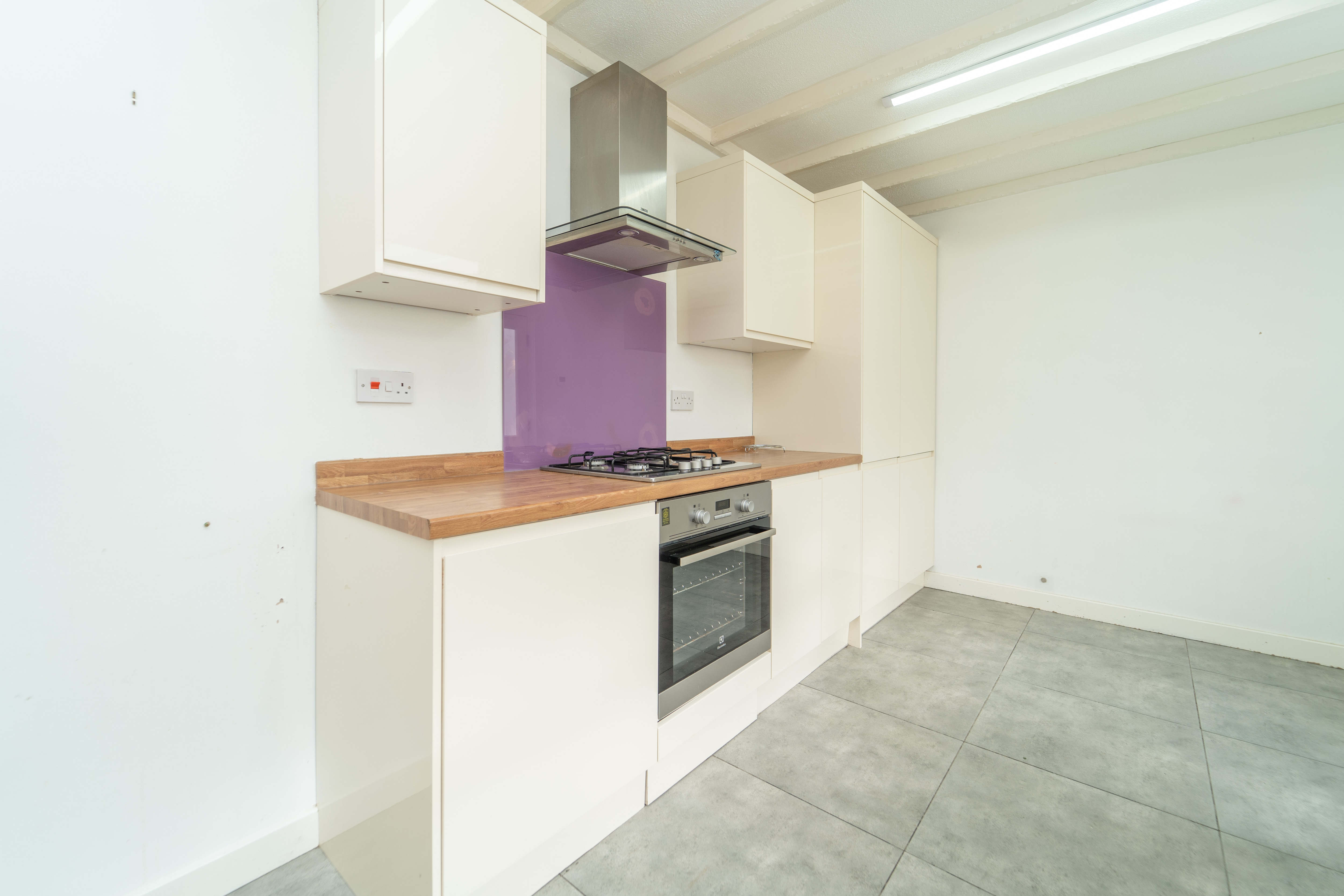 This neutral kitchen has many wall and floor mounted units with cream gloss frontages, co-ordinating wood effect work surfaces and upstands, and decorated with white painted walls and a grey tiles floor. Appliances include, a four ring gas hob with purple splashback, an undercounter oven, a stainless steel and glass extractor hood, an integrated washing machine, an integrated fridge freezer and an integrated dishwasher, which will all be included in the sale. Natural light enters from the window to the rear of the property, looking into the conservatory, which is complimented by two ceiling lights. The sink area comprises of a black sink with drainer and mixer tap. A heat detector and power points complete this room.