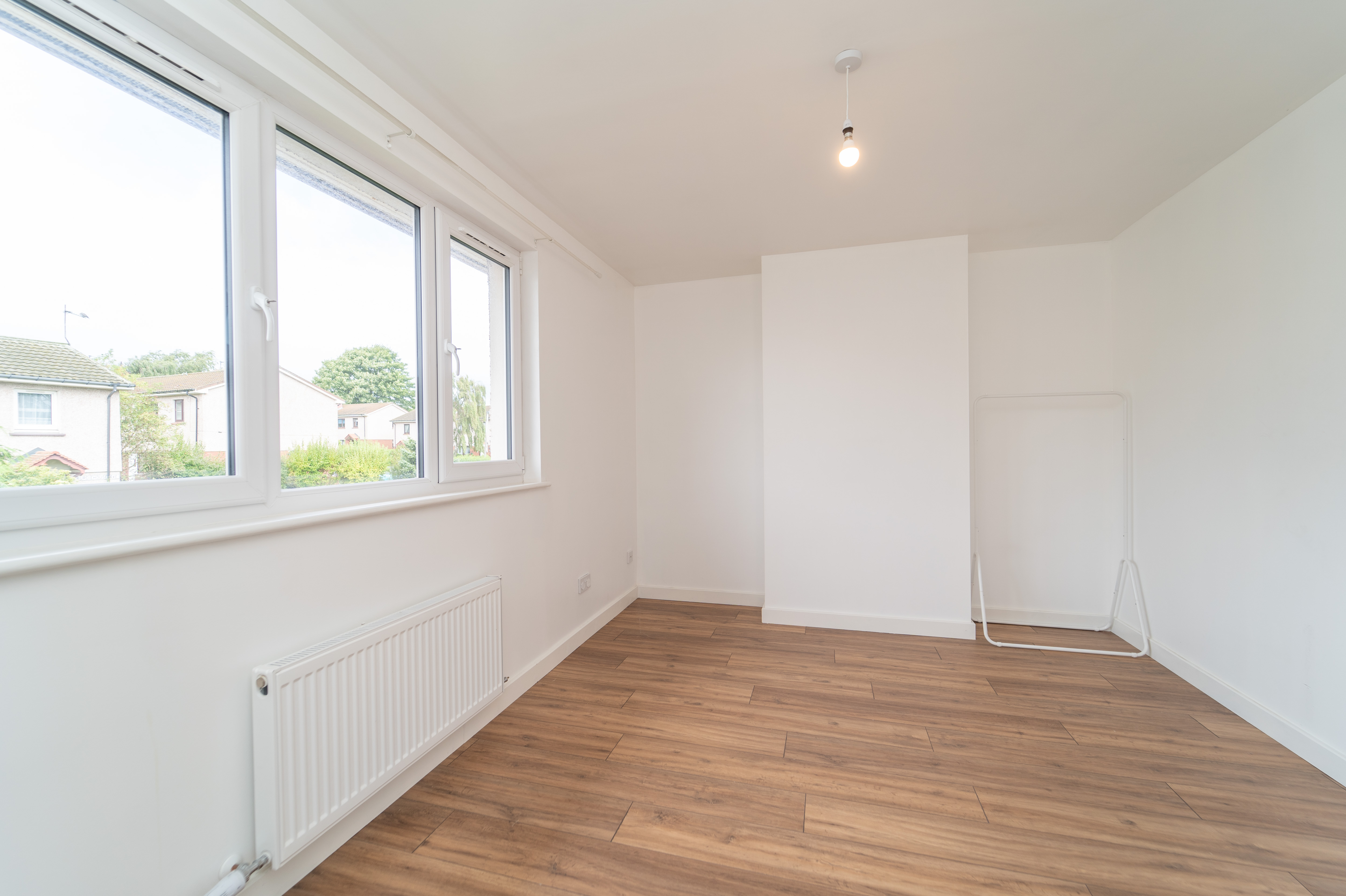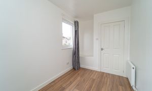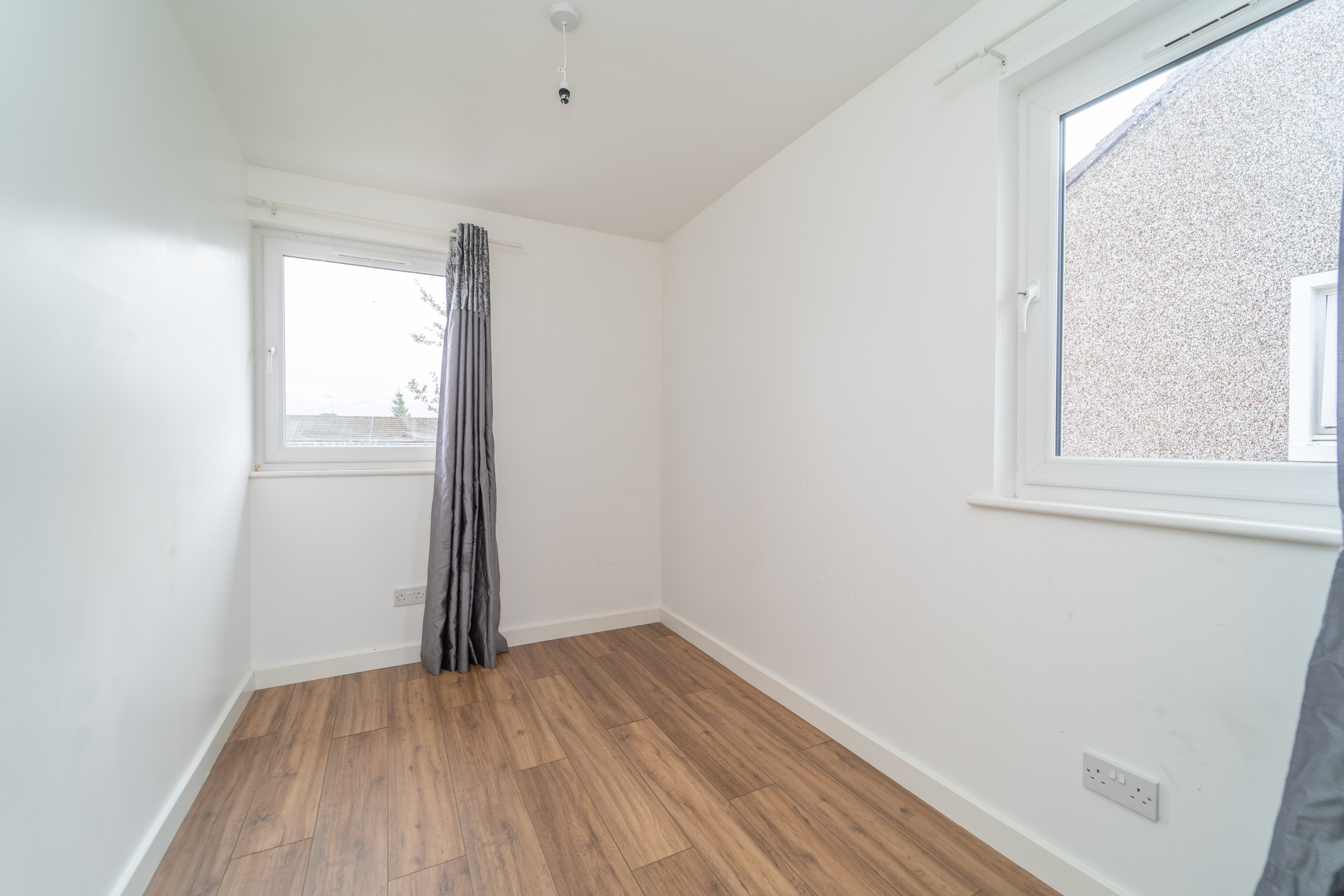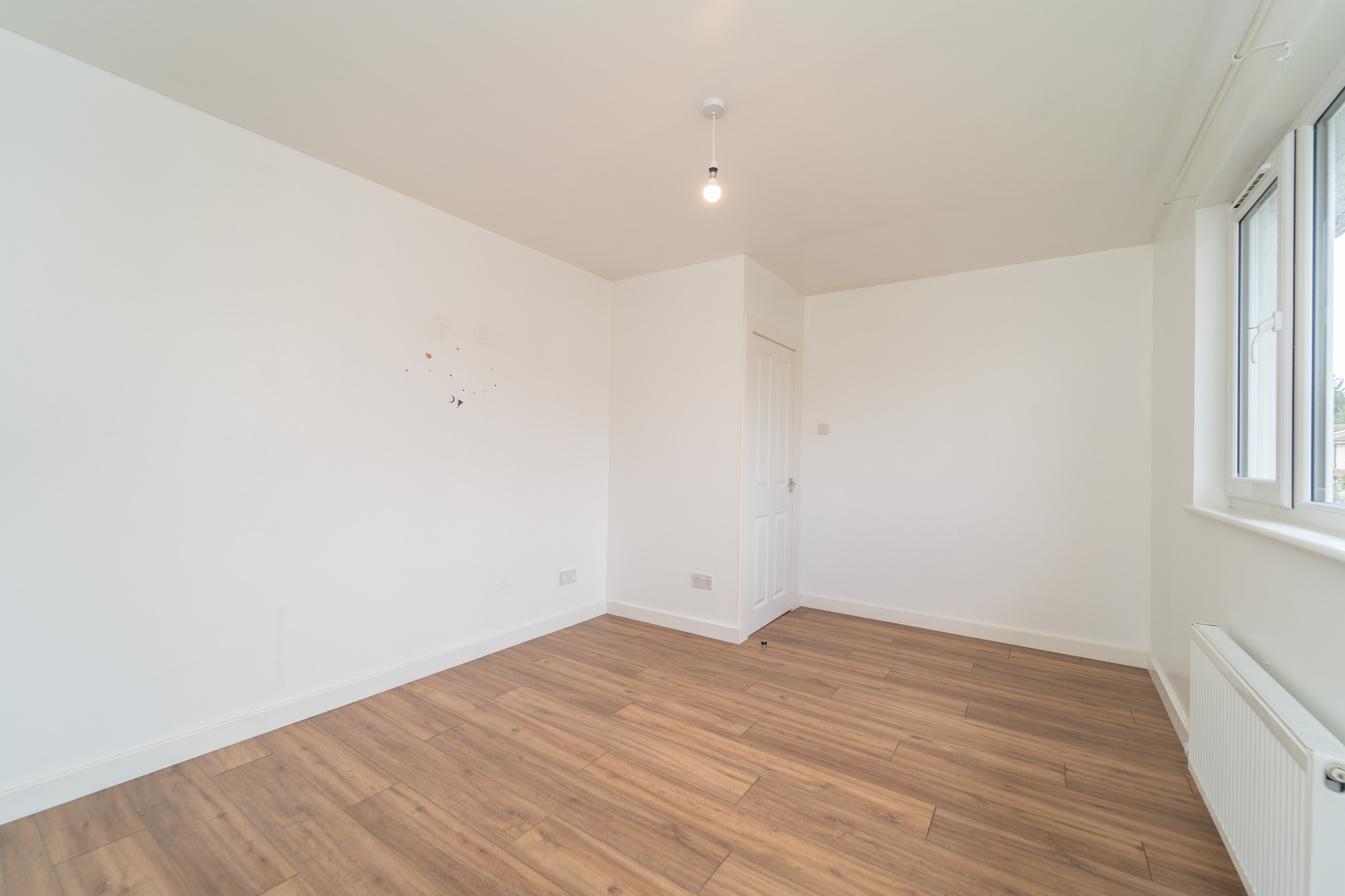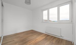 This great third bedroom has been finished with white painted walls and a laminate floor. The windows to the side and rear of the property allow in natural light. Power points, a ceiling light and a radiator are included.