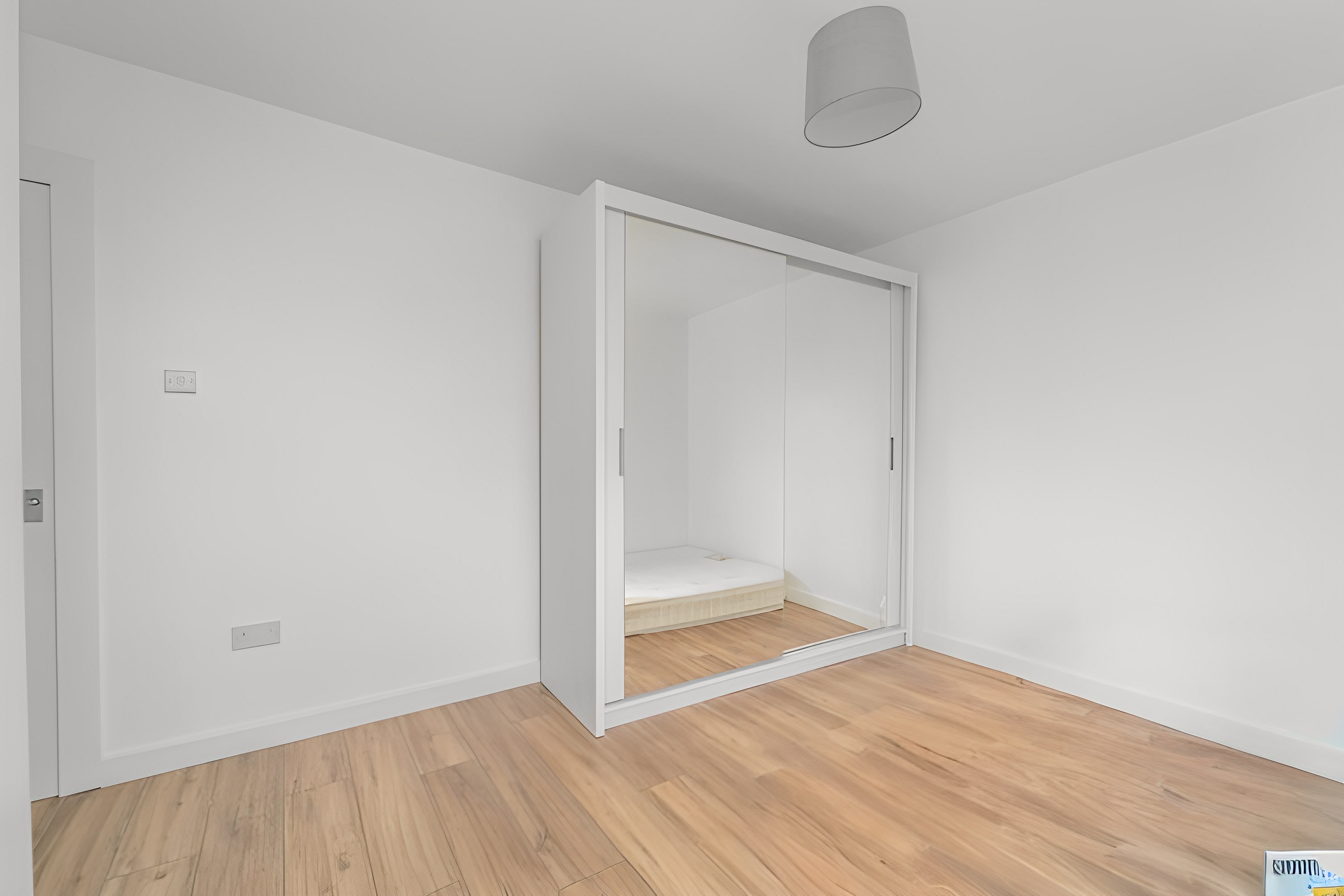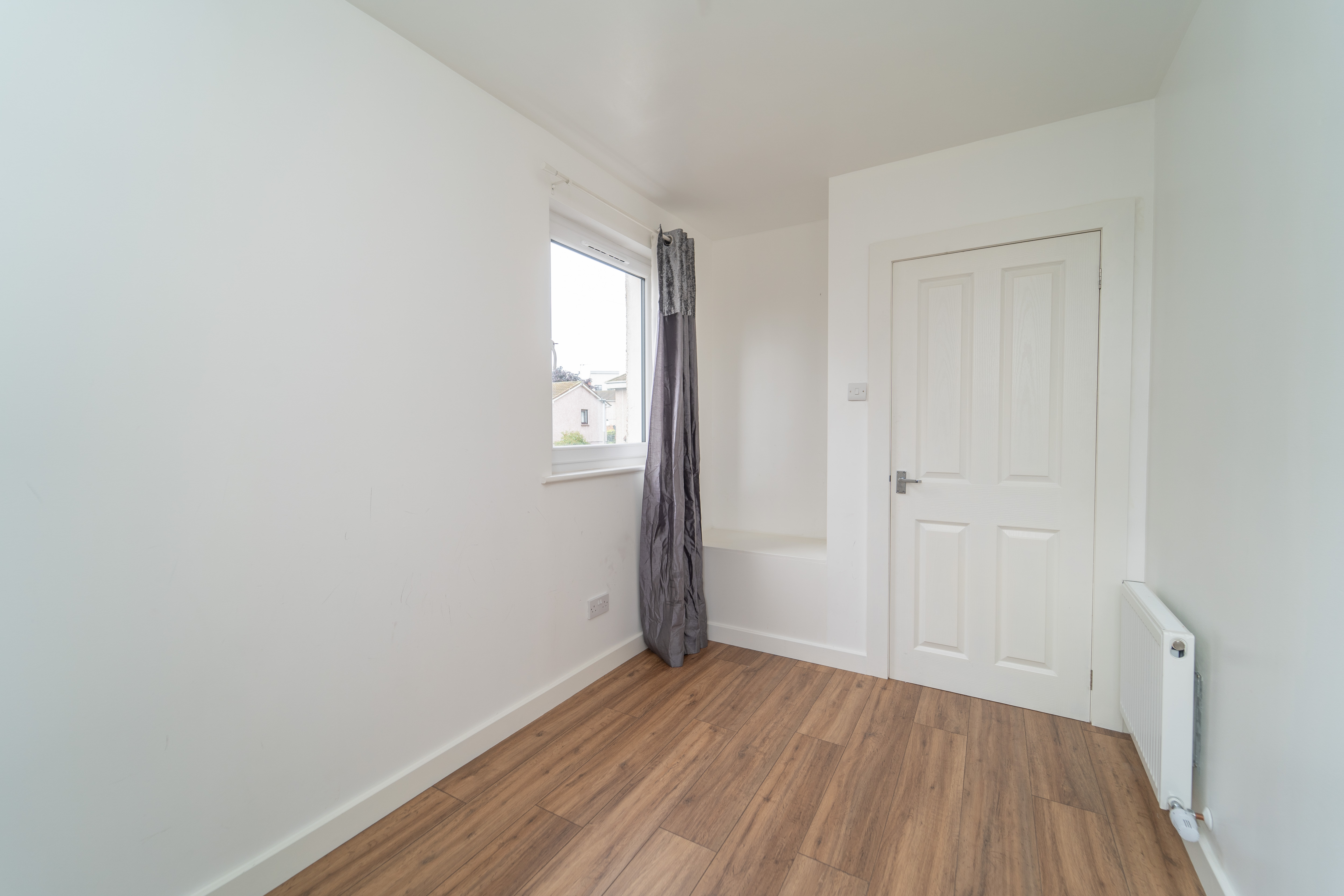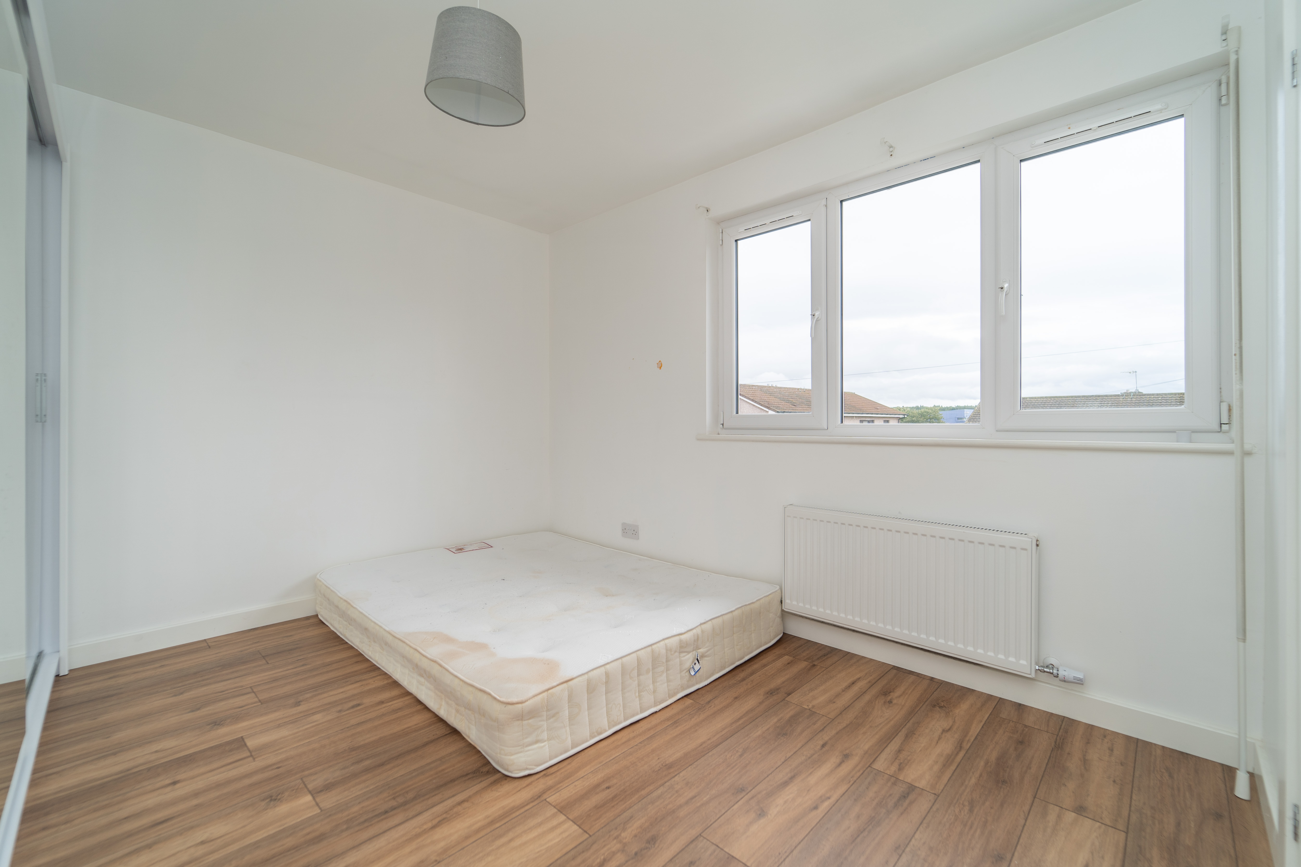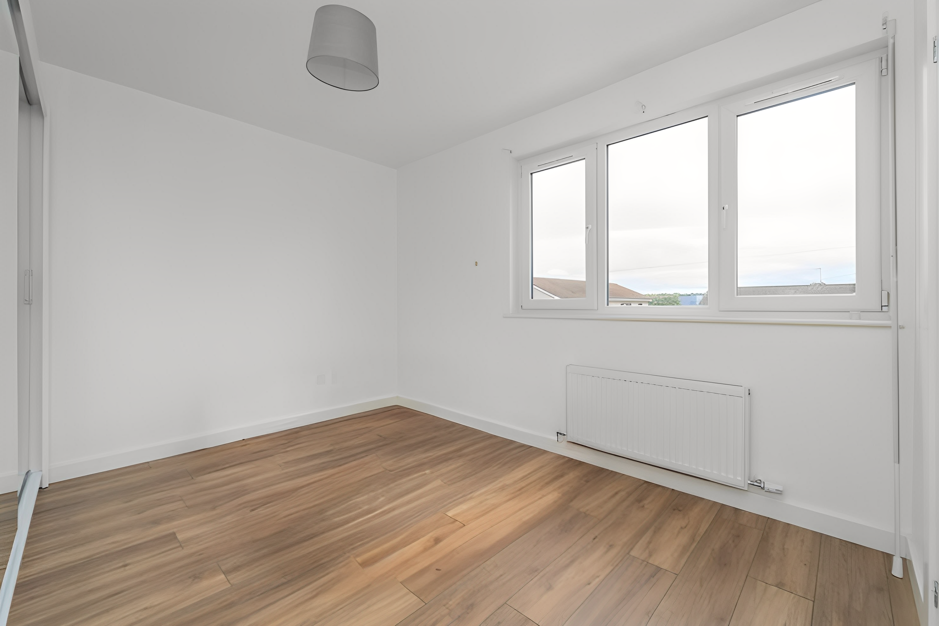 This great third bedroom has been finished with white painted walls and a laminate floor. The windows to the side and rear of the property allow in natural light. Power points, a ceiling light and a radiator are included.