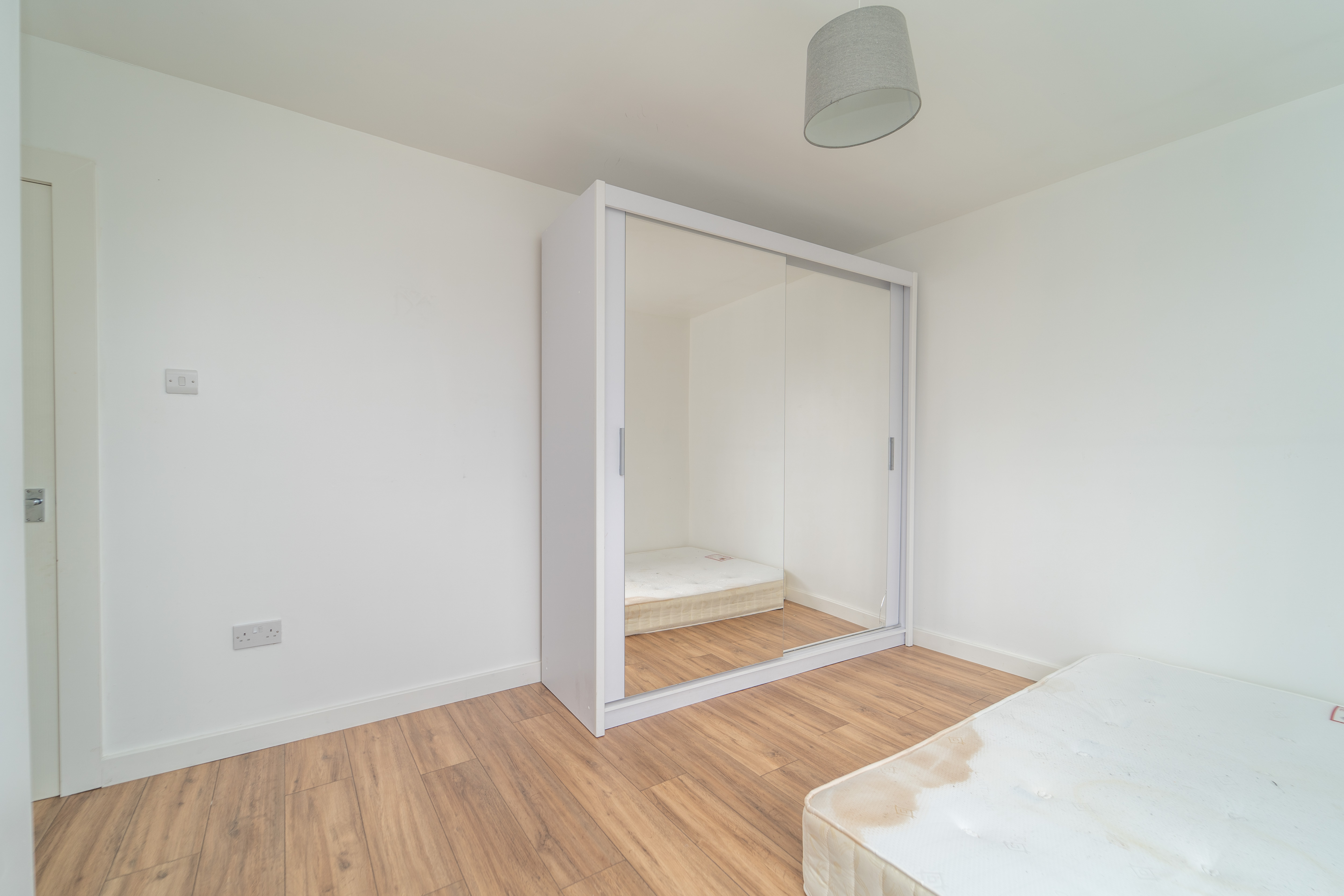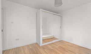 This spacious room has white painted walls and laminate to the floor. A window to the rear of the property allows in lots of natural light and there is a ceiling light. There is a wardrobe, with hanging and shelving space. A radiator and power sockets are also provided.