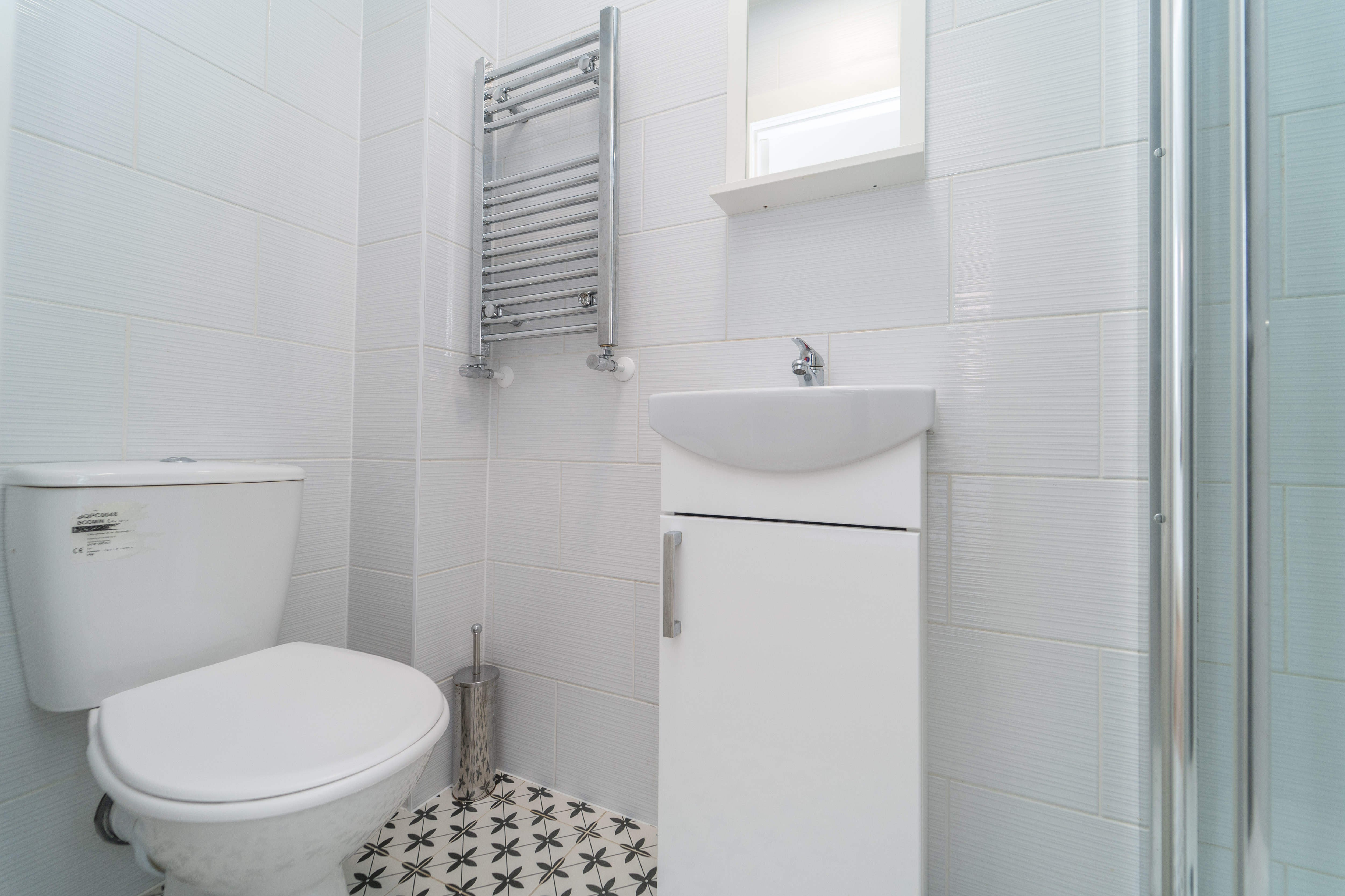 This shower room has been decorated with light grey tiled walls and white and black tiles to the floor. The suite comprises of a shower unit with mains shower, a close coupled toilet and a white gloss vanity sink. A ceiling light, chrome towel radiator and extractor fan complete the room.