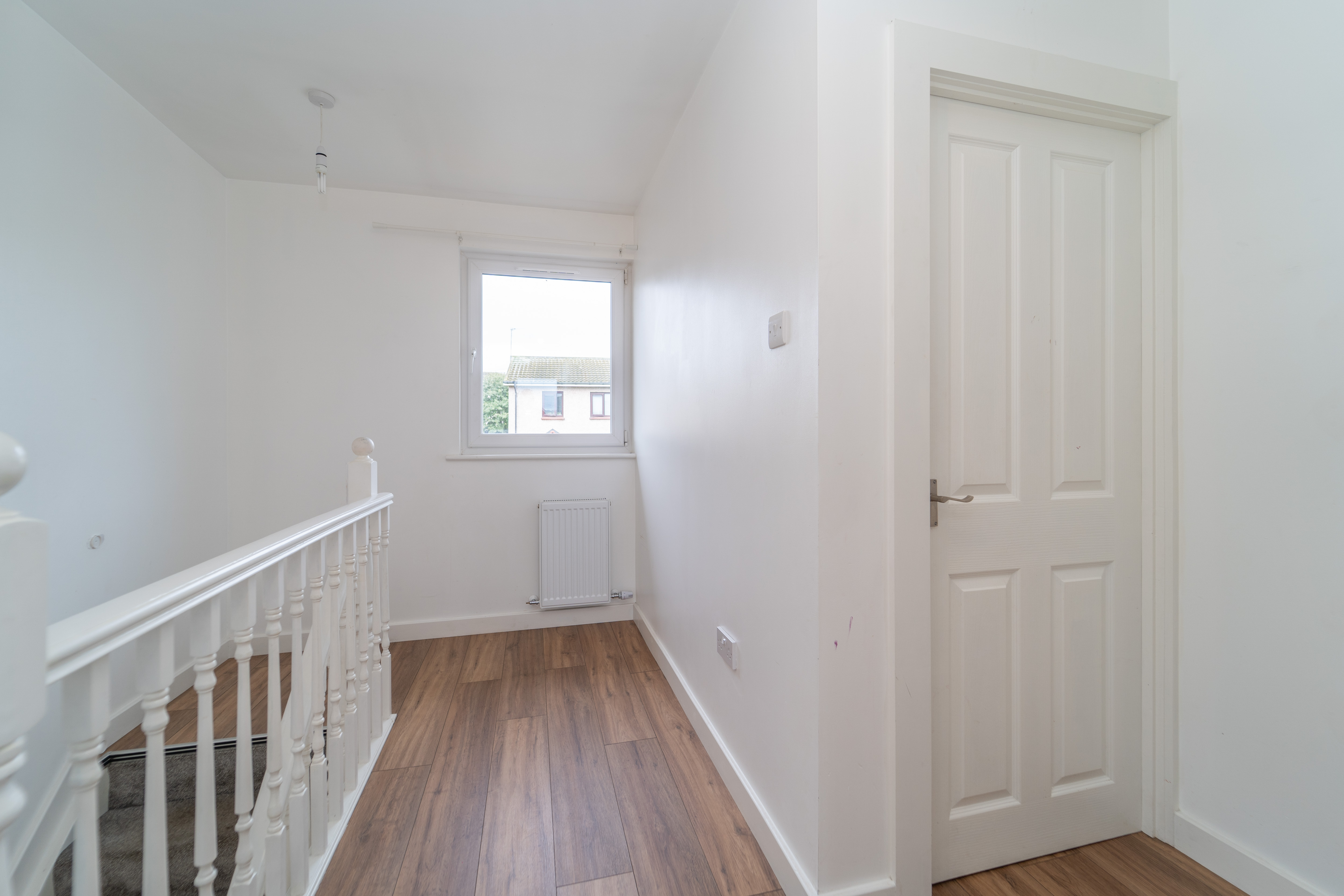 The décor continues with white painted walls, carpet to the stairs and laminate flooring on the landing. There is a window to the front, allowing natural light into this space. There are two ceiling lights, a smoke detector, power points and an attic hatch to complete this area.