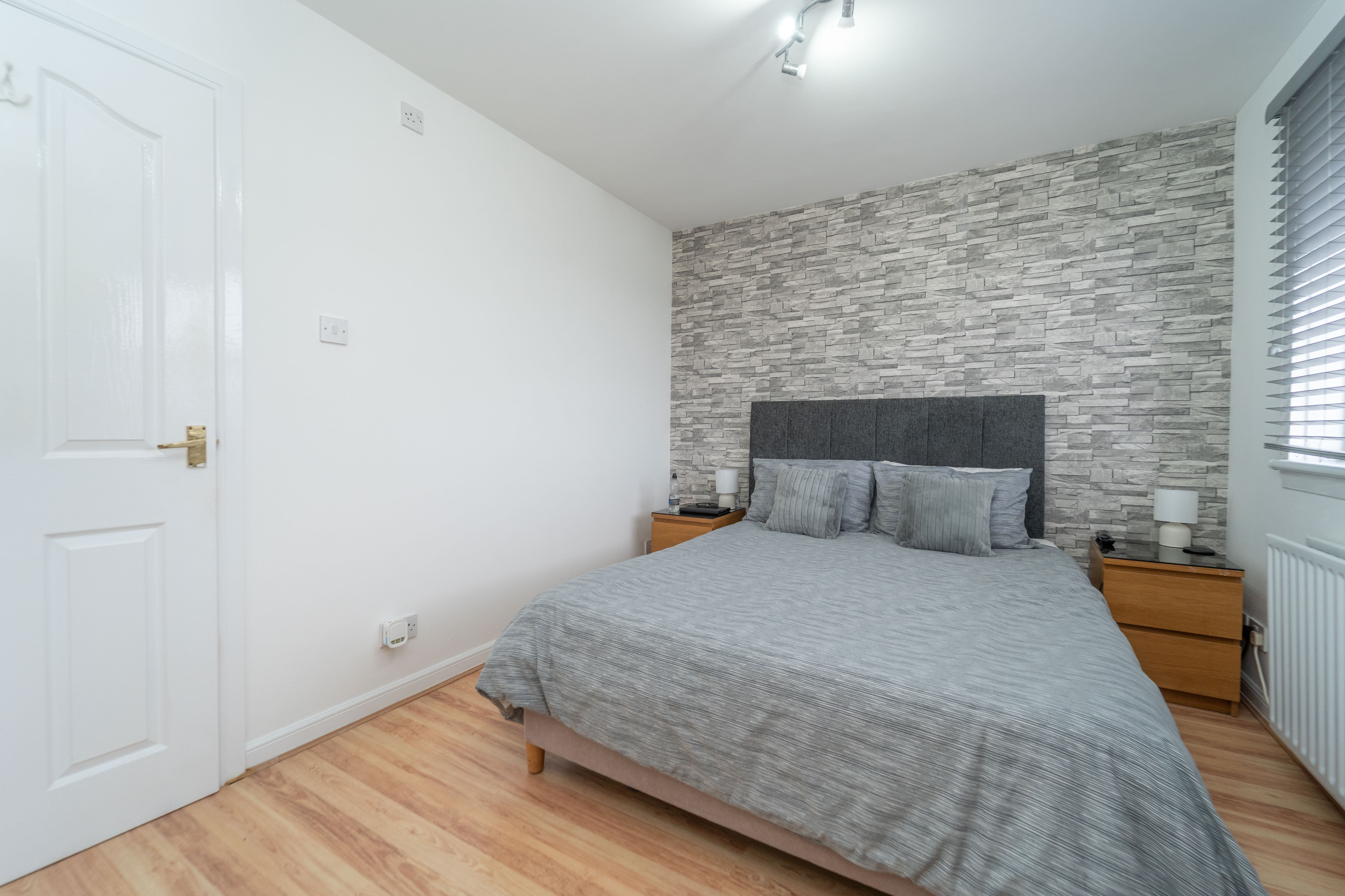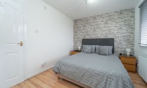 3.441m x 2.801m (11’03” x 09’02”) This spacious double bedroom is finished with wooden laminate flooring and crisp white painted walls, complemented by a feature wall with a stone-effect design. A large triple window overlooking the rear of the property allows plenty of natural light, while a ceiling-mounted light provides illumination. The room also benefits from a radiator and a built-in mirrored double wardrobe, offering excellent storage