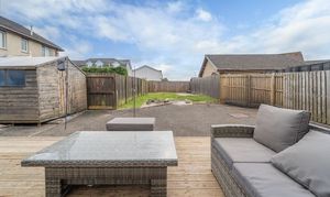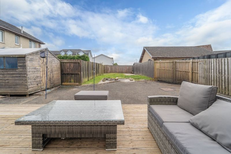 The property enjoys a fully enclosed rear garden, south facing for sun all day, offering excellent privacy and versatility. A large timber deck provides an ideal space for outdoor seating and entertaining, with direct access from the French doors to the kitchen. The garden also features a mix of lawn, gravel and paved areas, along with a timber shed for storage. A secure gate opens to the driveway, providing off-street parking for multiple vehicles. The driveway is also fitted with an electric car charging point that will be included in the sale.
