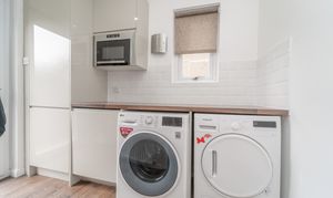 2.801m x 1.633m (09’02” x 05’04”) The utility room continues with the same wood-effect laminate flooring as the kitchen and is finished with white painted walls and ceiling downlights. It provides excellent storage space and includes fittings for both a washing machine and tumble dryer (not included in the sale). A built-in microwave and dishwasher are also integrated, with a window to the side and a large glazed back door giving access to the rear garden. A radiator is also installed for heating.