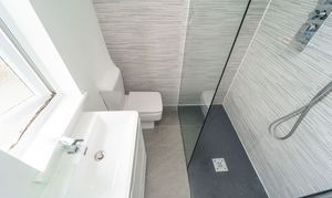 1.666m x 1.545m (05’05” x 05’00”) The ensuite features stone tiled flooring and light grey patterned wall tiles surrounding a modern walk-in shower with both an overhead rainfall shower and handheld attachment, enclosed by a glazed screen. A back-to-wall toilet and a vanity unit with inset sink sit beneath a frosted, fully glazed window, providing natural light and ventilation. The room is finished with ceiling-mounted downlights, an extractor fan, and a chrome heated towel rail.