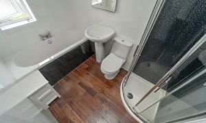 2.707m x 1.601m (08’10” x 05’03”) The bathroom features a mix of wet wall panelling and dark wooden flooring. A privacy window sits above the bath, and the room is fitted with a ceiling light and radiator. Key features include a white three-piece suite comprising a toilet, pedestal sink and bath. A fitted shelf runs along the wall for convenient storage of toiletries and essentials.