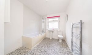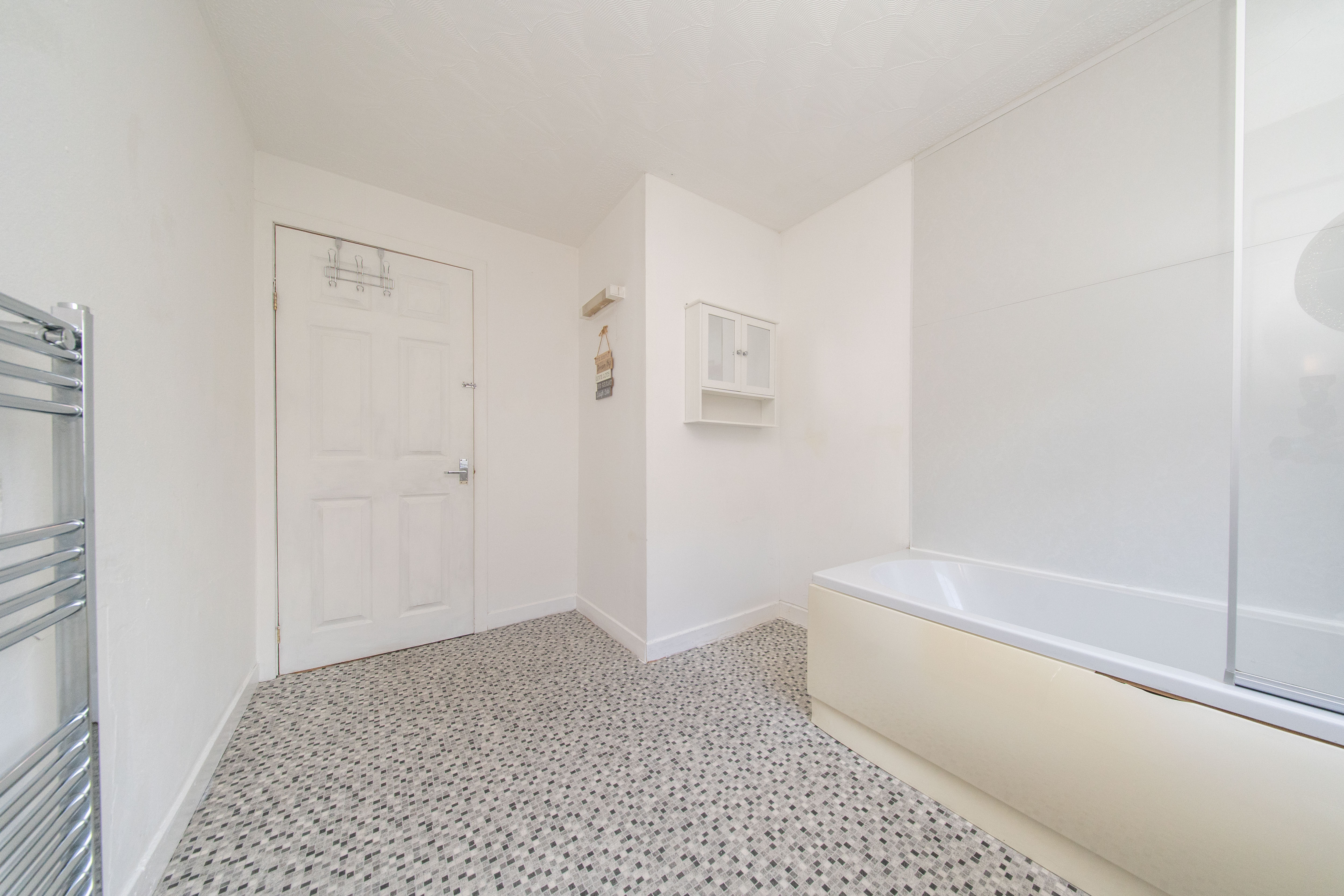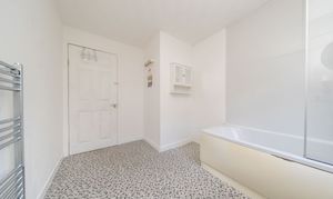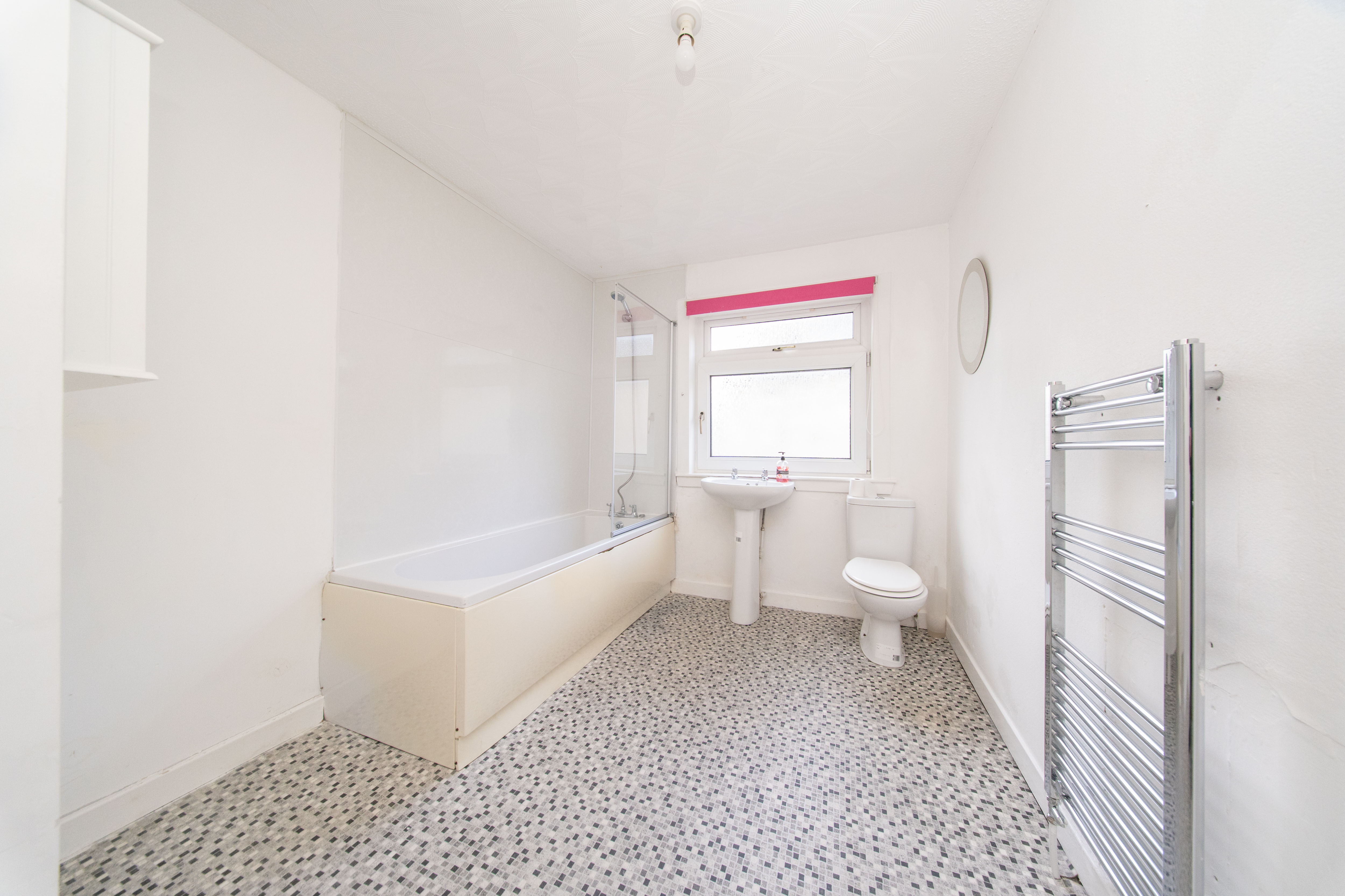 3.211m x 2.222m (10’06” x 07’03”) A well sized bathroom fitted with a three-piece suite including a bath with shower over, pedestal sink and toilet. The room is finished with patterned vinyl flooring and painted walls. A glazed window allows natural light into the space while also providing ventilation. The bathroom also benefits from a heated towel radiator and ceiling mounted lighting.