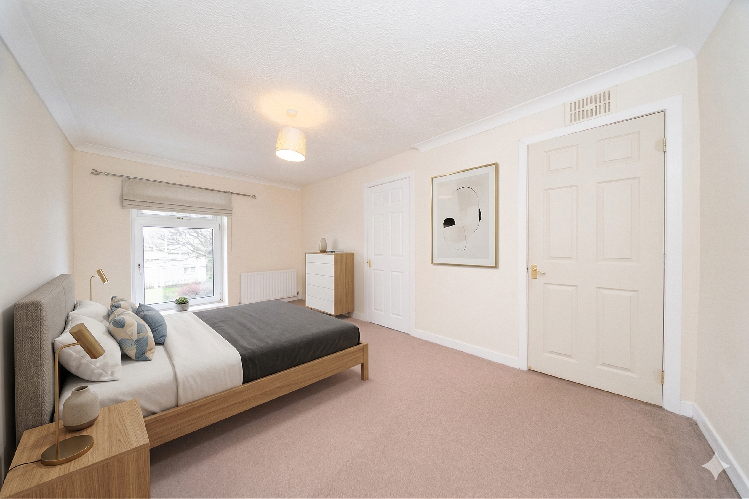 4.754m x 3.044m (15’07” x 09’11”) A comfortable double bedroom positioned to the front of the property. The room features carpeted flooring and painted walls, creating a neutral space ready for personalisation. A front facing window allows natural light into the room, while a large built-in cupboard provides useful storage. The room also benefits from a ceiling mounted light fitting, radiator and power points.