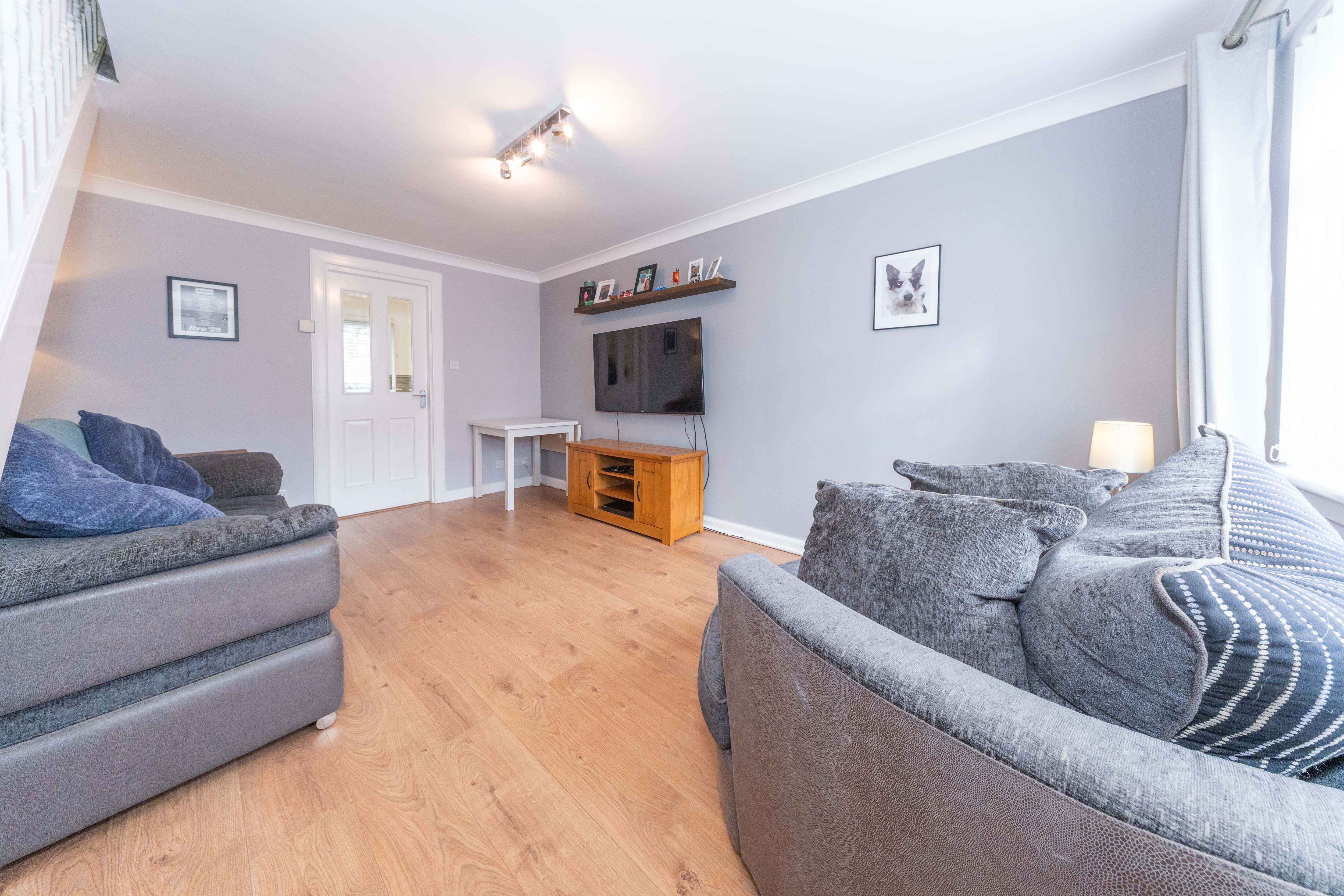 The home opens into a bright and welcoming vestibule, accessed via a modern partially glazed upvc front door. The space is tastefully finished with white décor and wood effect vinyl flooring, creating a polished and contemporary first impression. A ceiling light and rand a window to the front complete this practical entrance area.