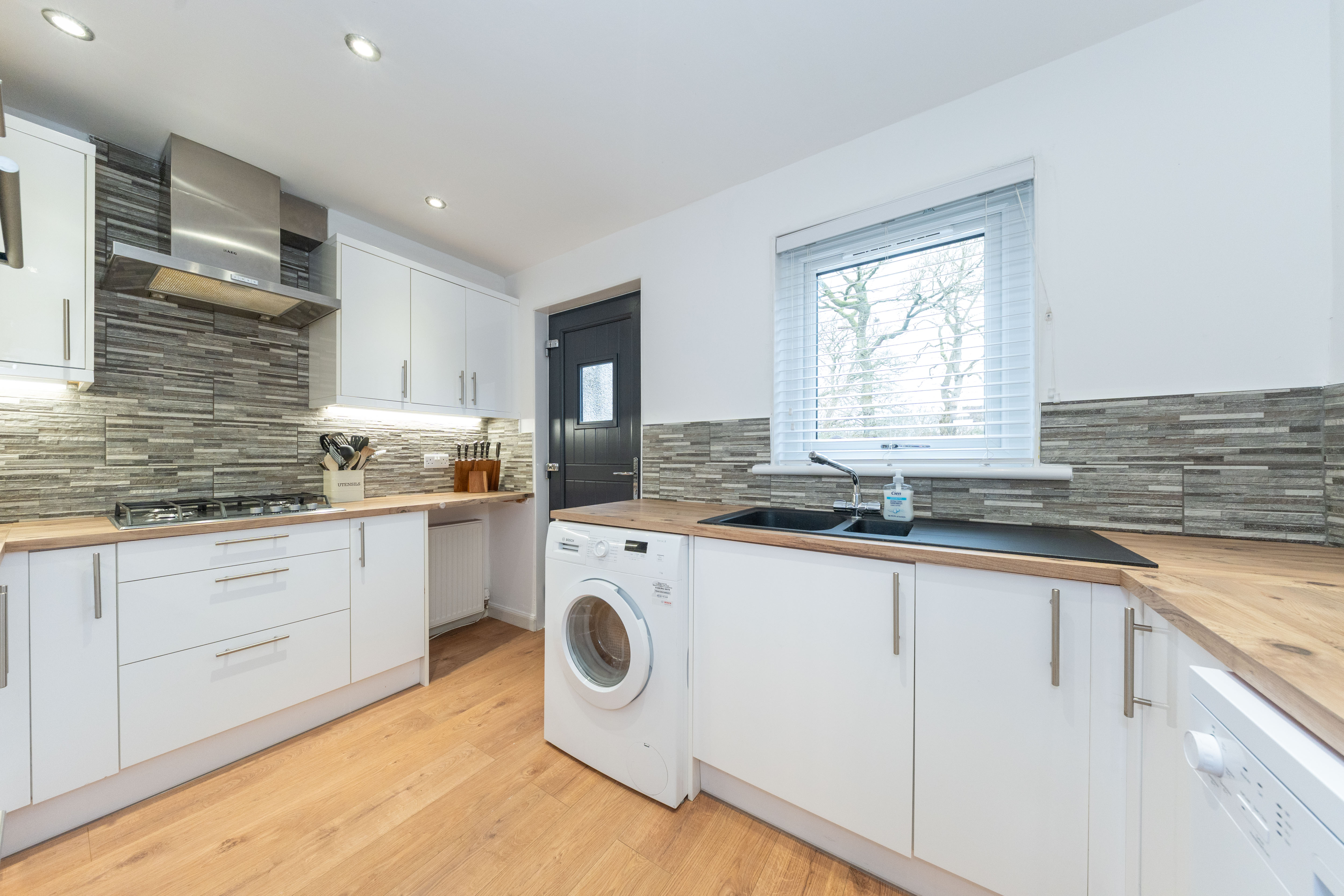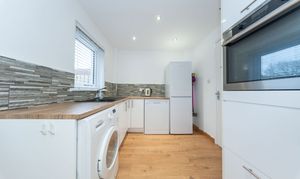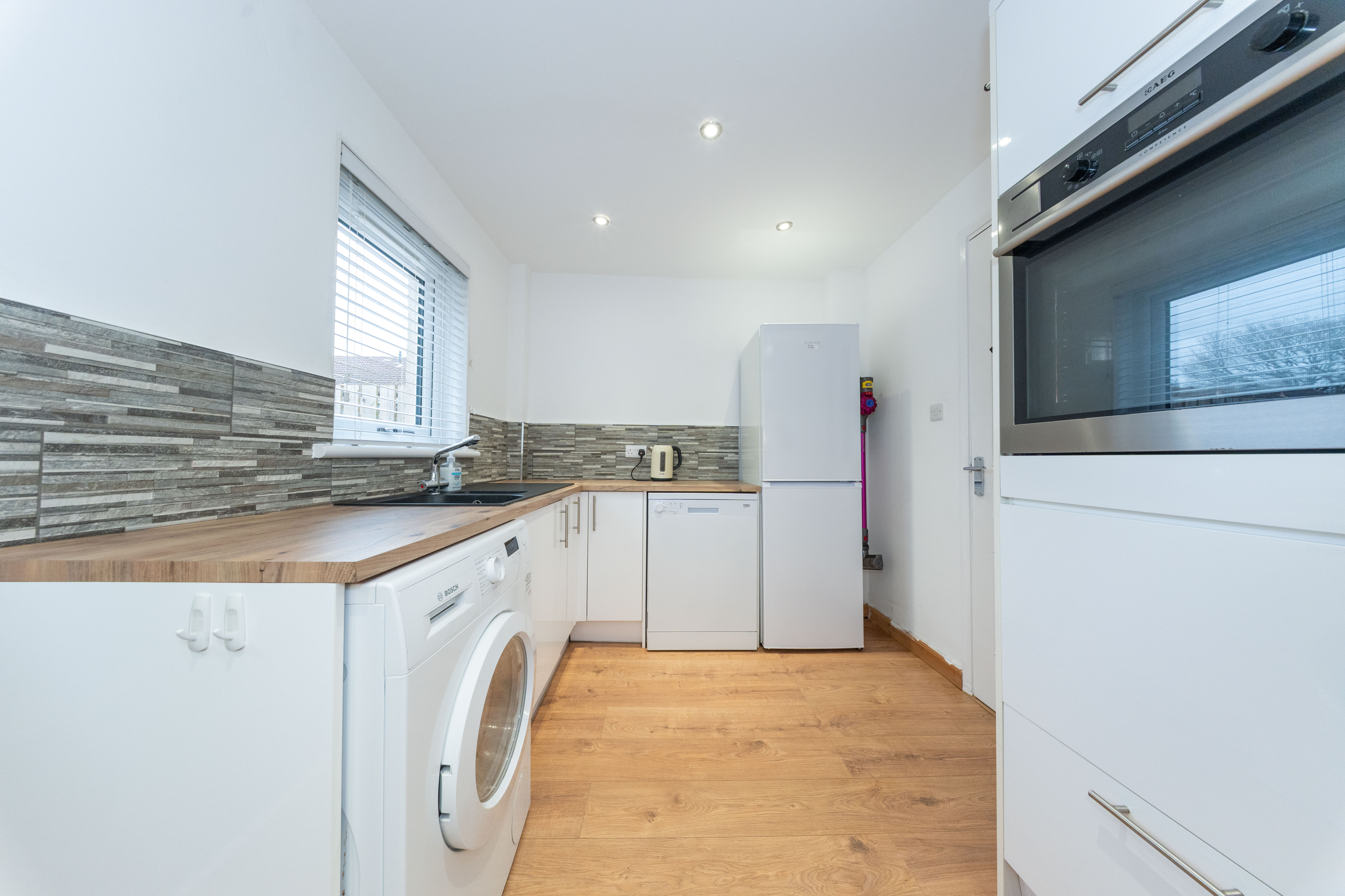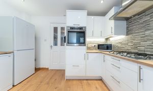 This thoughtfully designed kitchen strikes the perfect balance between style and practicality. It offers an excellent range of wall and floor mounted units with sleek white gloss fronts, beautifully complemented by wood effect work surfaces and a tiled splashback, creating a clean, contemporary finish. White painted walls and wood effect laminate flooring further enhance the bright, modern feel. The kitchen is well equipped with an eye level oven, four ring gas hob, stainless steel extractor hood, dishwasher, washing machine, and a tall fridge freezer, all included in the sale. A black sink with drainer and mixer tap is positioned beneath a rear facing window, allowing natural light into the space, while a part glazed upvc door adds to the airy feel and provides access outside. Downlights and under cabinet lighting create a warm, inviting ambience, and ample power points ensure everyday convenience.