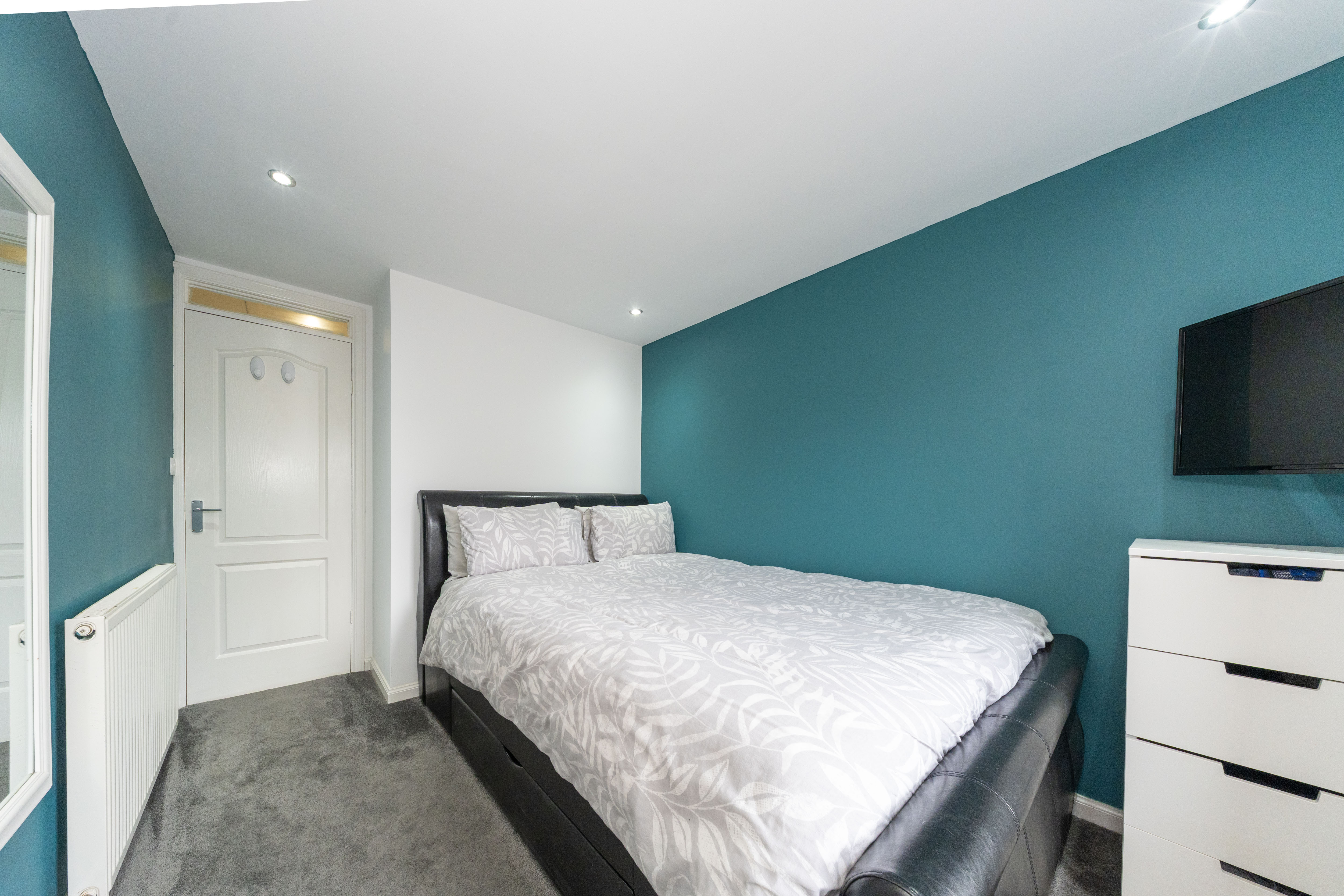 This charming room features white and green painted walls and cosy carpeted flooring. A built in wardrobe offers ample hanging and shelving space, enhancing the room's practicality. A front facing window fills the space with natural light, complemented by downlights for additional illumination. The room is equipped with a radiator and power points for comfort and convenience.