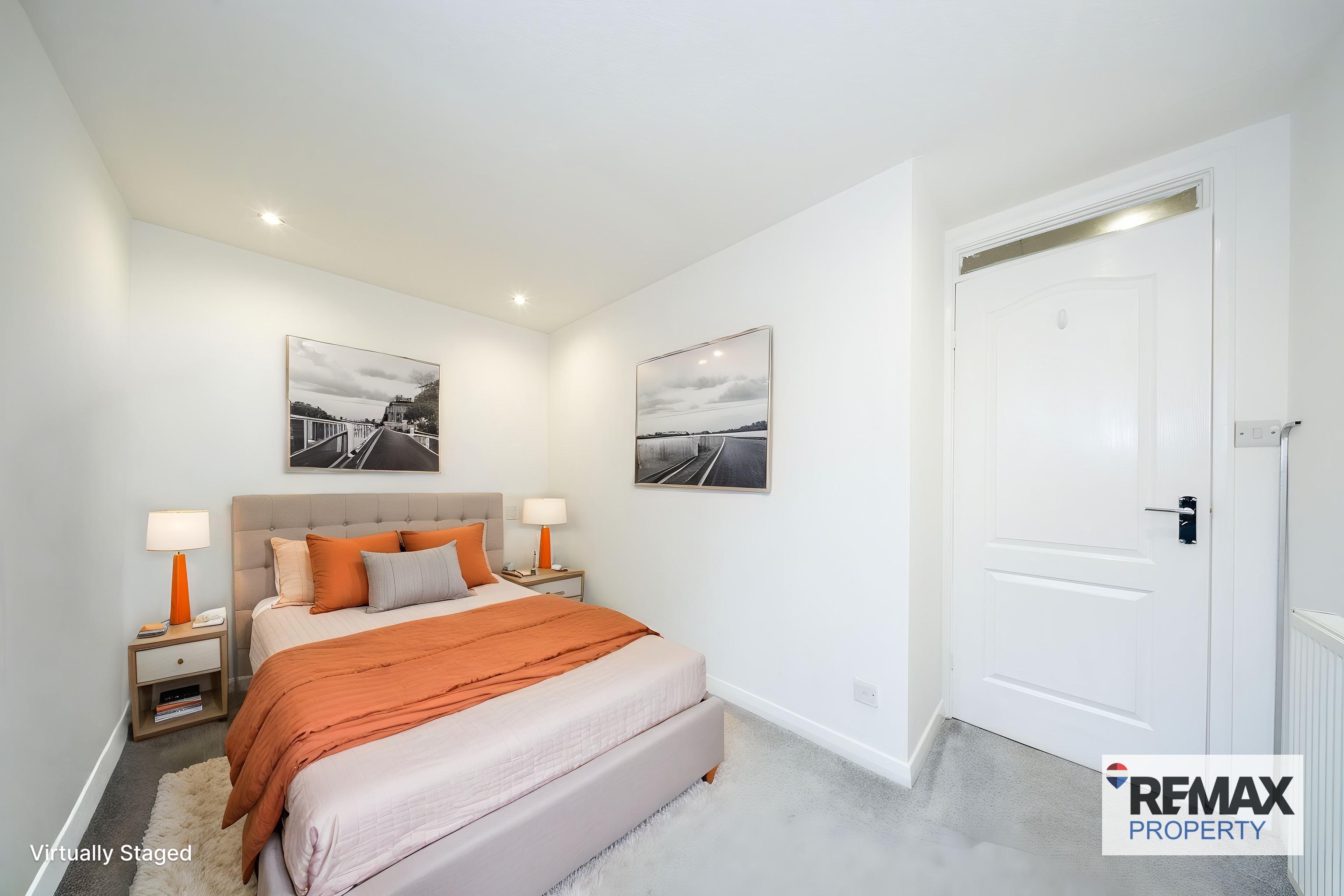 This great second bedroom is tastefully finished with fresh white painted walls and carpeted flooring, creating a warm and inviting ambiance. A rear facing window allows natural light to flood the room, complemented by downlights for a bright and airy feel. The room is further equipped with power points and a radiator.