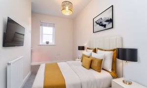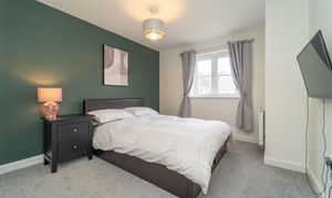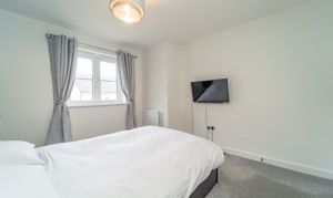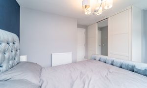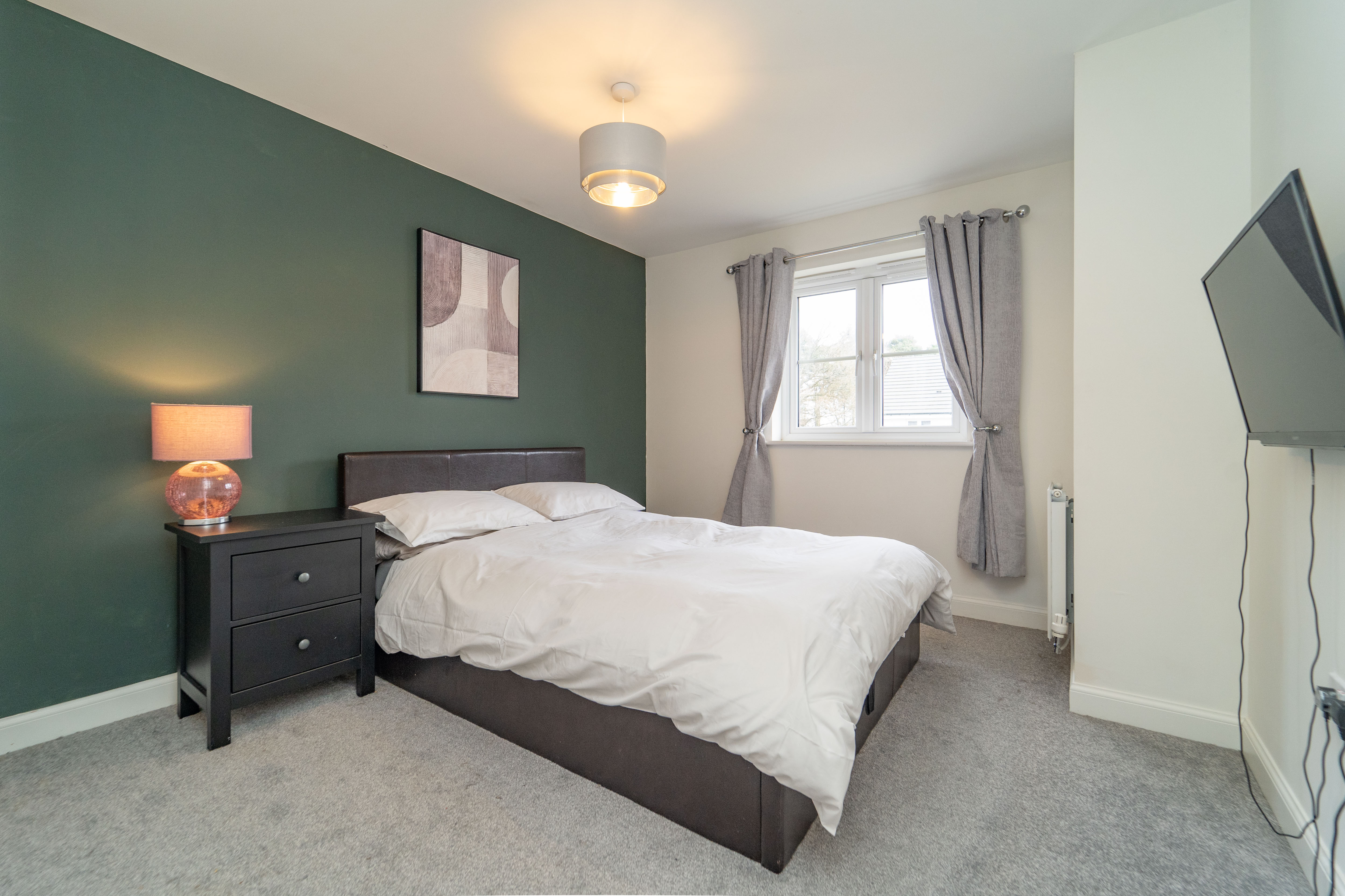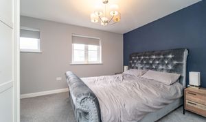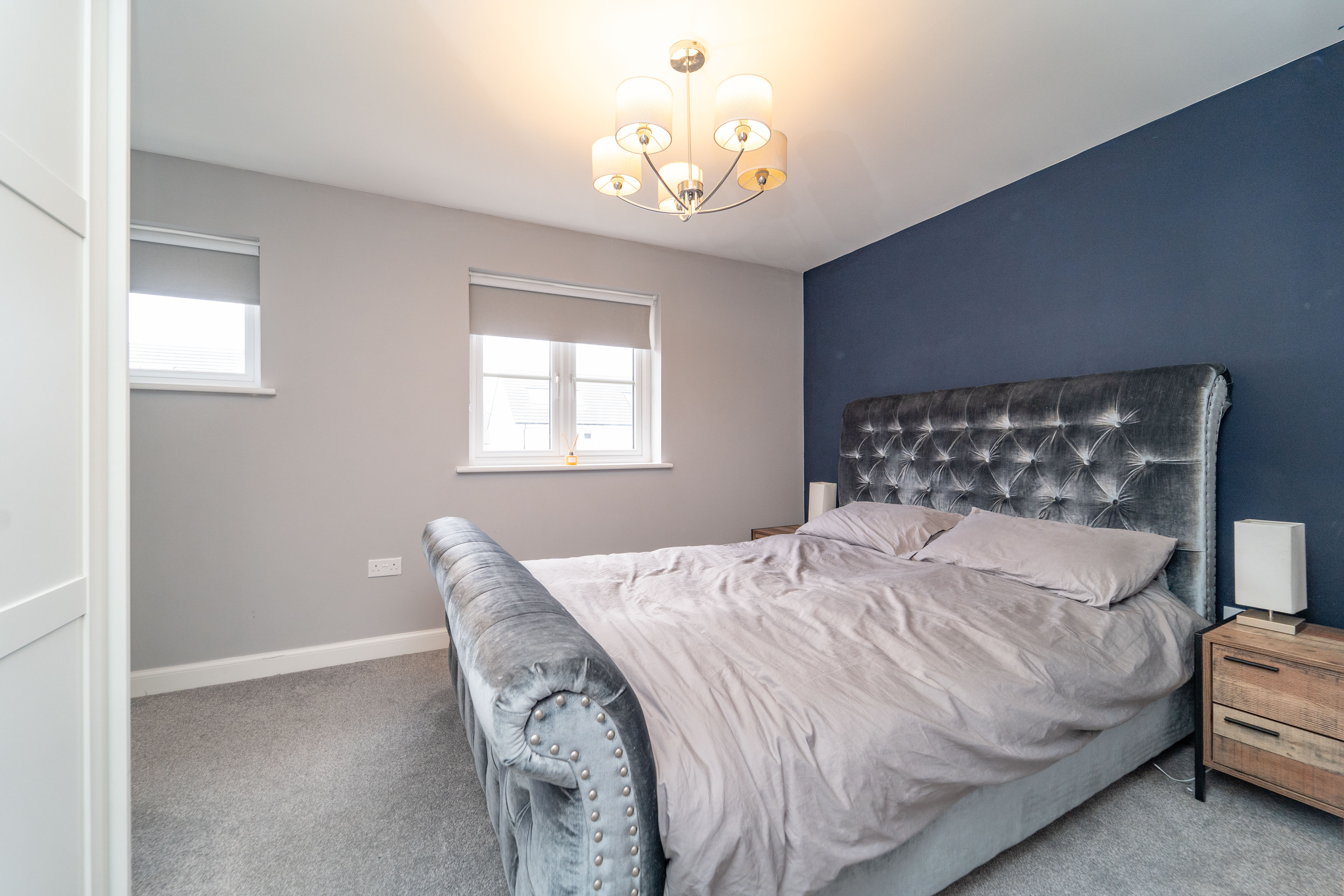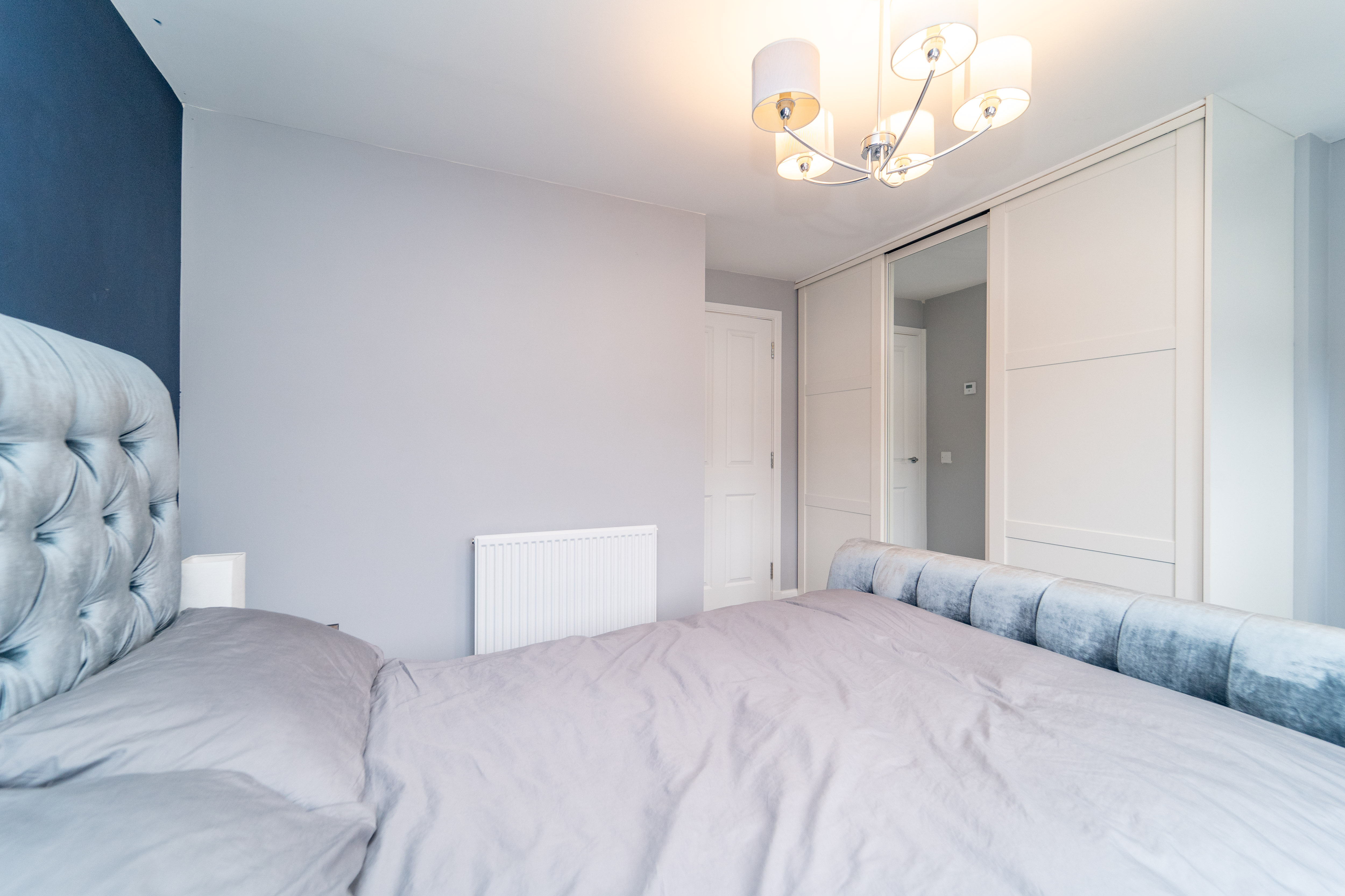 Dimensions: 13' 3'' x 12' 7'' (4.05m x 3.84m). Bedroom 1 is a King-sized room and has been freshly decorated. There is a striking Midnight Blue feature wall – giving a sense of tranquillity & relaxation – there is also a large, front facing window which allows an abundance of light in.