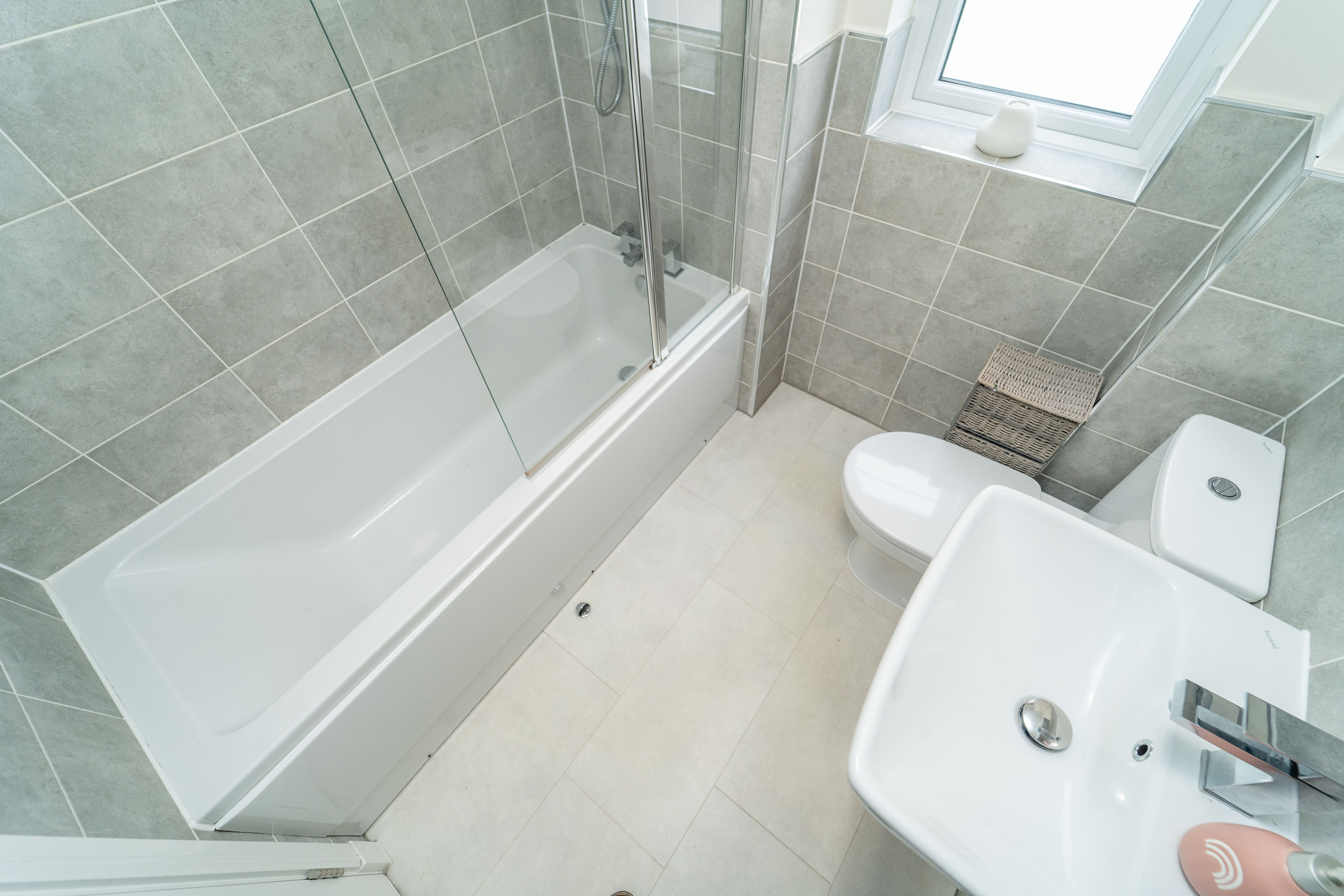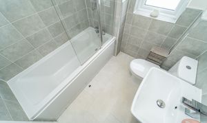 Dimensions: 6' 8'' x 6' 7'' (2.02m x 2.00m). The chic & sizeable family bathroom has been fully upgraded and boasts a luxurious bathtub, wash hand basin and W.C. There is stylish, textured tiling and a glazed window.