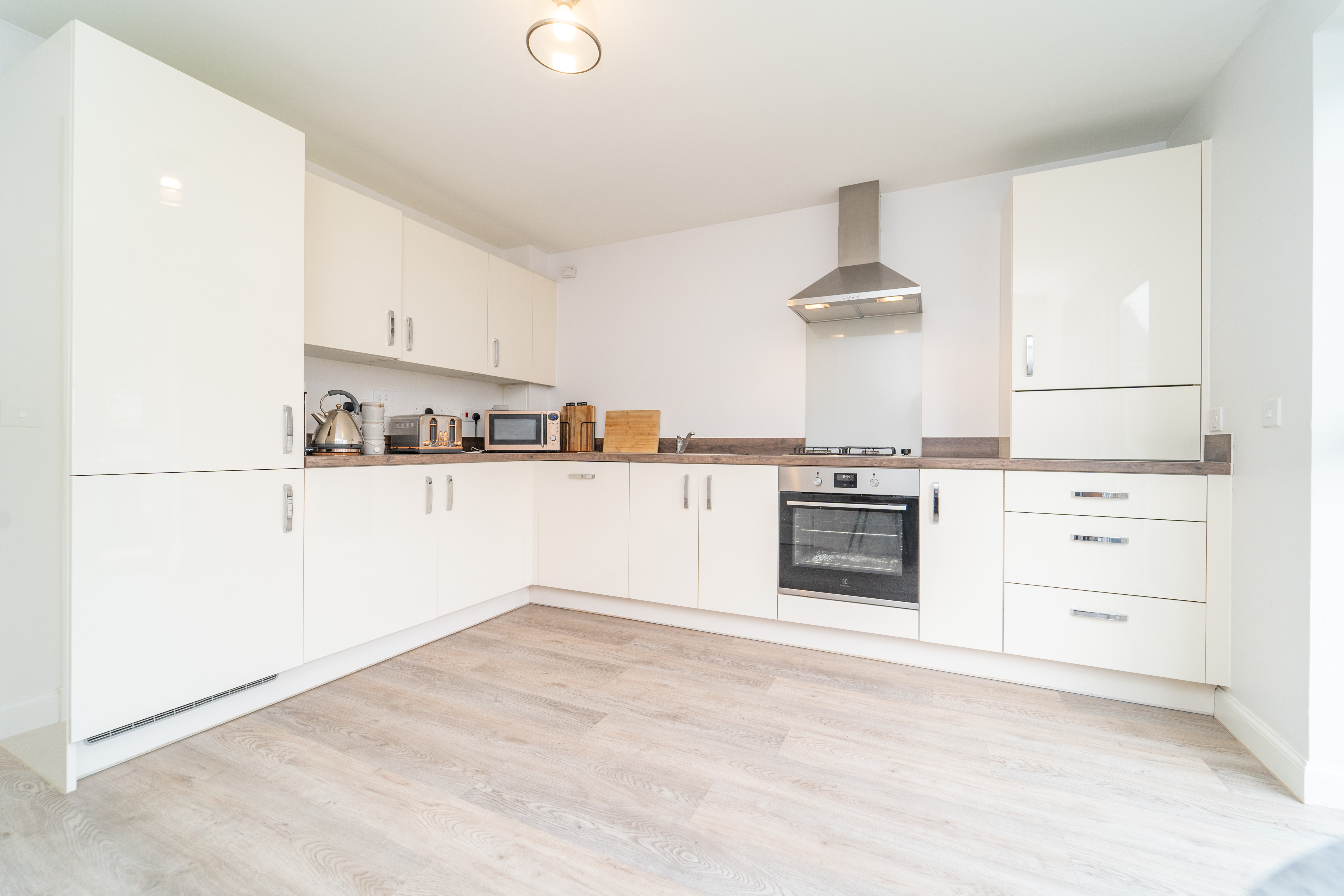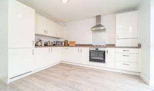Dimensions: 12' 2'' x 12' 1'' (3.71m x 3.69m). The modern kitchen boasts an excellent range of base & wall mounted high gloss units, complete with contrasting worktop and laminate flooring. There are patio doors leading spilling onto the rear, which offer a great sense of connectivity and in turn bathes the room with sunshine. A host of neatly integrated appliance accompany the room along with space for dining furniture.