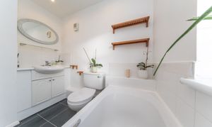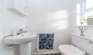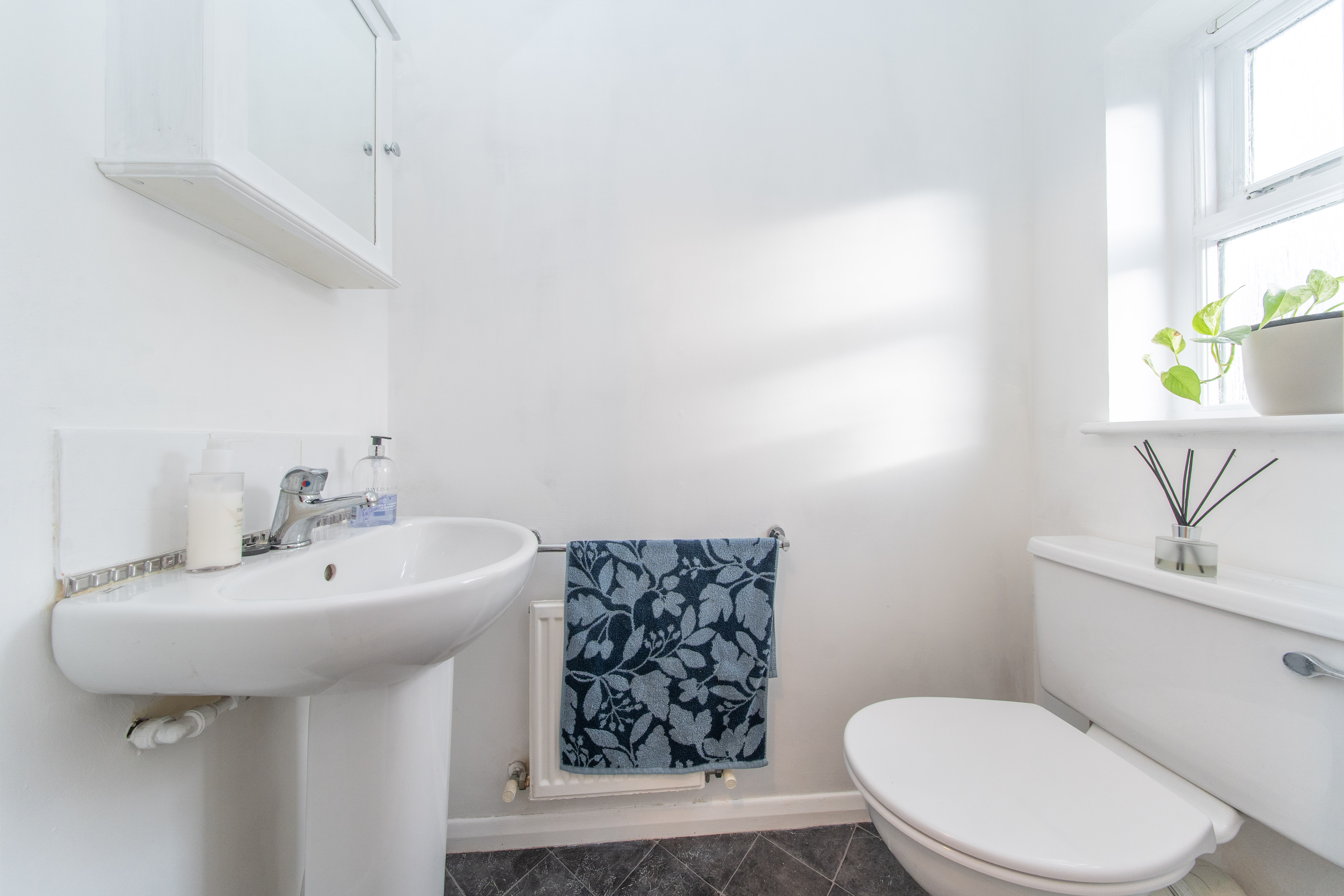 1.641m x 0.824m (05’04” x 02’08”) A cosy room which features vinyl flooring and white painted walls. A window to the front of the property, provides natural daylight, being enhanced by a ceiling light. The suite includes a white pedestal sink and a white close coupled toilet. A wall mounted medicine cabinet and a radiator complete the room.