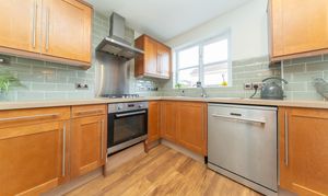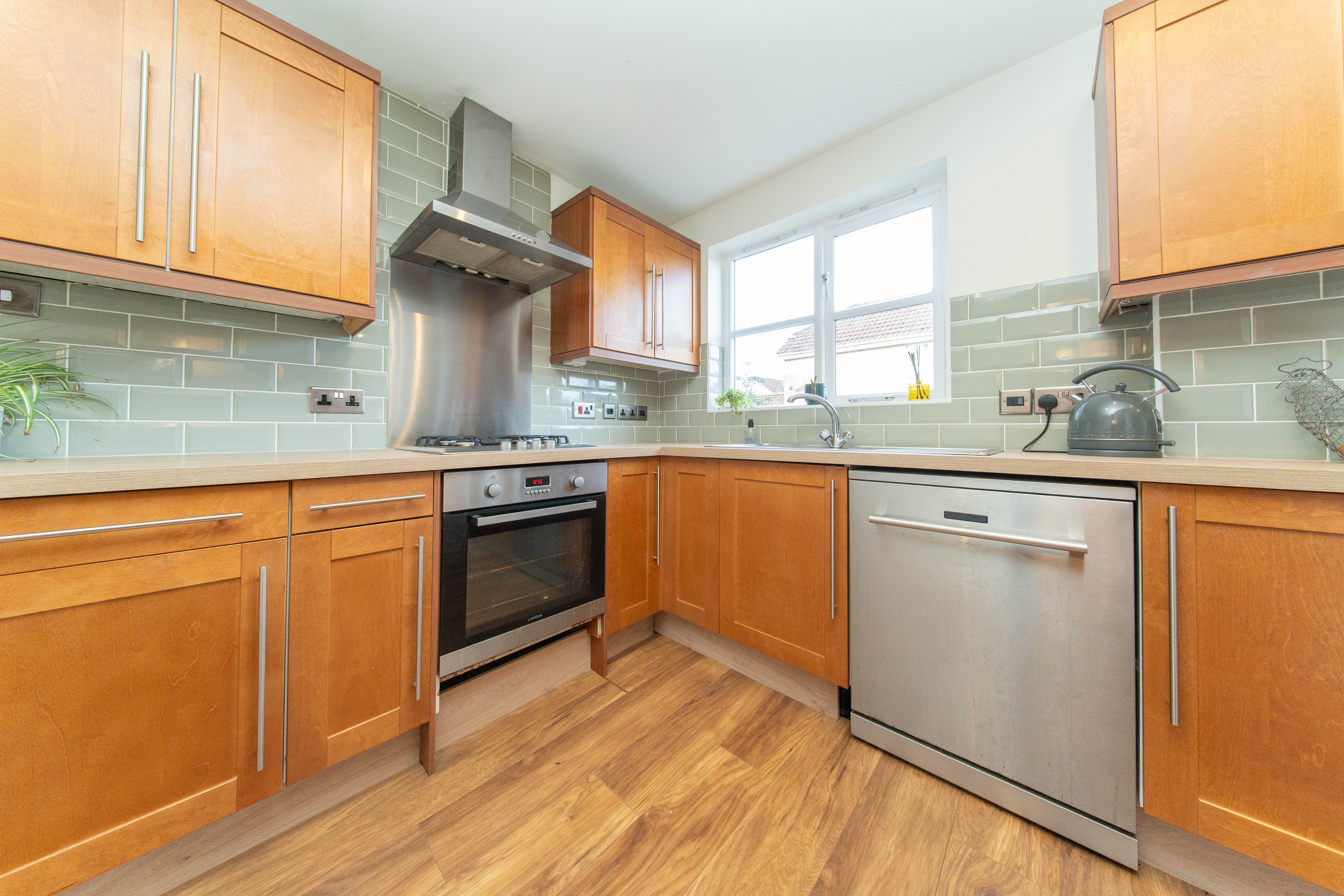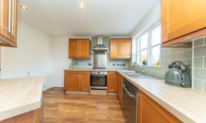 4.948m x 3.427m (16’02” x 11’02”) This delightful room offers a generous amount of wooden fronted units with co-ordinating work surfaces. The décor continues with a modern metro-tiled splashback, white painted walls and laminate flooring. A 4-ring gas hob, an electric oven, a cooker hood, a dishwasher and a freestanding American-style fridge freezer, will all be included in the sale. The room benefits from recessed downlights providing bright, even lighting, plus double doors offering direct access to the garden and allowing in natural light. A one and a half stainless steel sink with drainer sits beneath the rear facing windows to provide an open outlook. Additional storage is available in a large understairs cupboard. Two radiators and multiple power points are included.