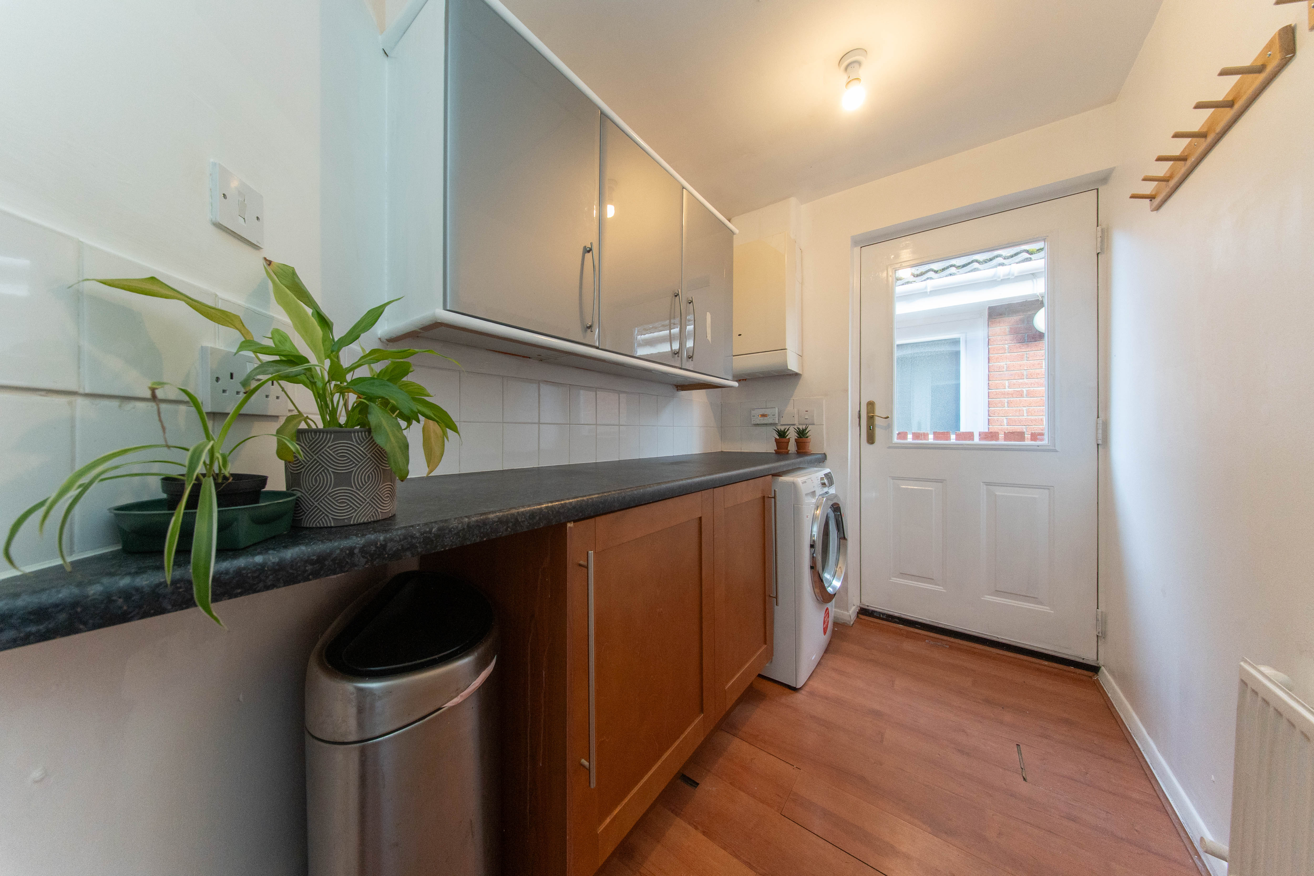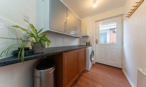 2.662m x 1.589m (08’08” x 05’02”) A practical room fitted with wooden base units offering excellent additional storage. Decorated with white painted walls and laminate flooring with a complementary worksurface and tiled splashback. There is under counter space for a washing machine, that can be negotiated in the sale. A ceiling pendant light, a radiator, attic access and a rear door providing access to the exterior finish the room.