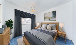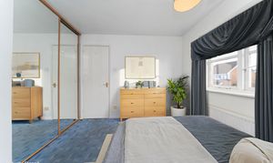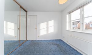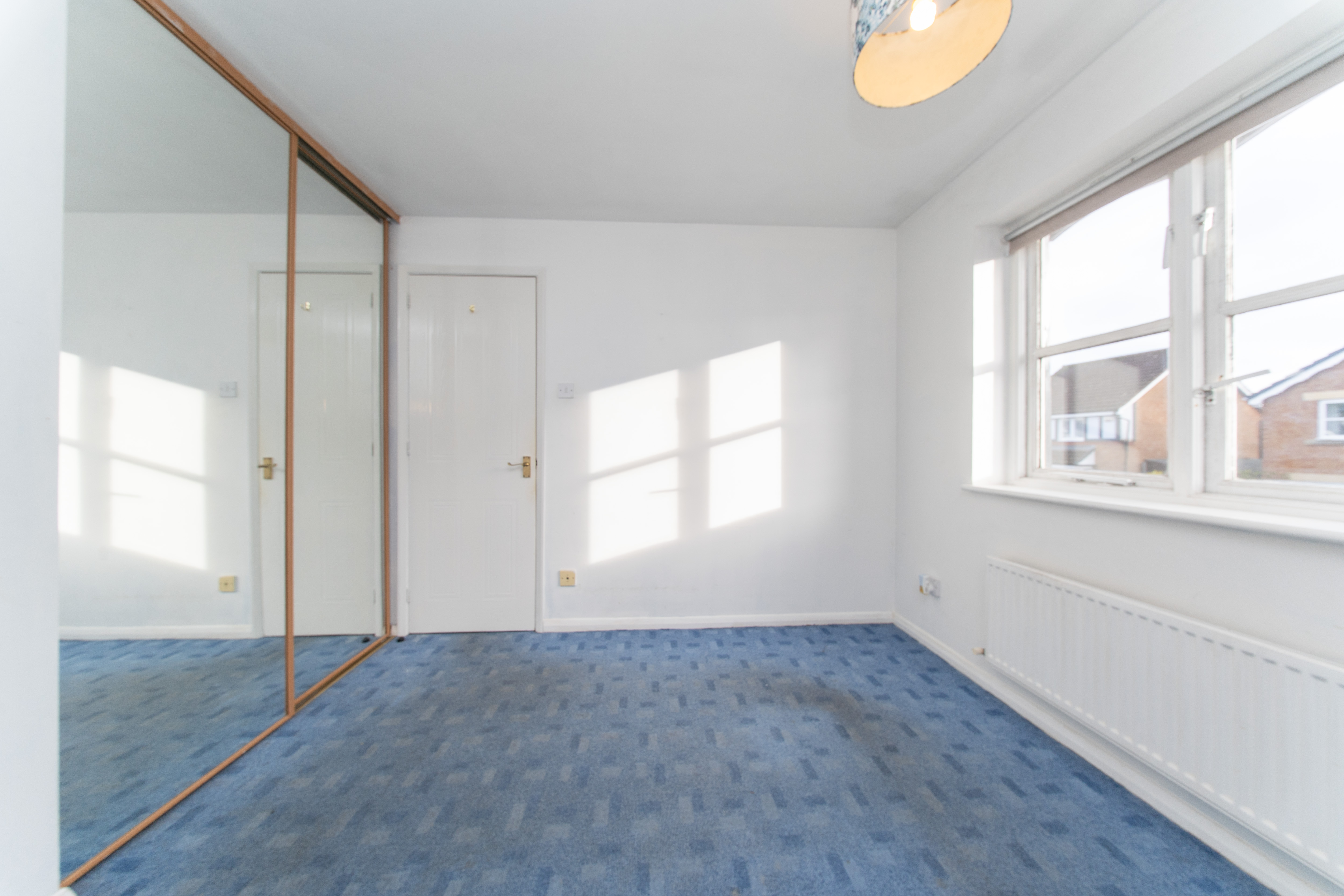 2.789m x 2.773m (09’01” x 09’01”) This double room features a blue patterned carpet and white painted walls. A built-in wardrobe with two mirrored sliding doors provides useful storage. The windows overlooking the front, allow plenty of natural light into the room. A ceiling pendant light, power points, a television aerial socket and a radiator are provided.