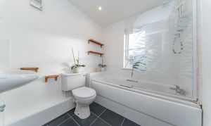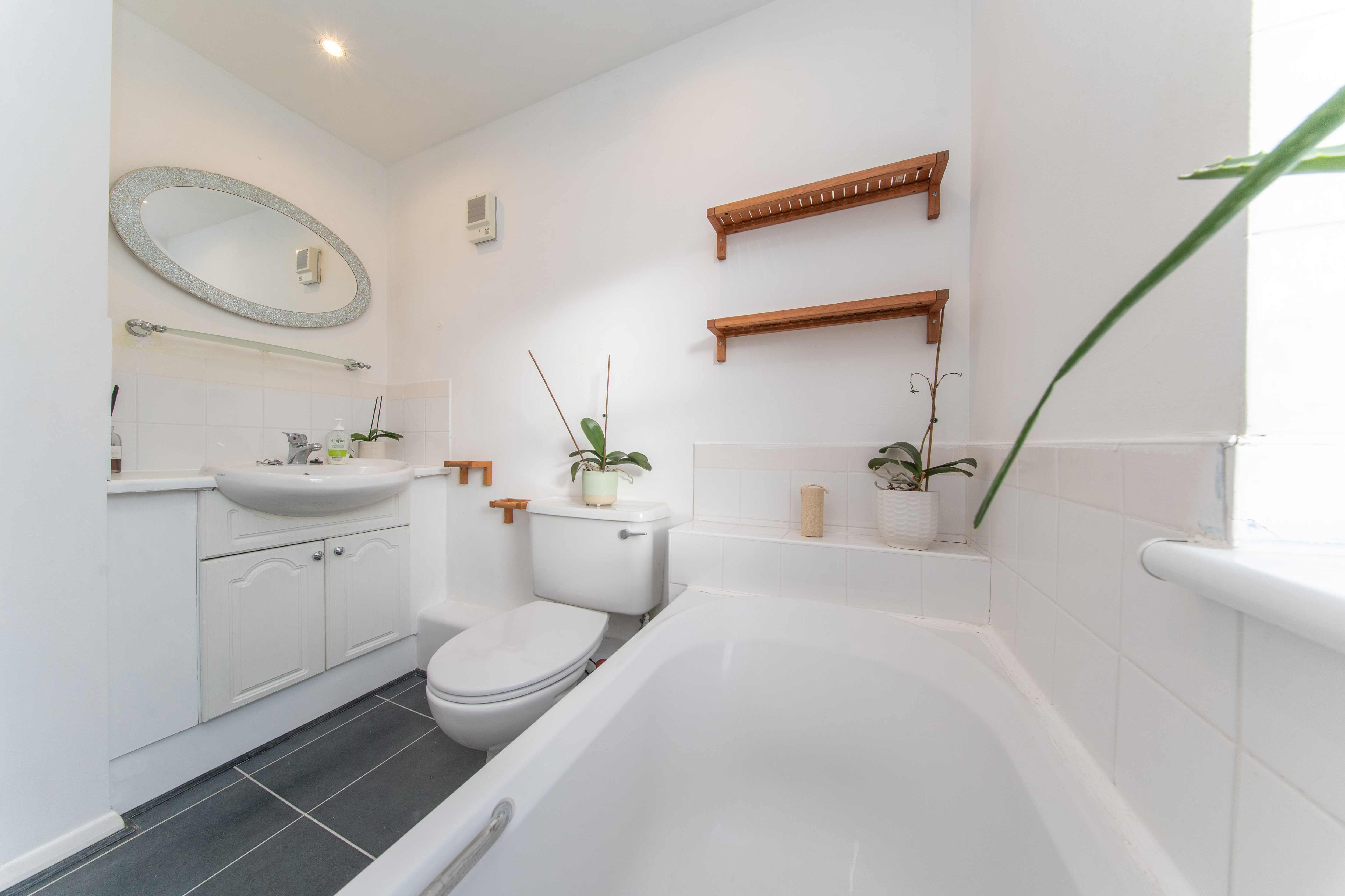 2.345m x 1.895m (07’08” x 06’02”) A well-proportioned room featuring a three-piece suite consisting of a bath with wall-mounted electric shower, a sink set within a vanity unit providing useful storage and a toilet. The sink and bath areas are finished with white tiled surrounds, complemented by white painted walls. Additional features include grey tile flooring, recessed ceiling downlights, a radiator, and a frosted glazed window to the front, allowing natural light in, whilst maintaining privacy.