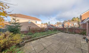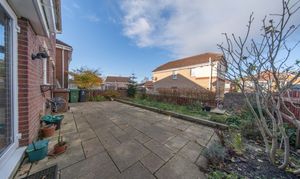 A private garden offers a generous paved patio directly outside the back door, ideal for outdoor seating or entertaining. Beyond the patio lies a lawned area bordered by established planting, providing colour and interest throughout the year. The space is fully enclosed by wooden fencing for privacy and security, with a paved path leading around the side of the property for convenient access.