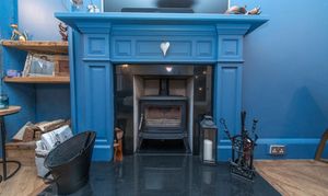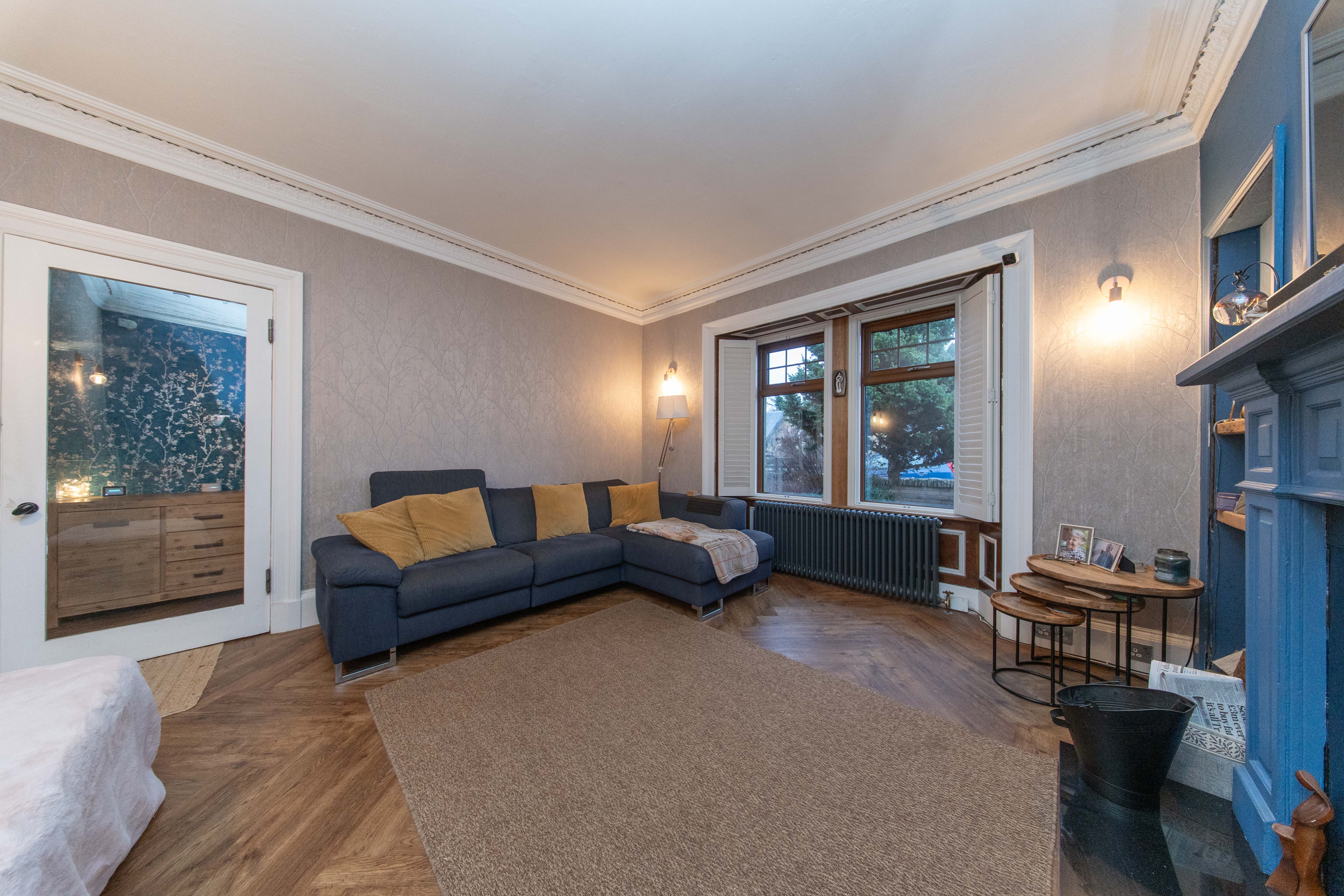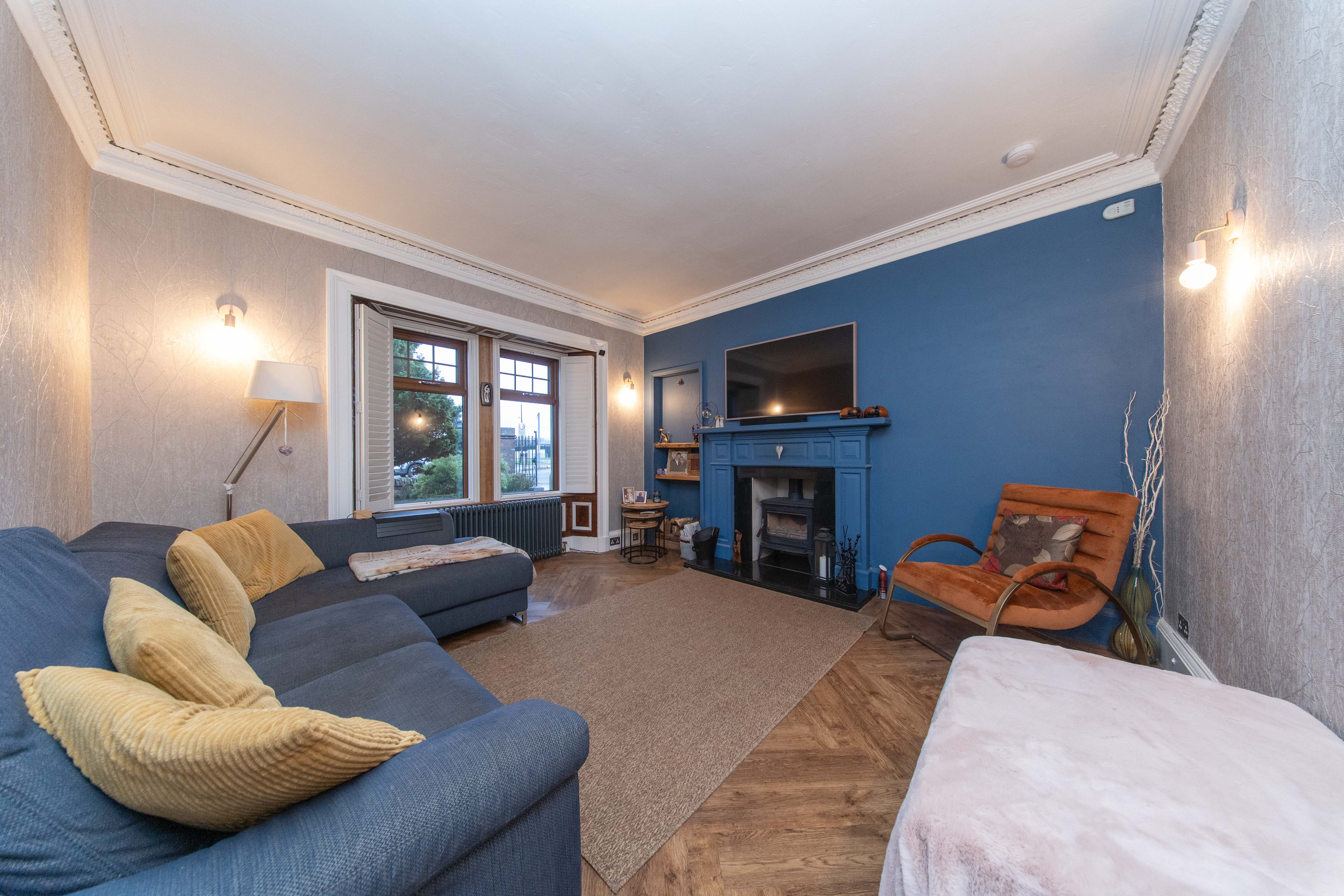 A stunning, generously proportioned lounge featuring luxury vinyl flooring and an attractive log burner as a focal point. Elegant cornicing enhances the character of the room, while a large front-facing window with shutters floods the space with natural light.