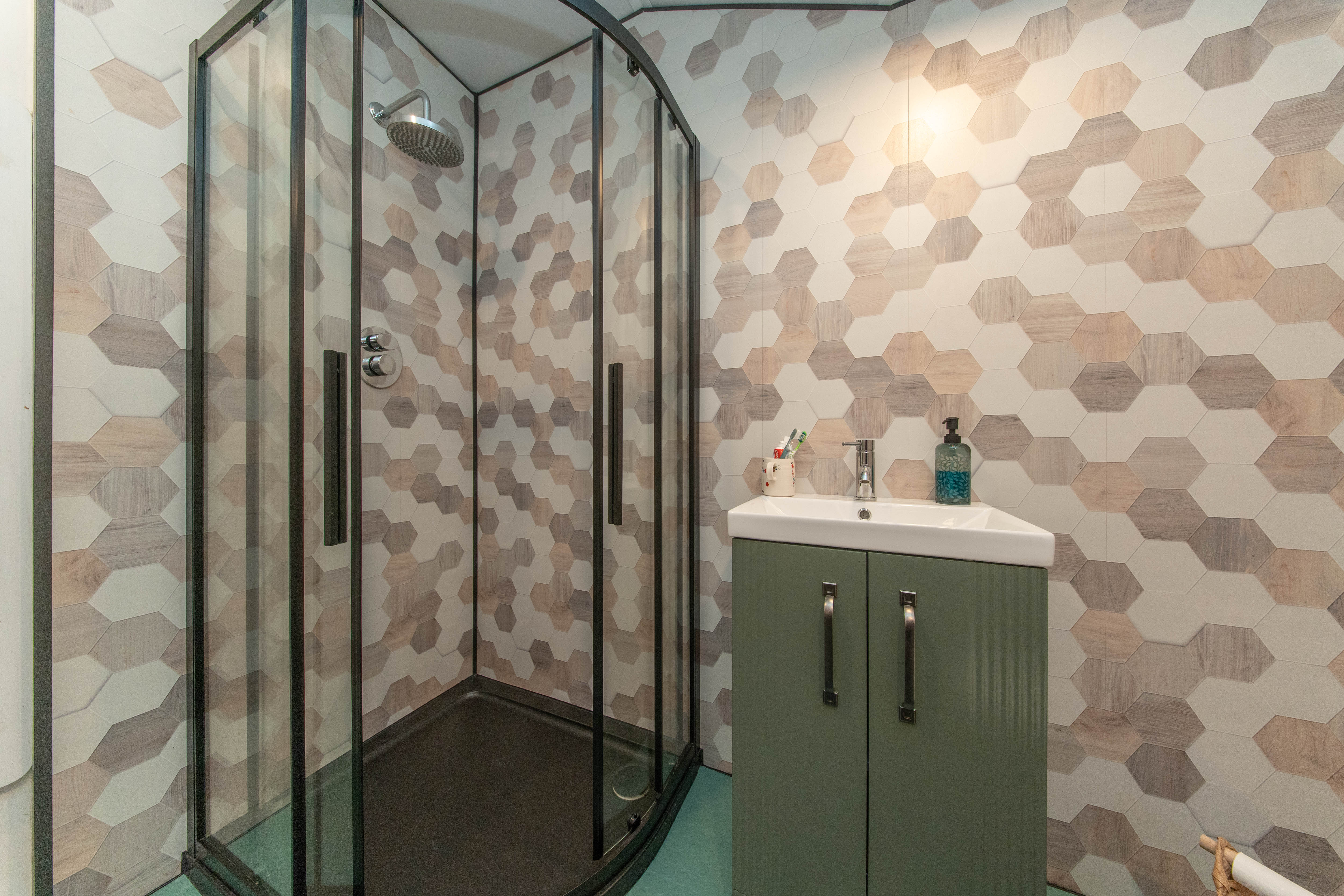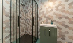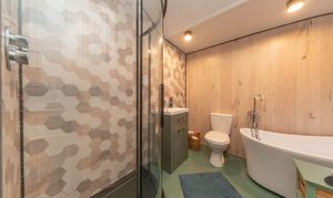 A sleek and stylish bathroom finished to a high contemporary standard, featuring a glass-enclosed shower with a luxurious rainfall shower head. The space is complemented by a modern vanity unit with integrated basin and WC, offering both style and practicality. A striking freestanding bath takes centre stage, complete with a handheld shower attachment.