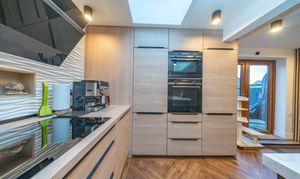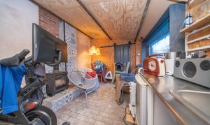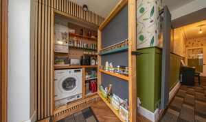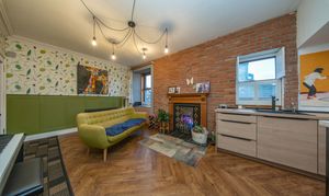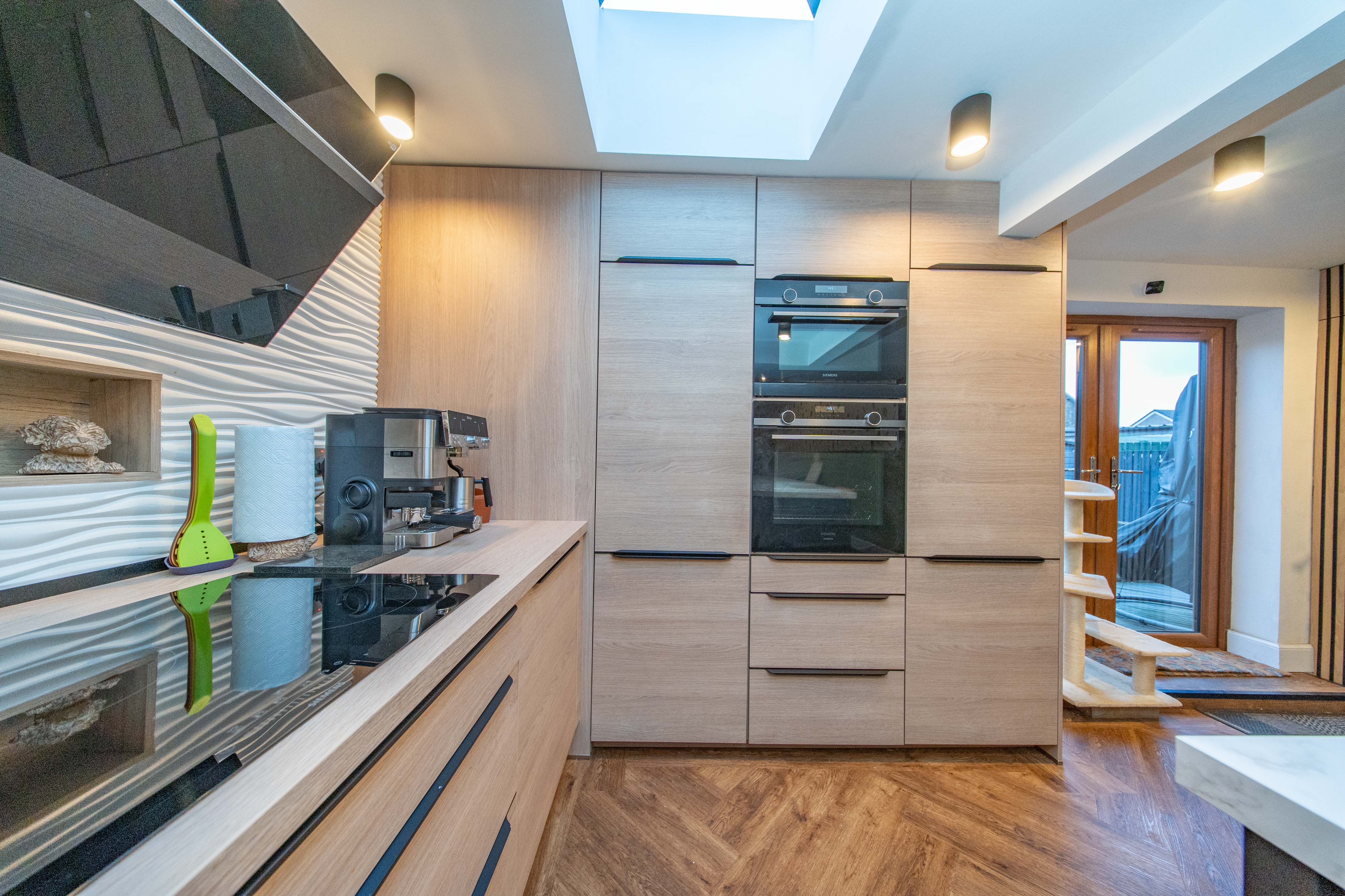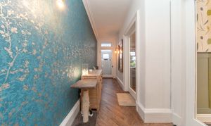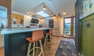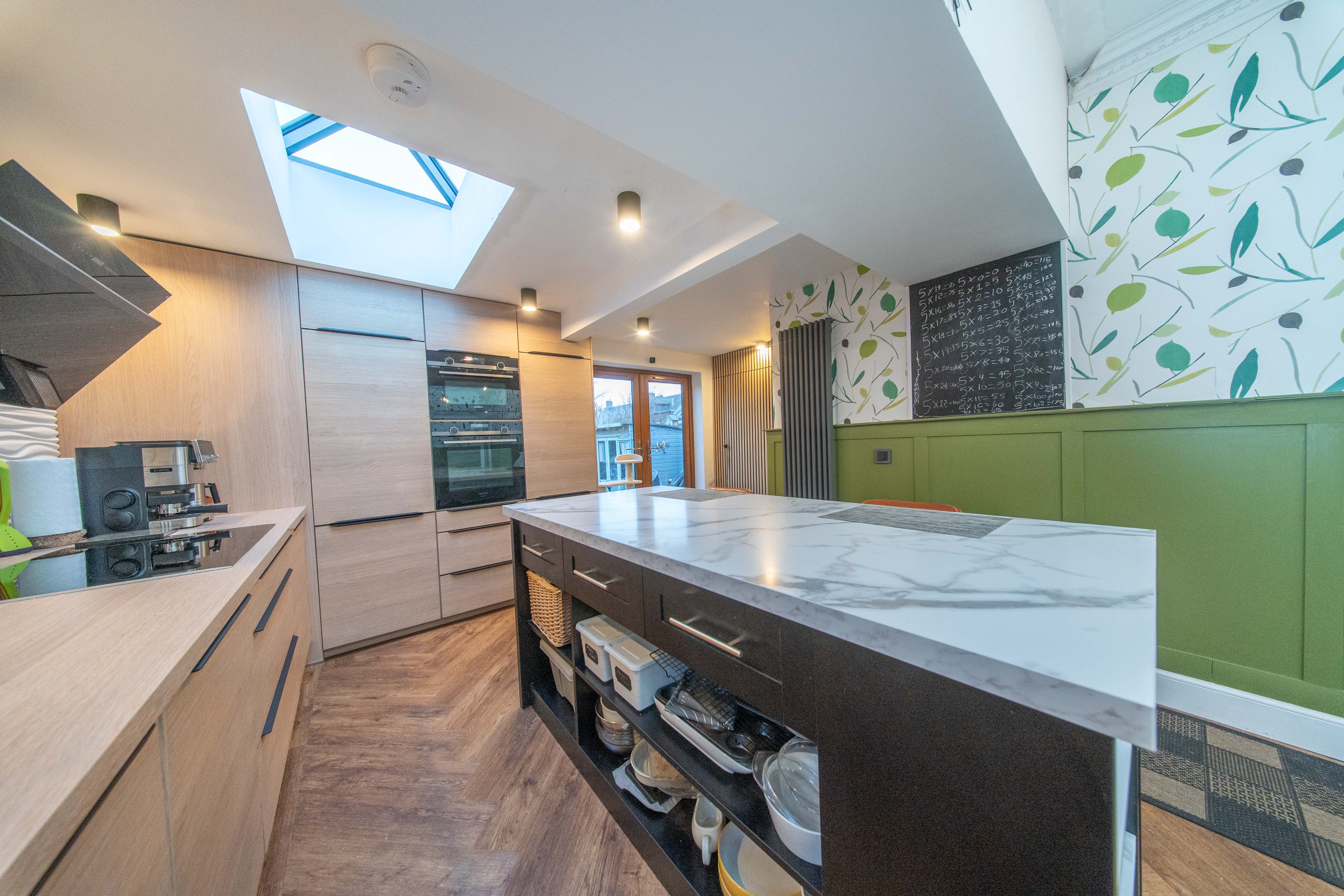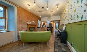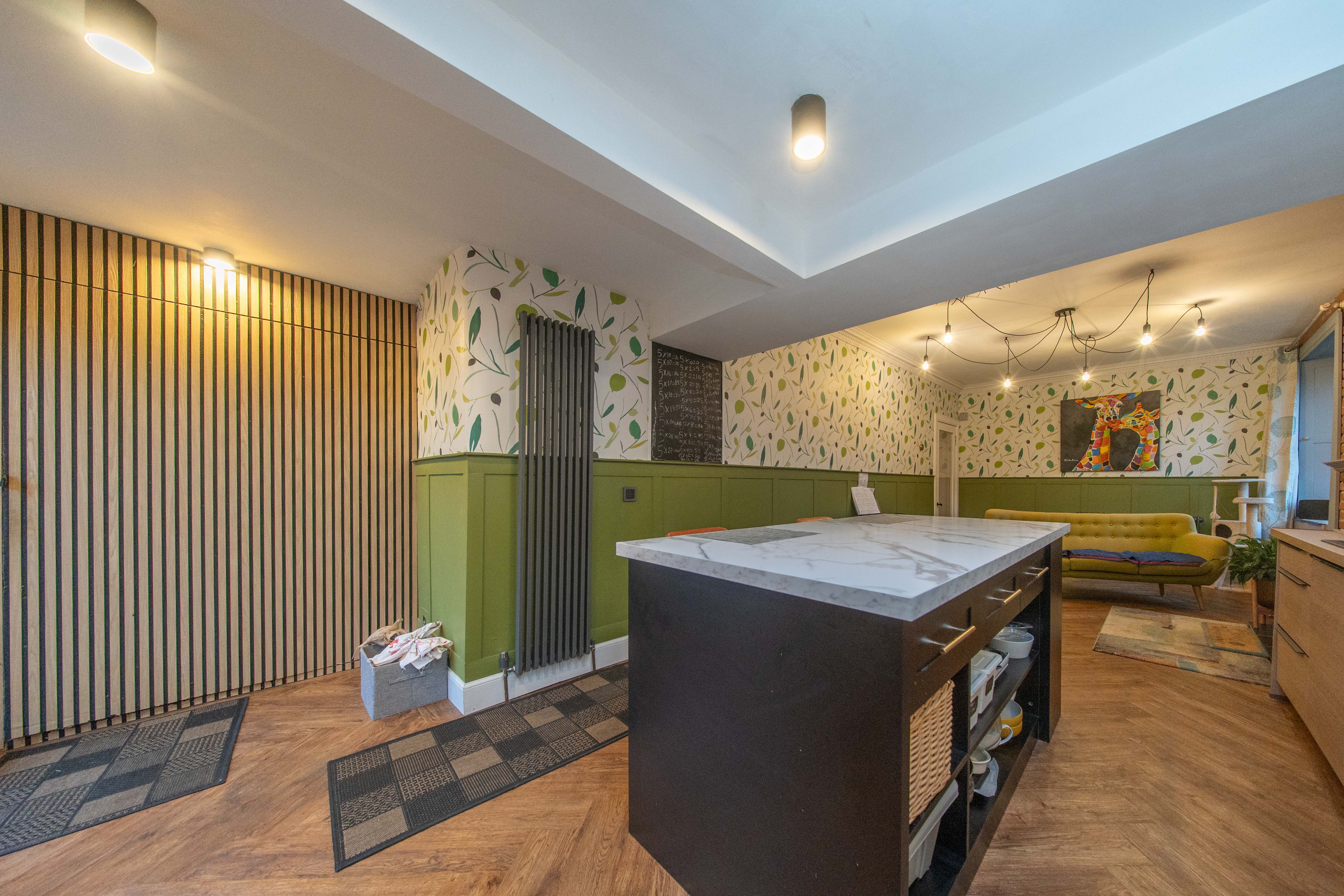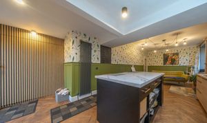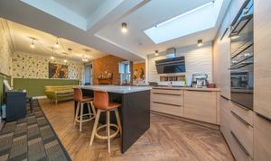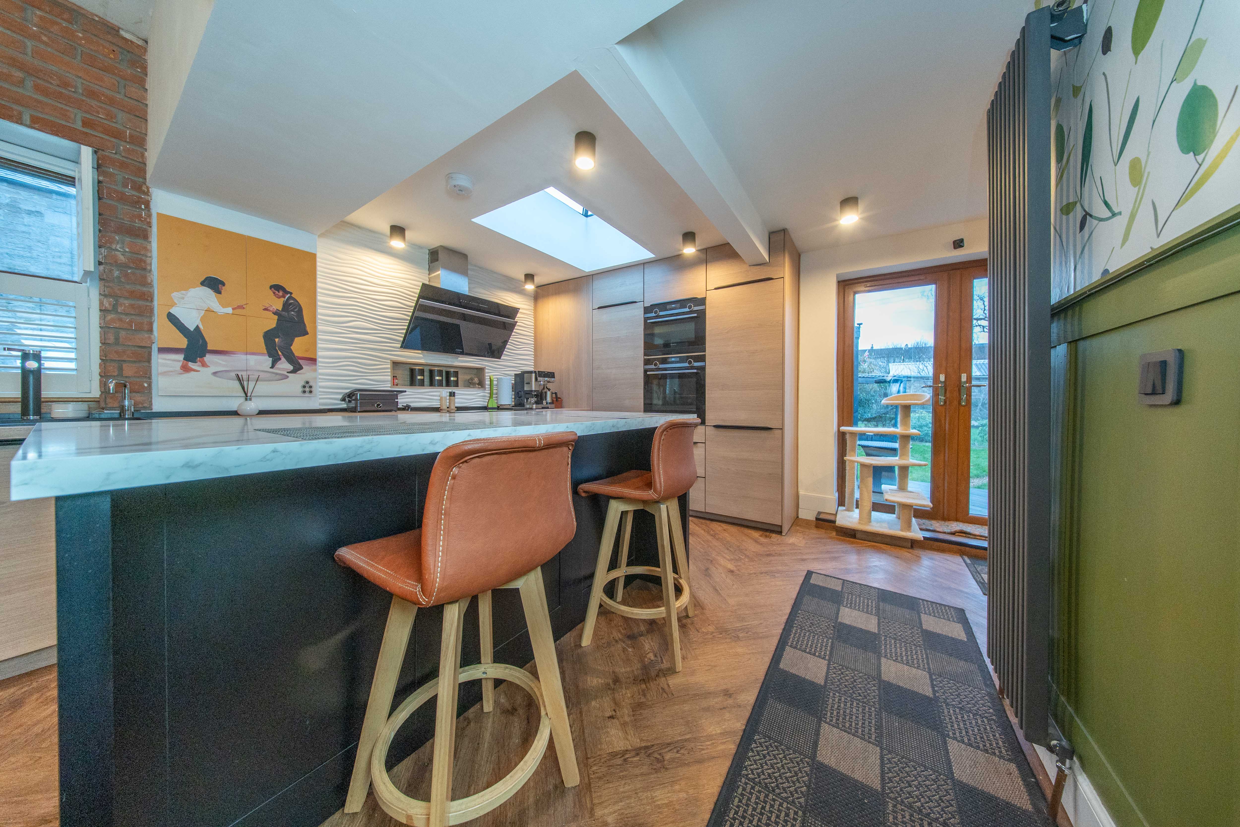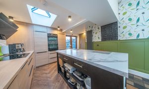 A very spacious and charming designer kitchen/diner/family room, beautifully finished with luxury vinyl flooring throughout. The room features a stylish breakfast island, an excellent range of wall and base units, and a striking feature fireplace set against an exposed brick wall along with an impressive skylight. Patio doors open directly onto a substantial rear garden, making this an ideal space for both family living and entertaining.