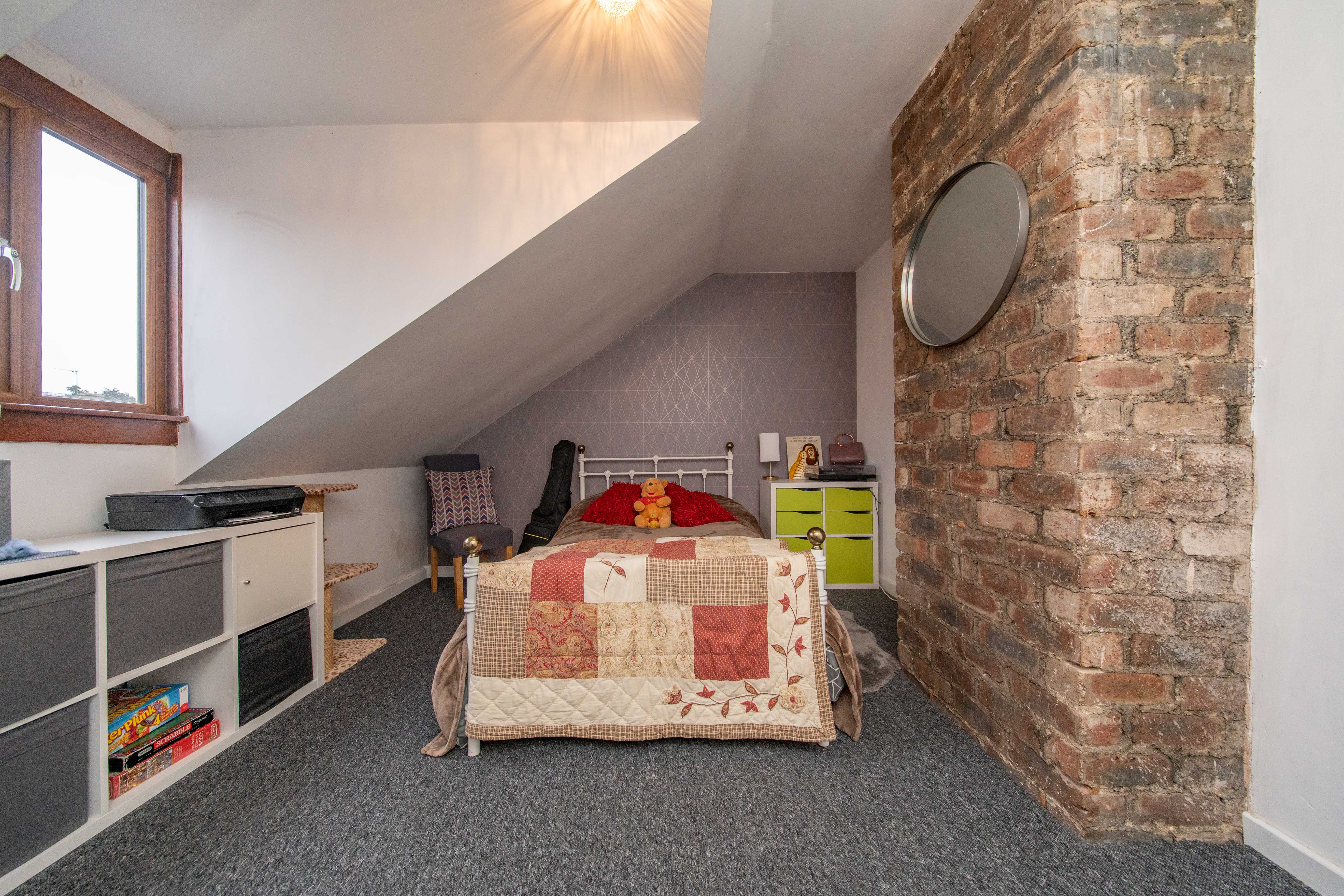 This spacious double bedroom is beautifully finished with plush carpeting, a designer radiator, and an eye-catching brick feature wall. A rear facing window bathes the room in natural light, with peaceful views over the expansive garden.