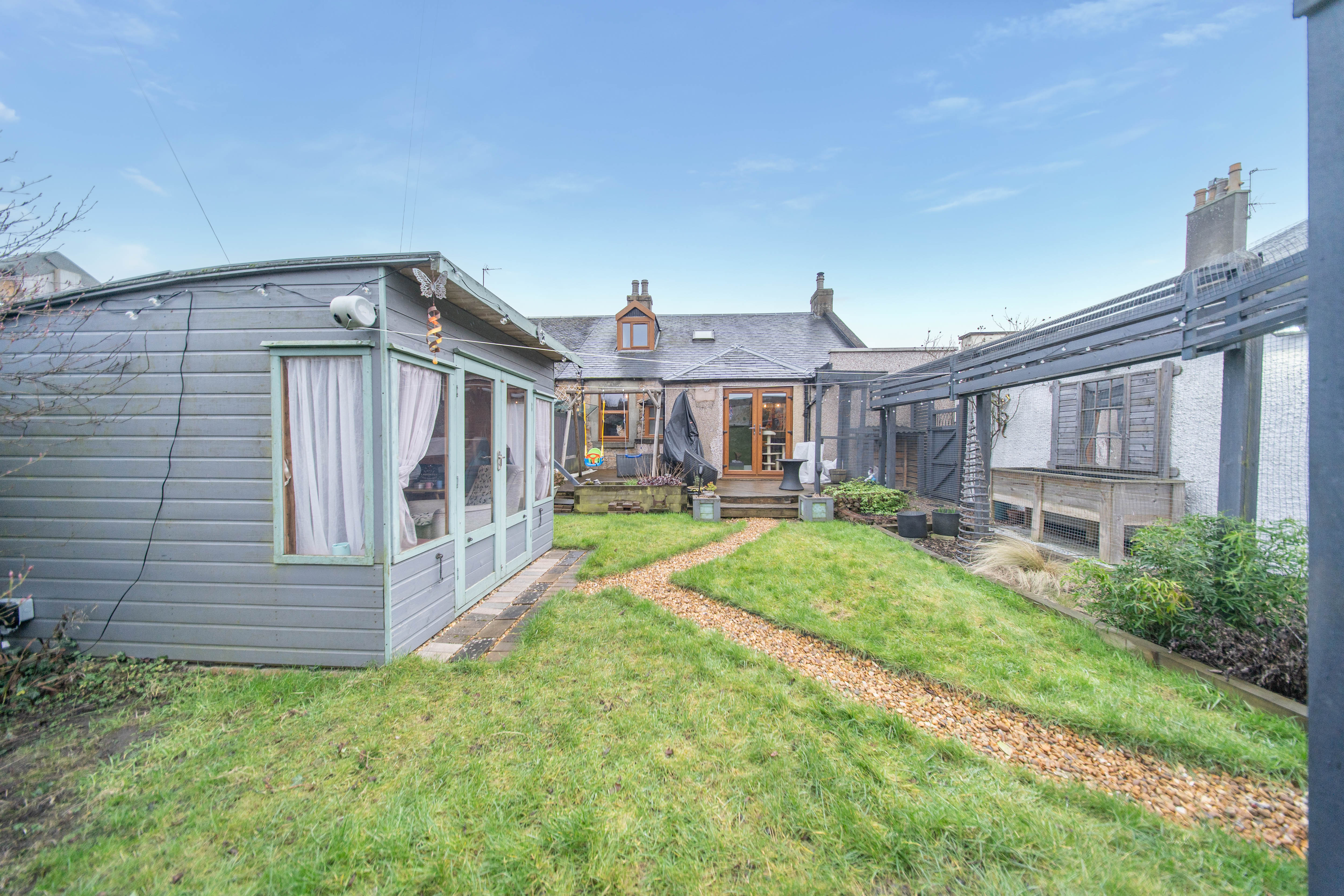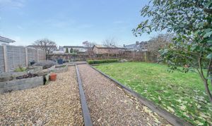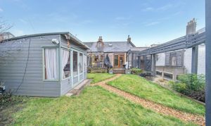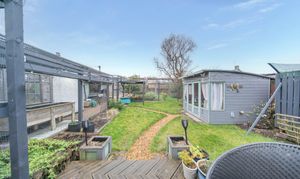 The property boasts a very impressive, fully enclosed rear garden offering a generous decking area ideal for outdoor entertaining, complemented by outbuildings and a cosy snug. The laid lawn is surrounded by an attractive variety of trees, shrubs, and plants, creating a private and tranquil setting.