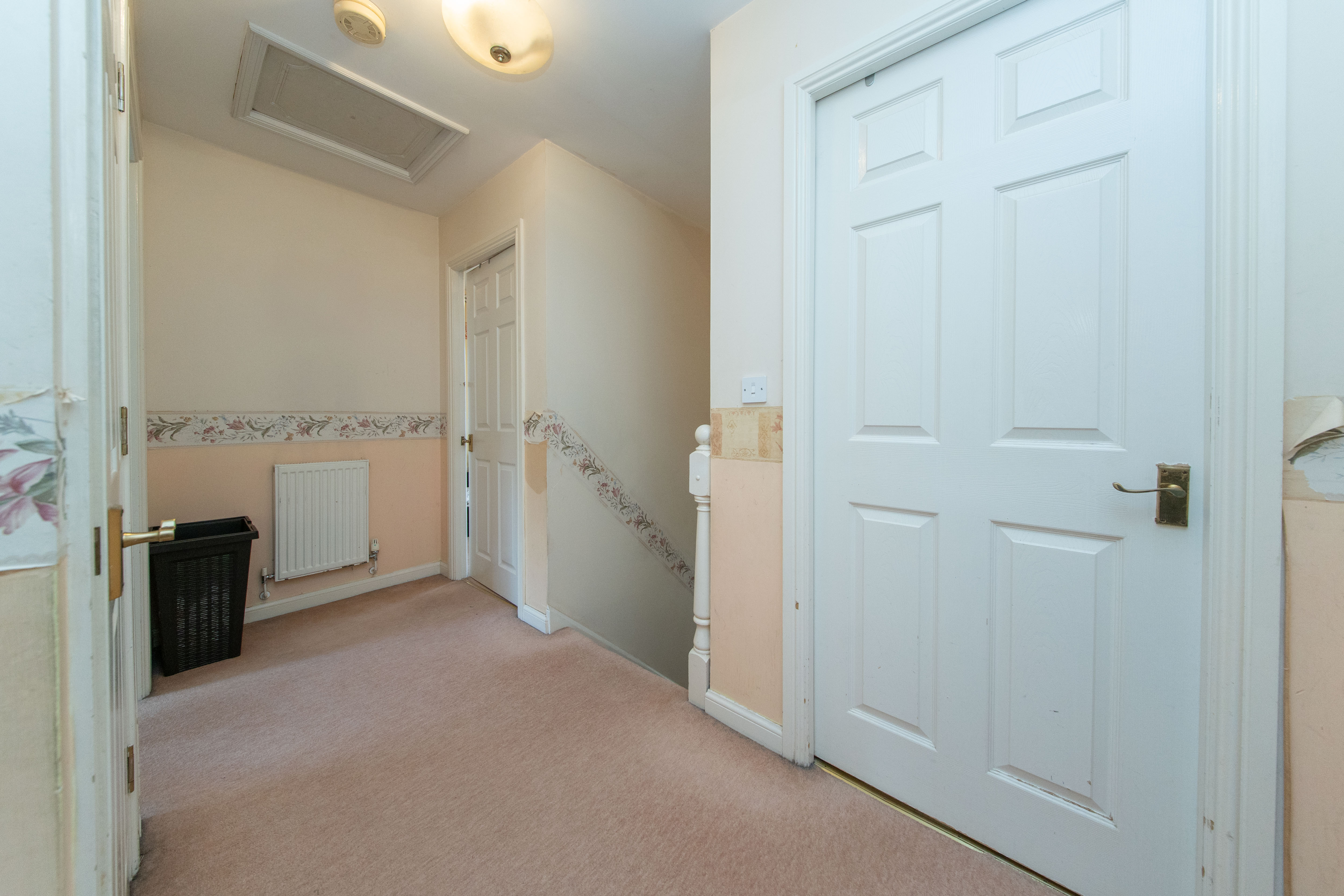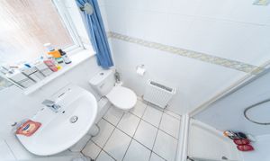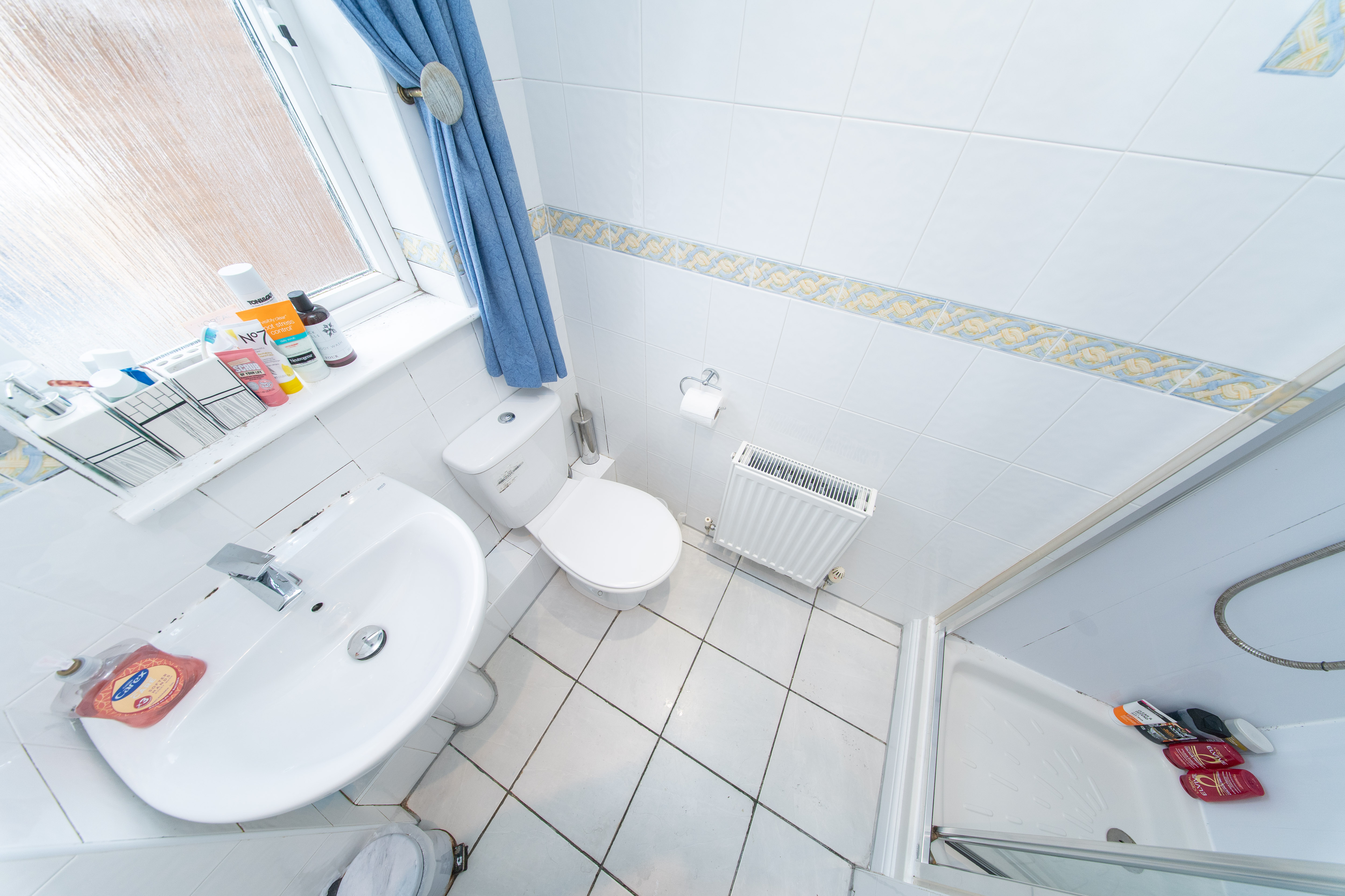 Ensuite Shower Room comprising of pedestal with basin, toilet and a shower cubicle with overhead shower. There is a side facing opaque window, walls coverings consisting of wall and floor tiles.