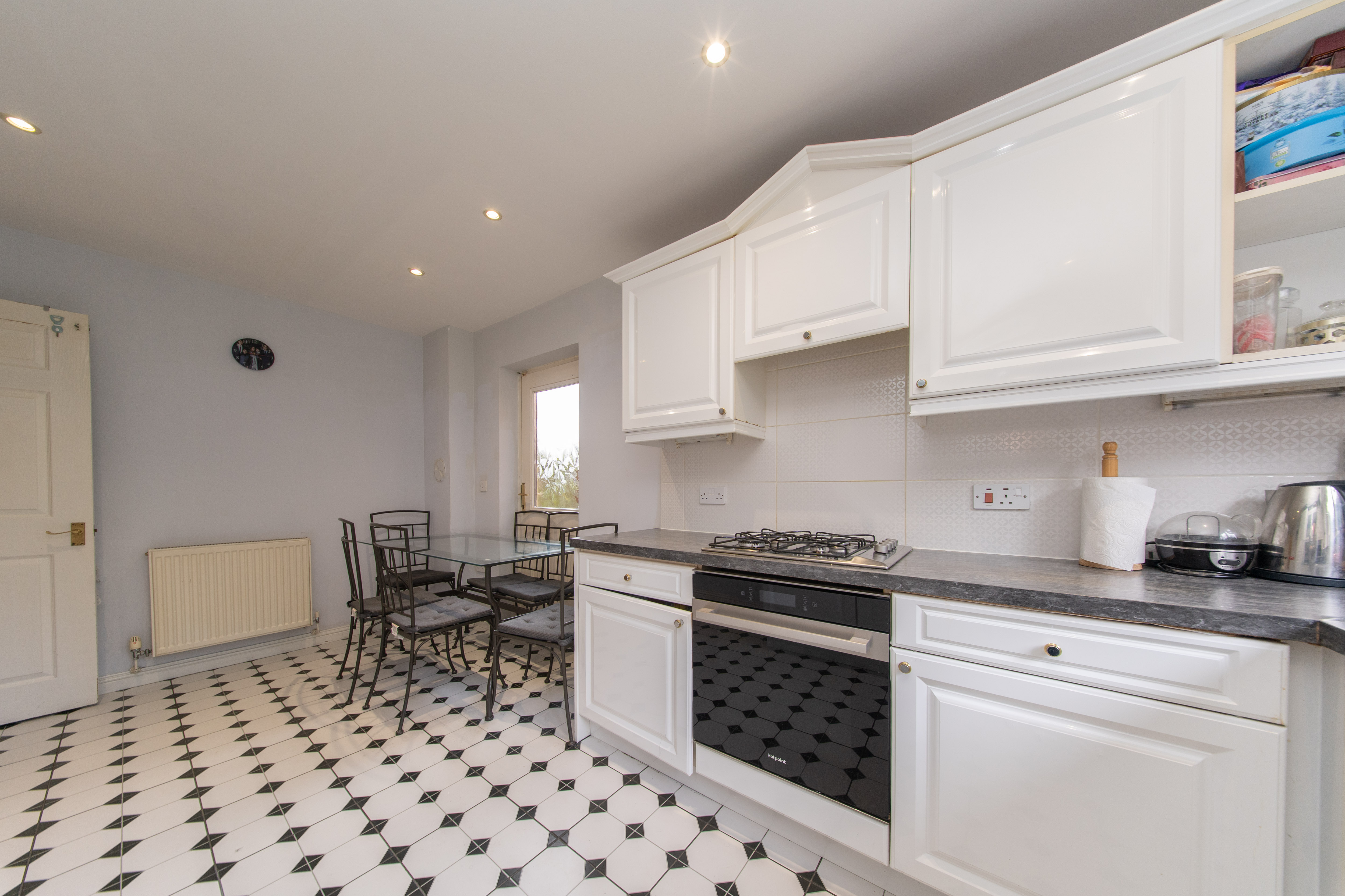 This well designed spacious kitchen features ample wall and base units, gas hob, electric oven, extractor fan, stainless steel sink with mixer tap, dining table with seating for six and a door leading out to the side of the property.