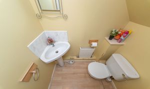 The convenient downstairs WC has wooden flooring, neutral decor, a basin with tap, splashback wall tiles and toilet.